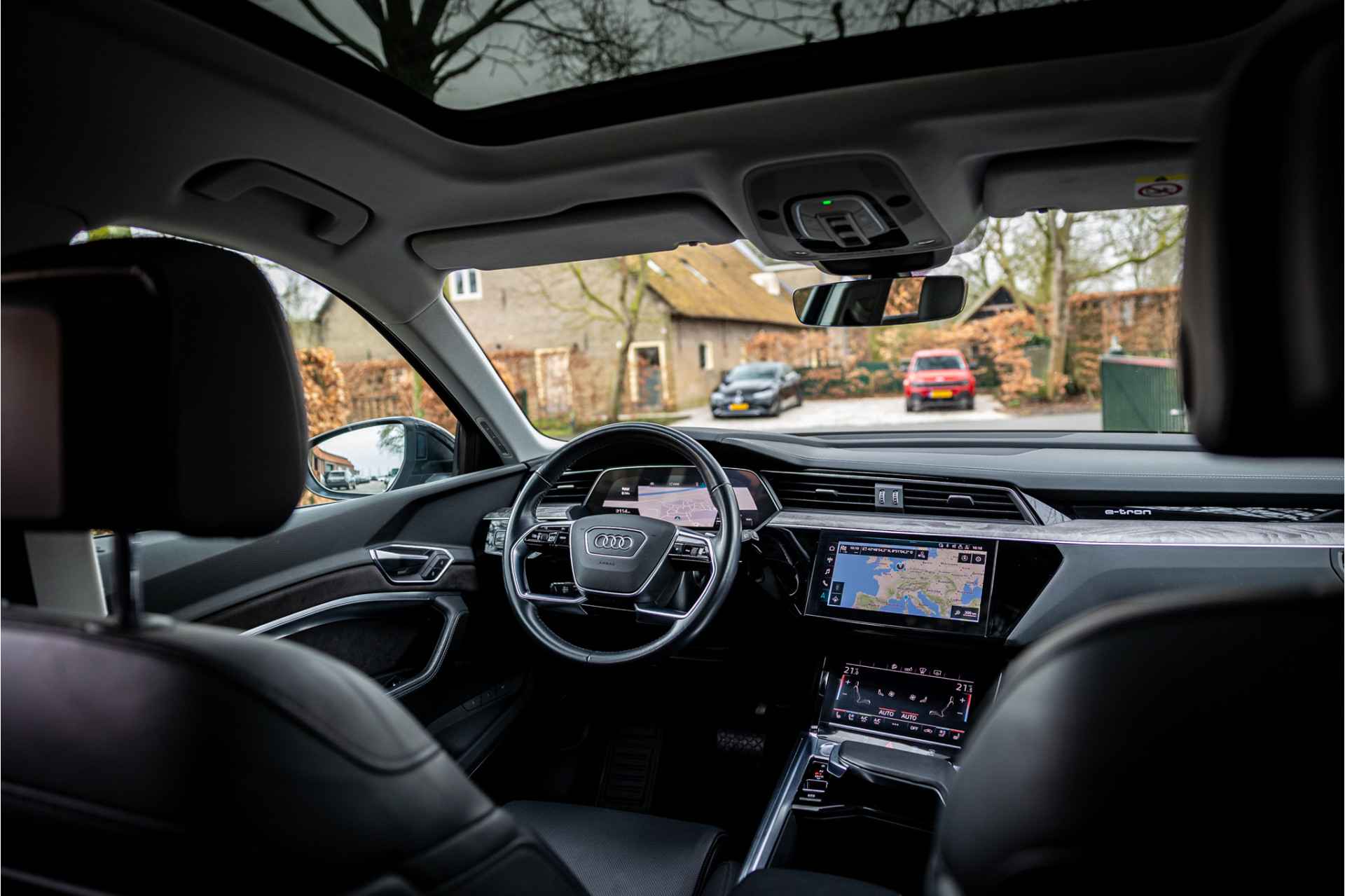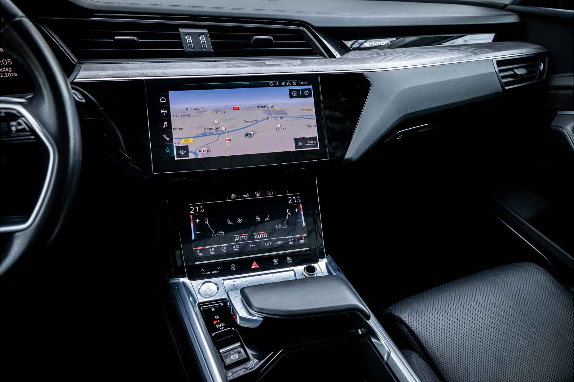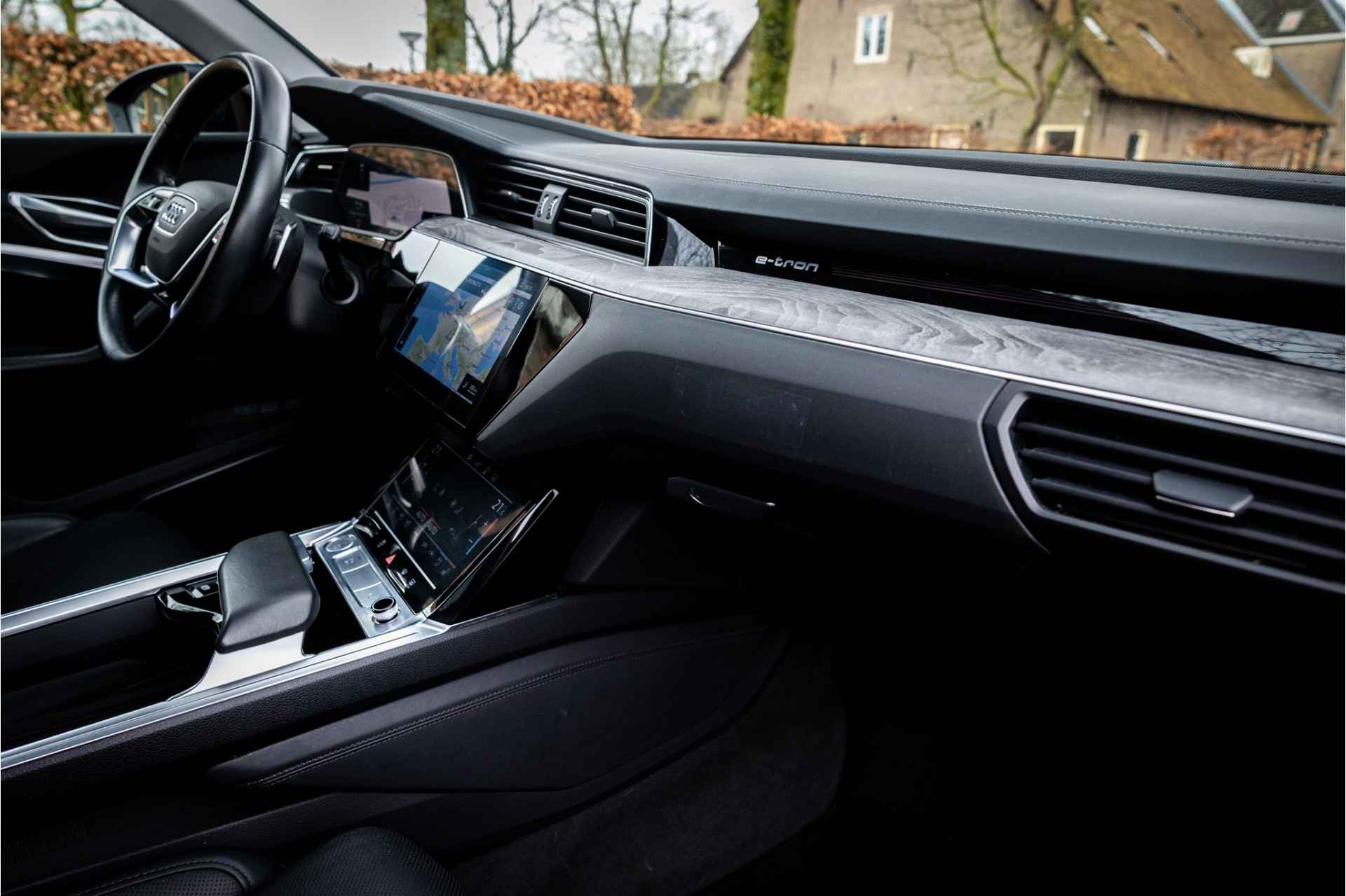 Fraaie en compleet uitgevoerde Audi E-Tron 55 Quattro S Pro Line Plus. Deze auto is in keurige staat en ruim voorzien van opties. Lakkleur is Mythosschwarz Metallic en het interieur is voorzien van individuele contourstoelen bekleed met zwart Valcona leder. De hemelbekleding is uitgevoerd in donker antraciet. Het dashboard en de middenconsole zijn voorzien van een lederovertrek.