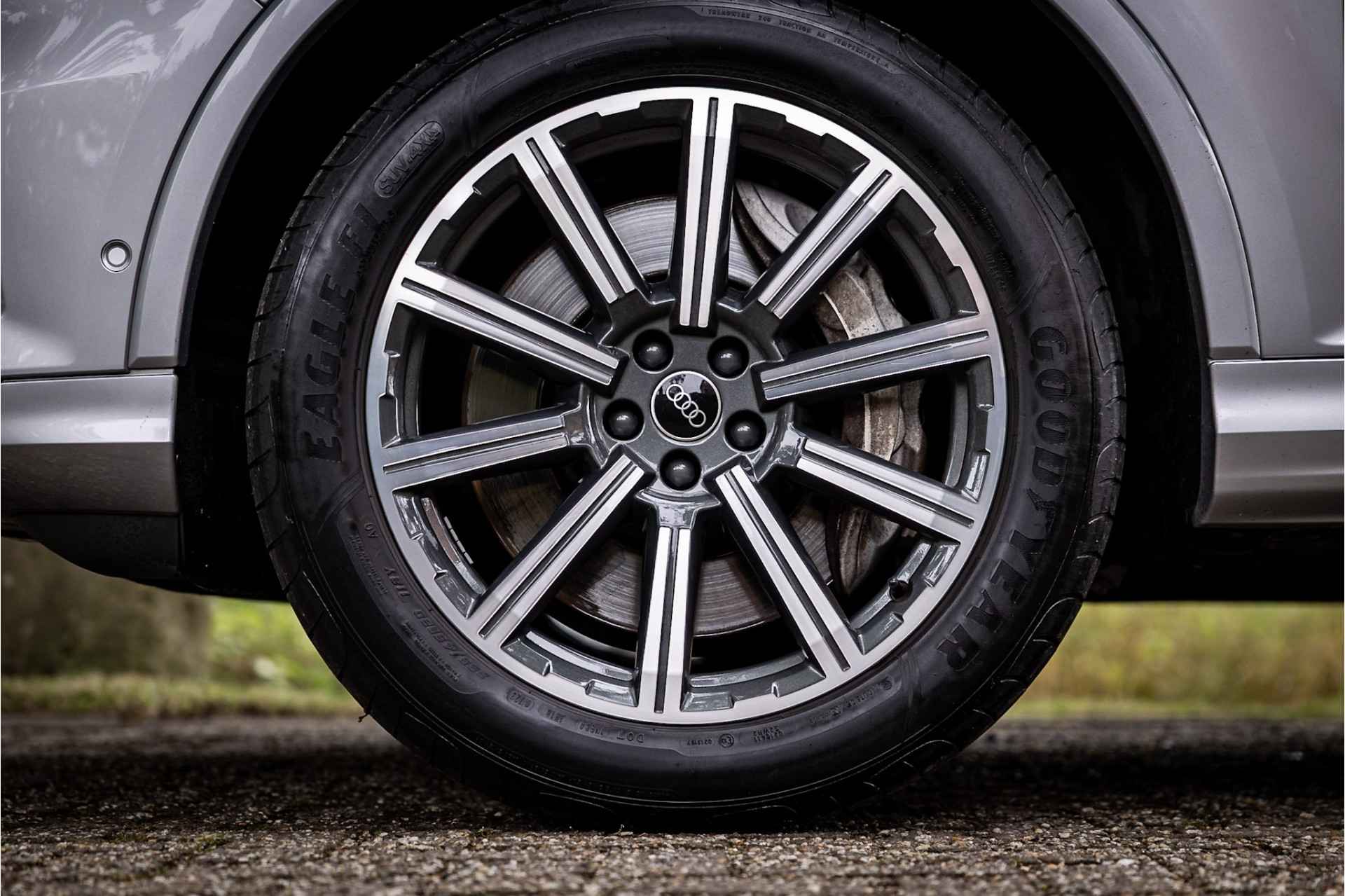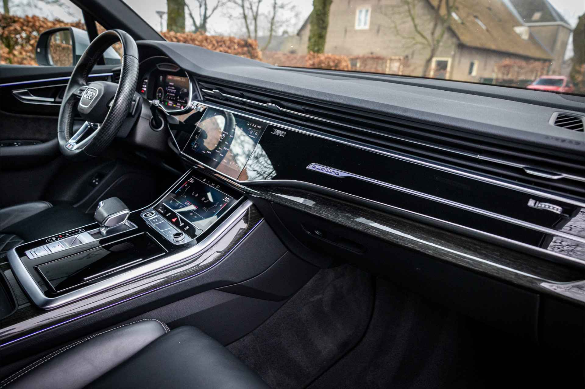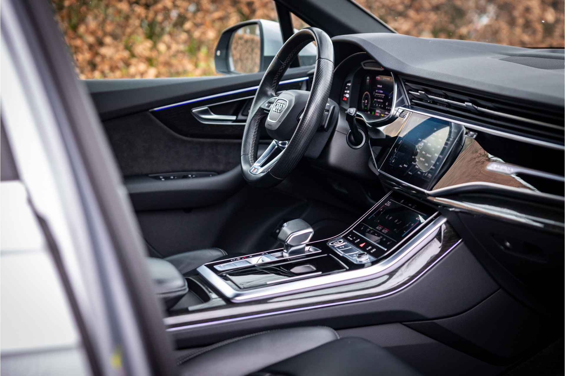 Fraai uitgevoerde Audi Q7 55 TFSI e met veel opties in S Line Sport uitvoering. Lakkleur is Florettsilber Metallic en het interieur is voorzien van S Sportstoelen bekleed met zwart leder. De hemelbekleding is afgewerkt in zwart stof.