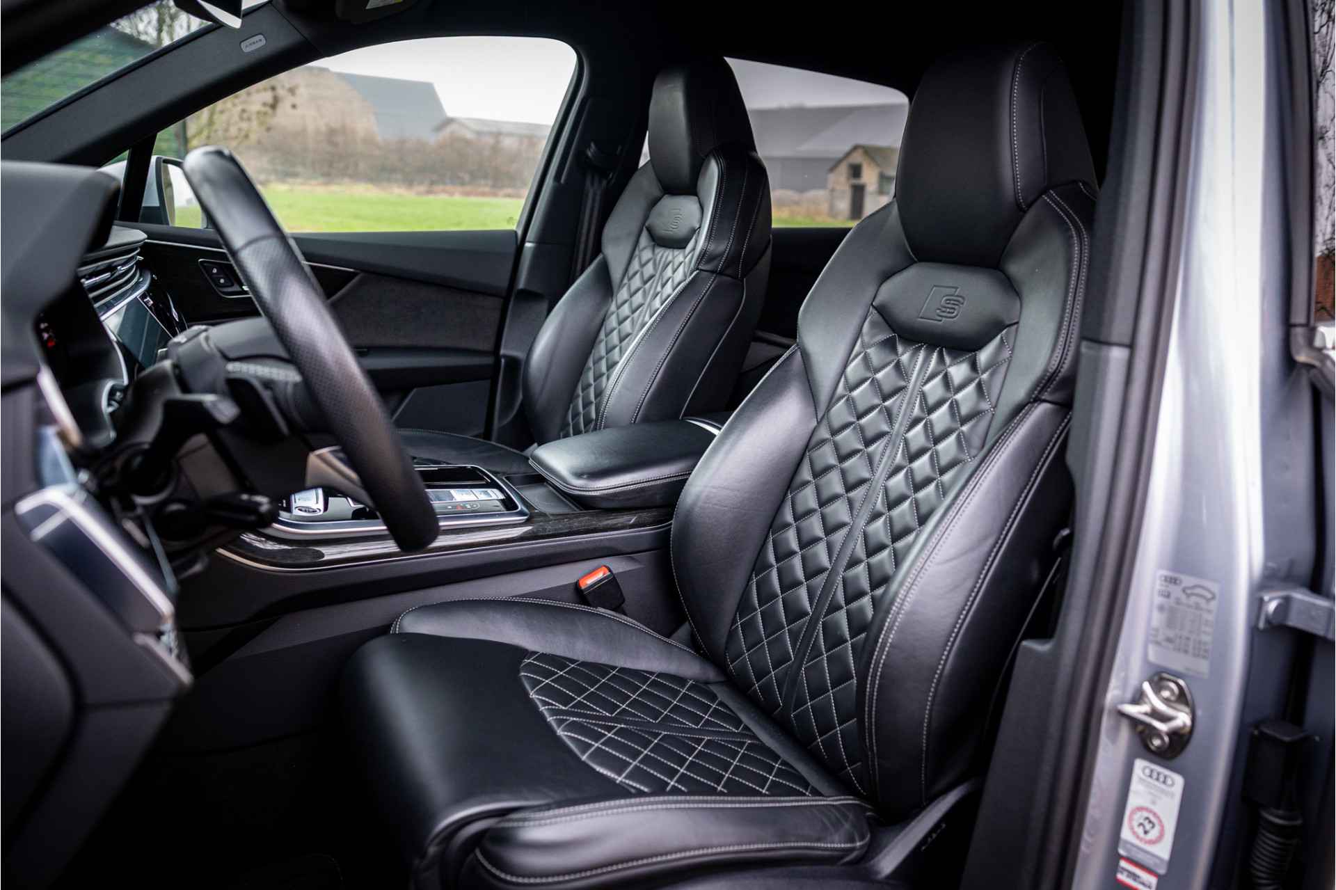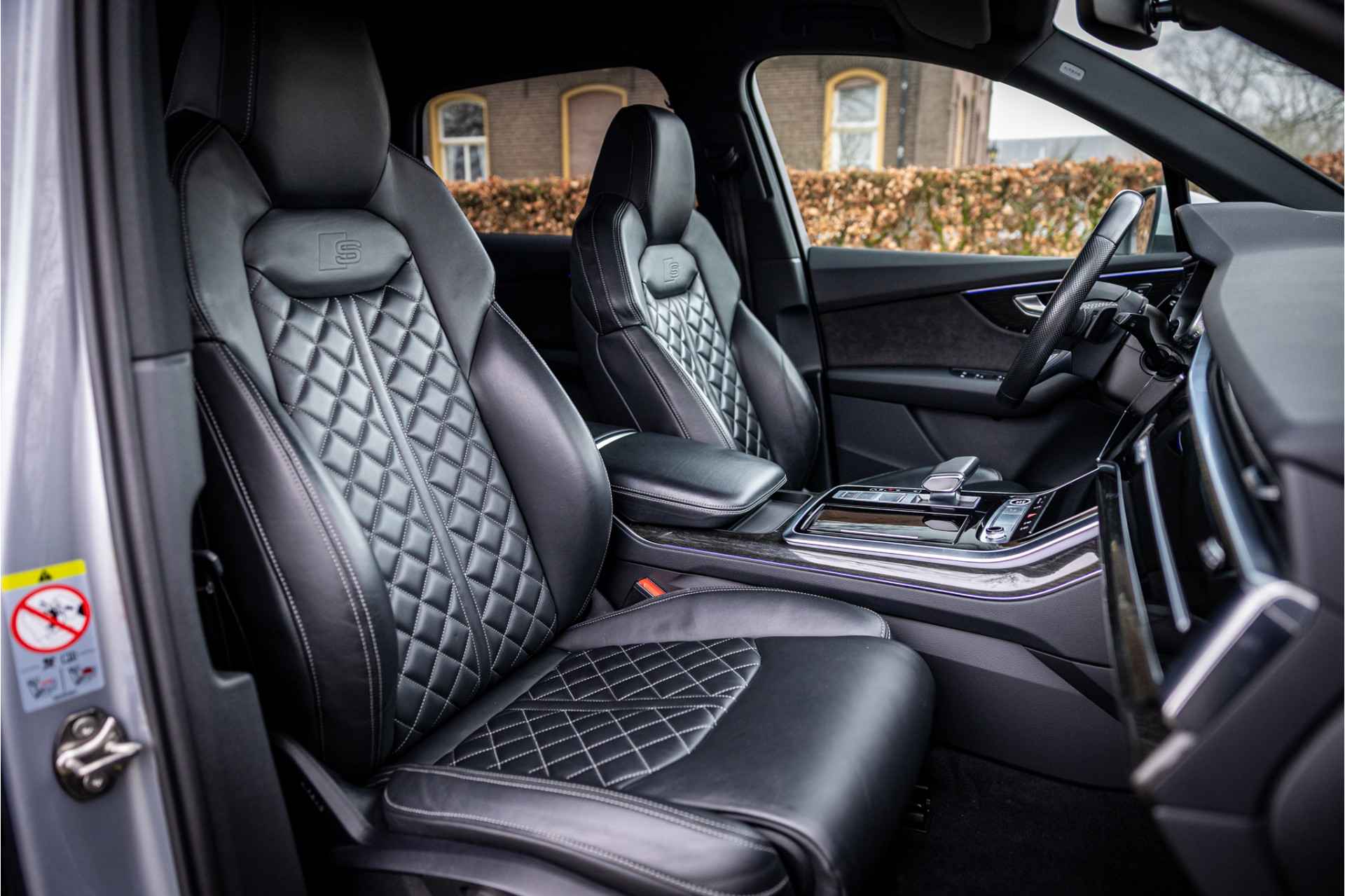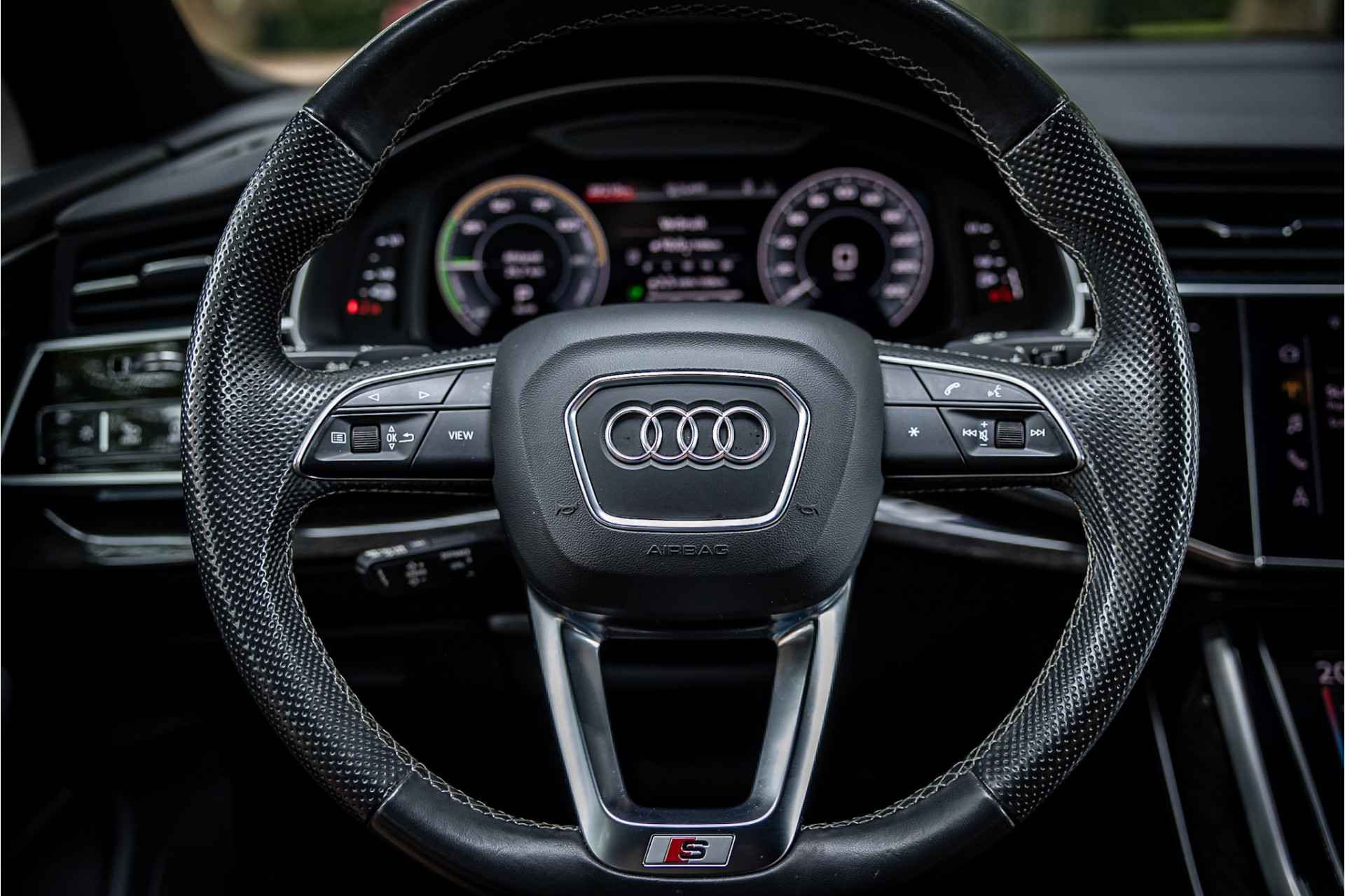 Fraai uitgevoerde Audi Q7 55 TFSI e met veel opties in S Line Sport uitvoering. Lakkleur is Florettsilber Metallic en het interieur is voorzien van S Sportstoelen bekleed met zwart leder. De hemelbekleding is afgewerkt in zwart stof.
