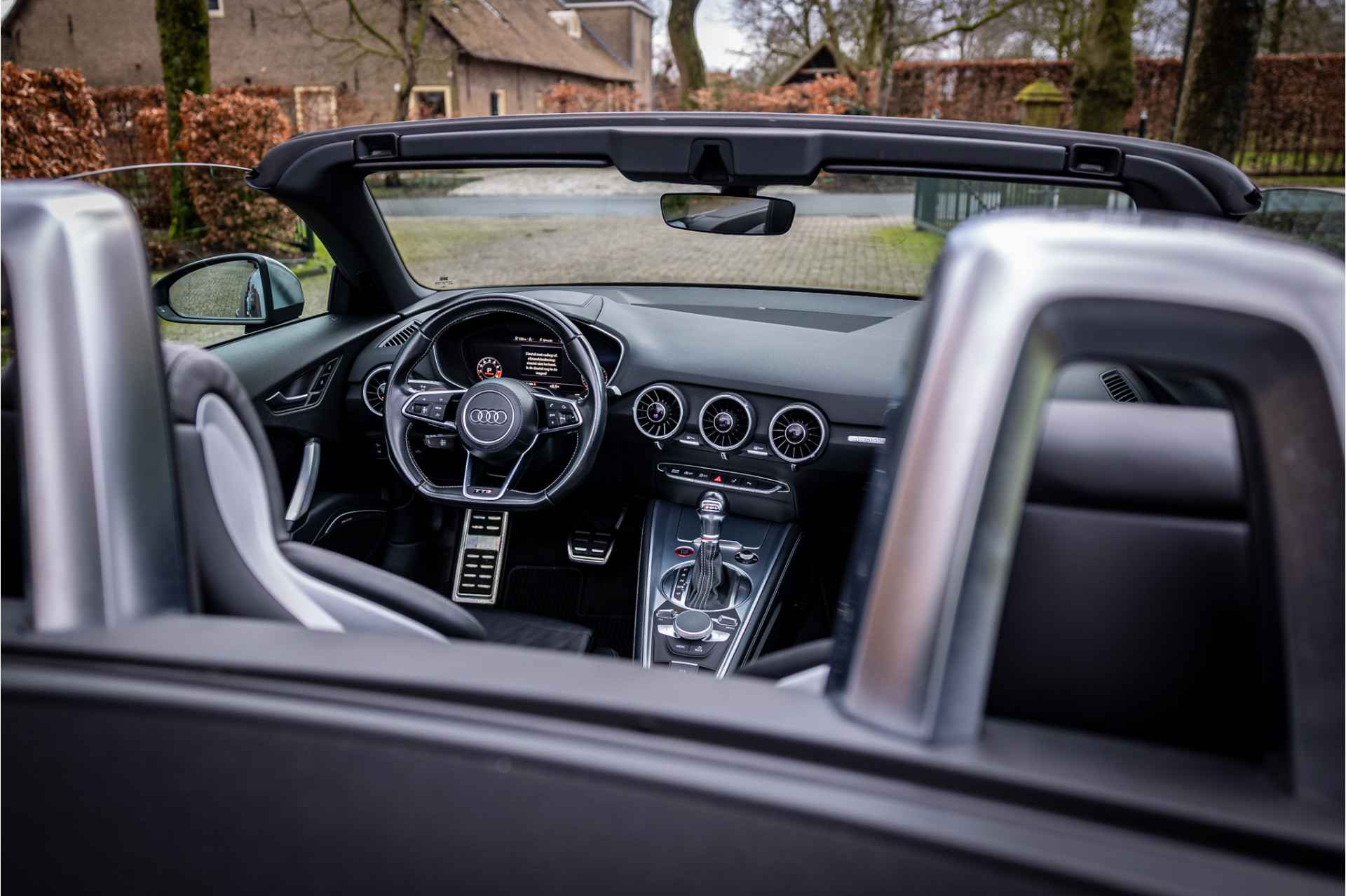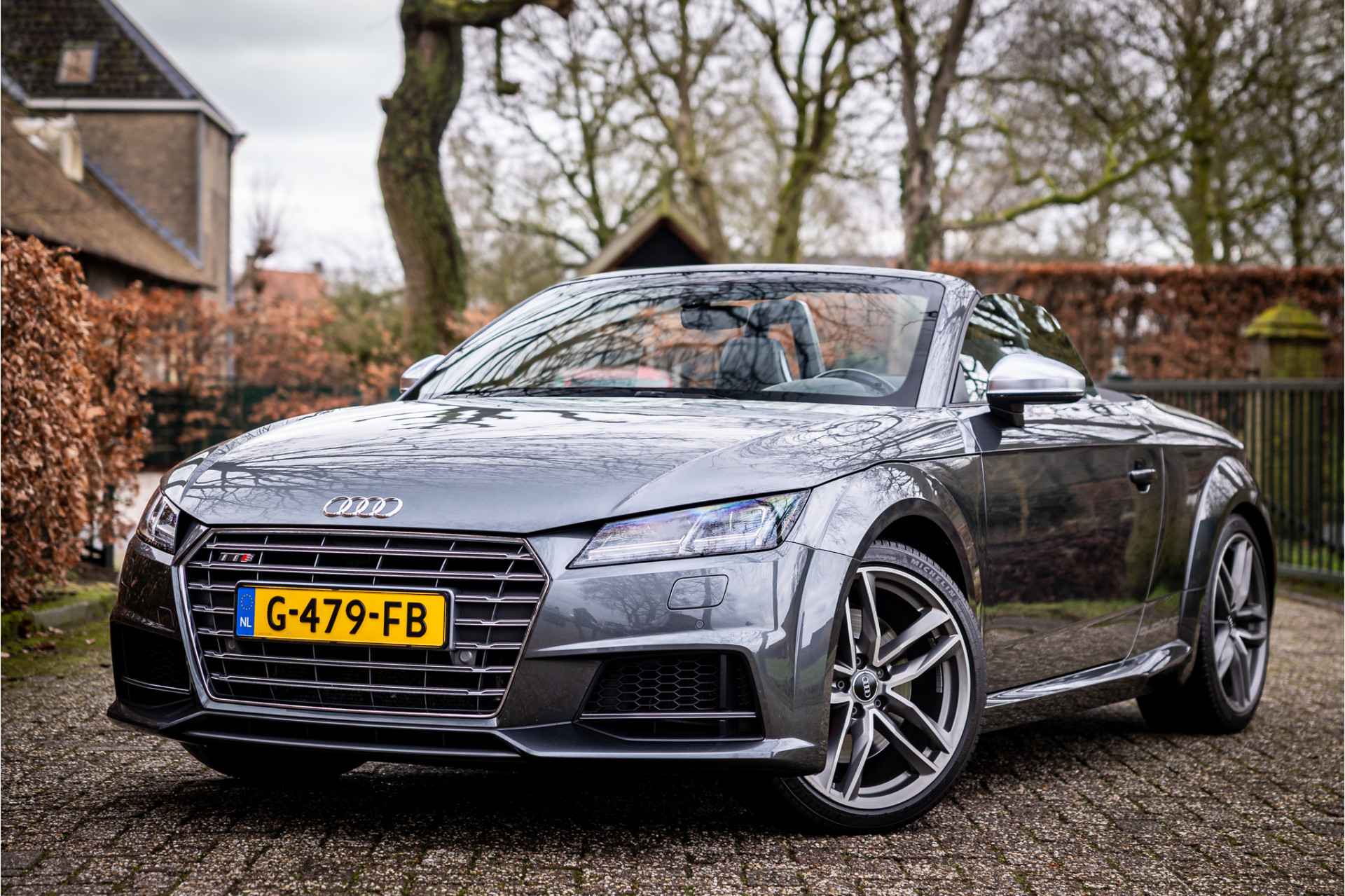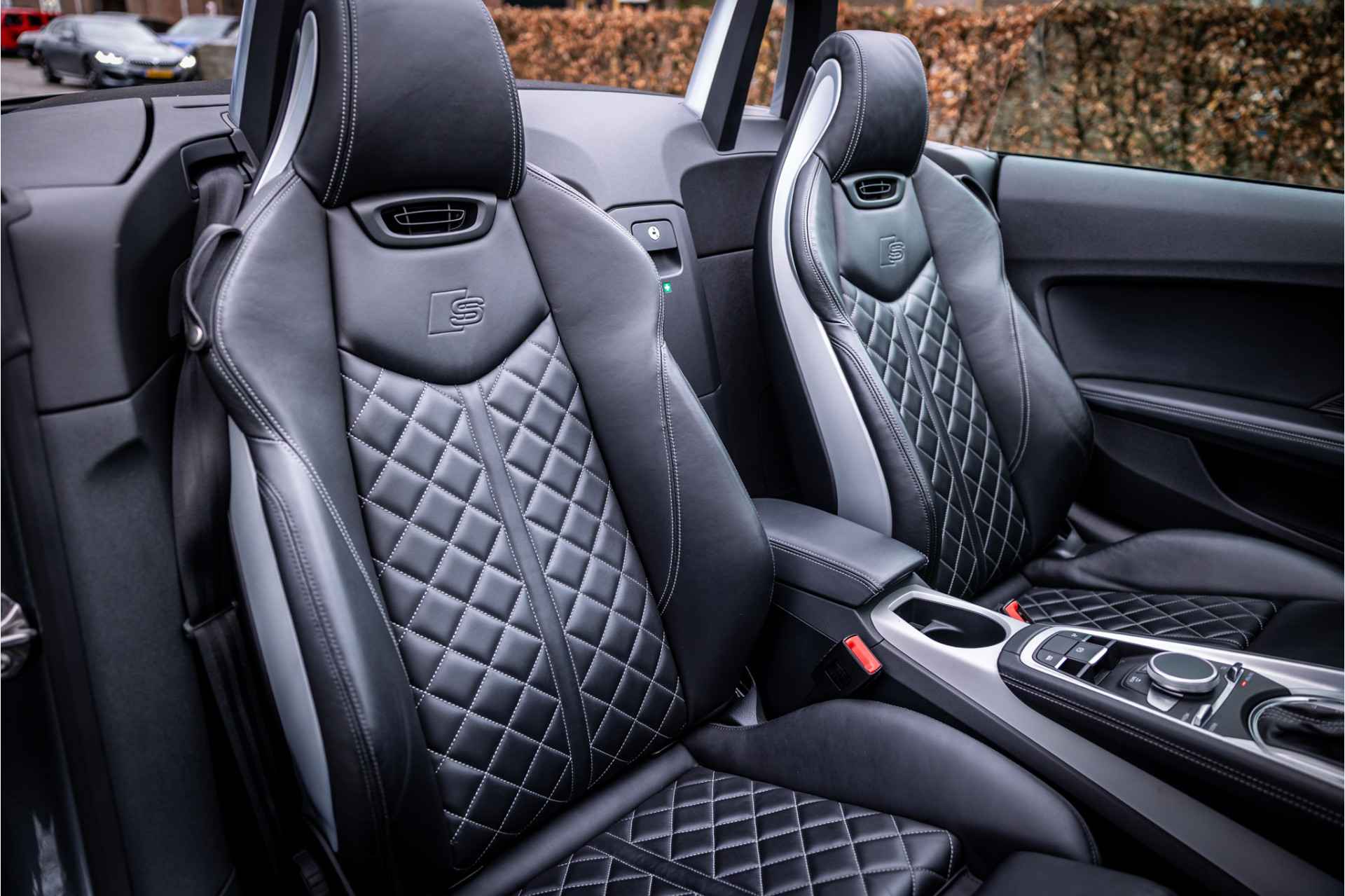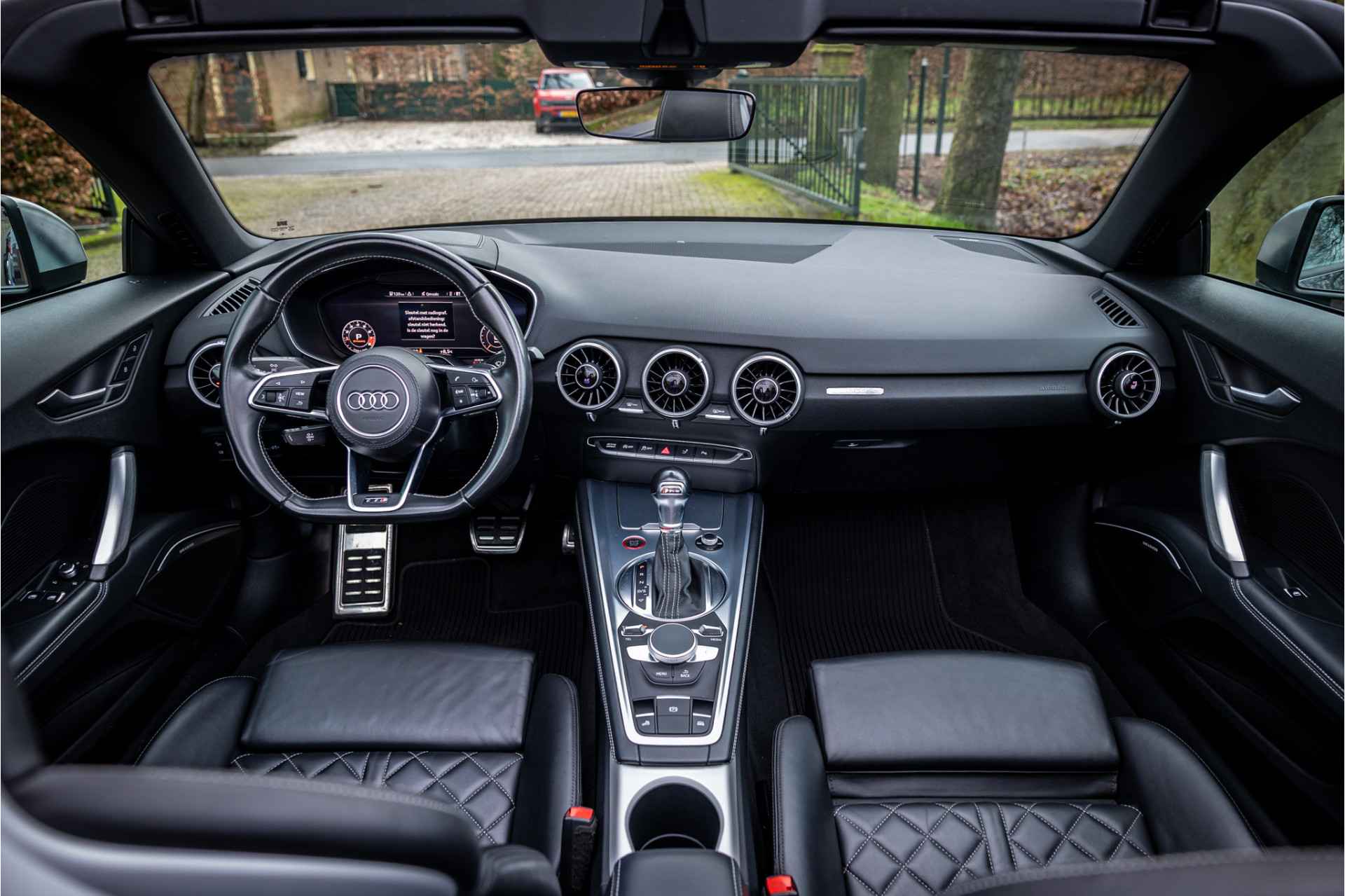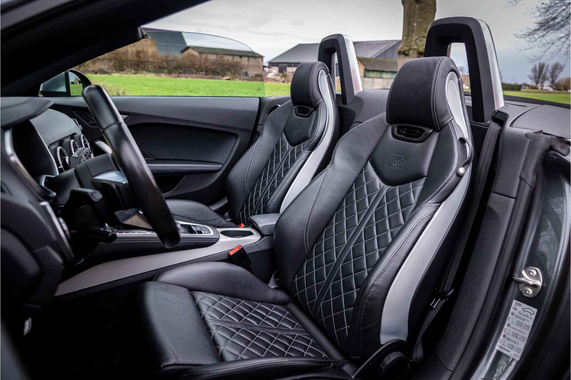 Fraaie Audi TTS Roadster Quattro in keurige conditie en rijke uitrusting aan opties. Nieuwwaarde van deze auto is 92.000 euro. Lakkleur van deze TTS is Daytonagrijs Pareleffect, het interieur is voorzien van S sportstoelen bekleed met leder en afgestikt in diamond stitching. De hemelbekleding is uitgevoerd in donker antraciet. Het interieur is voorzien van een uitgebreid lederpakket waarbij ook de middenconsole met leder is afgewerkt.