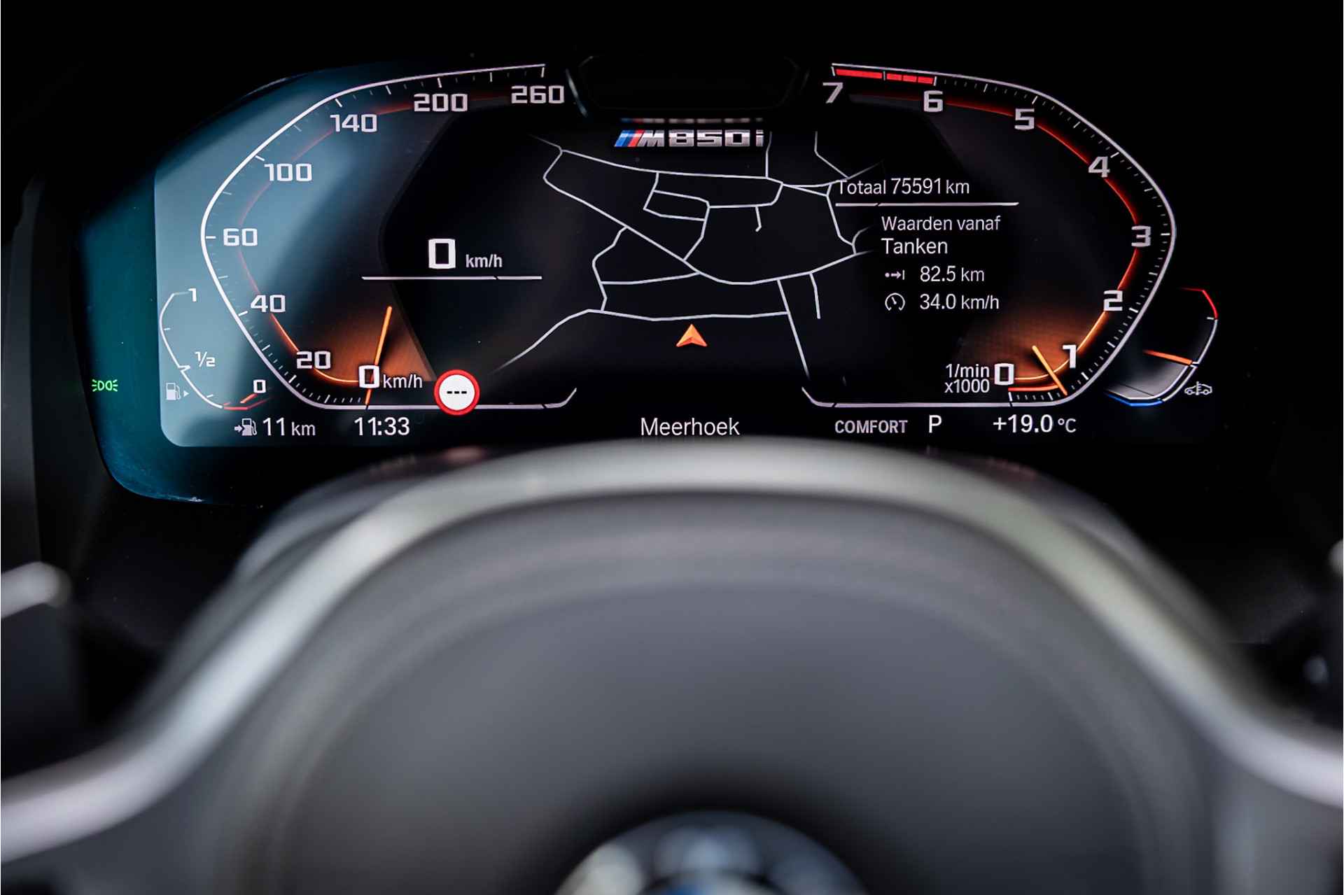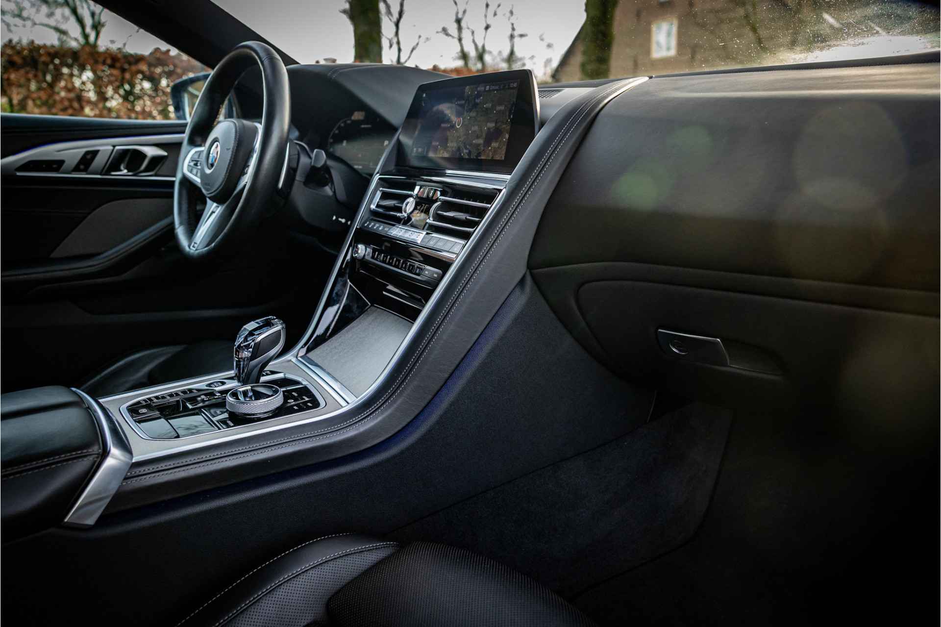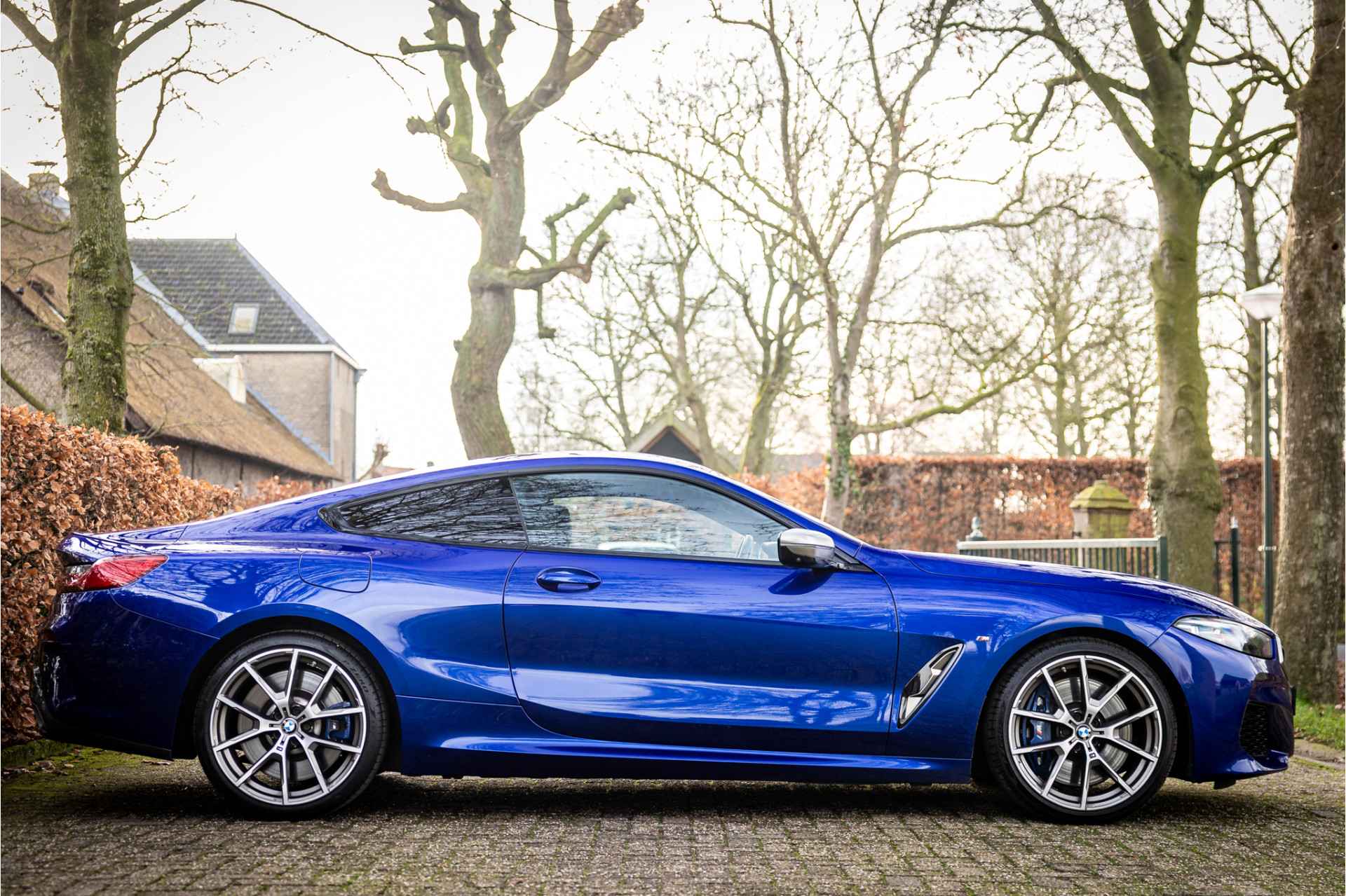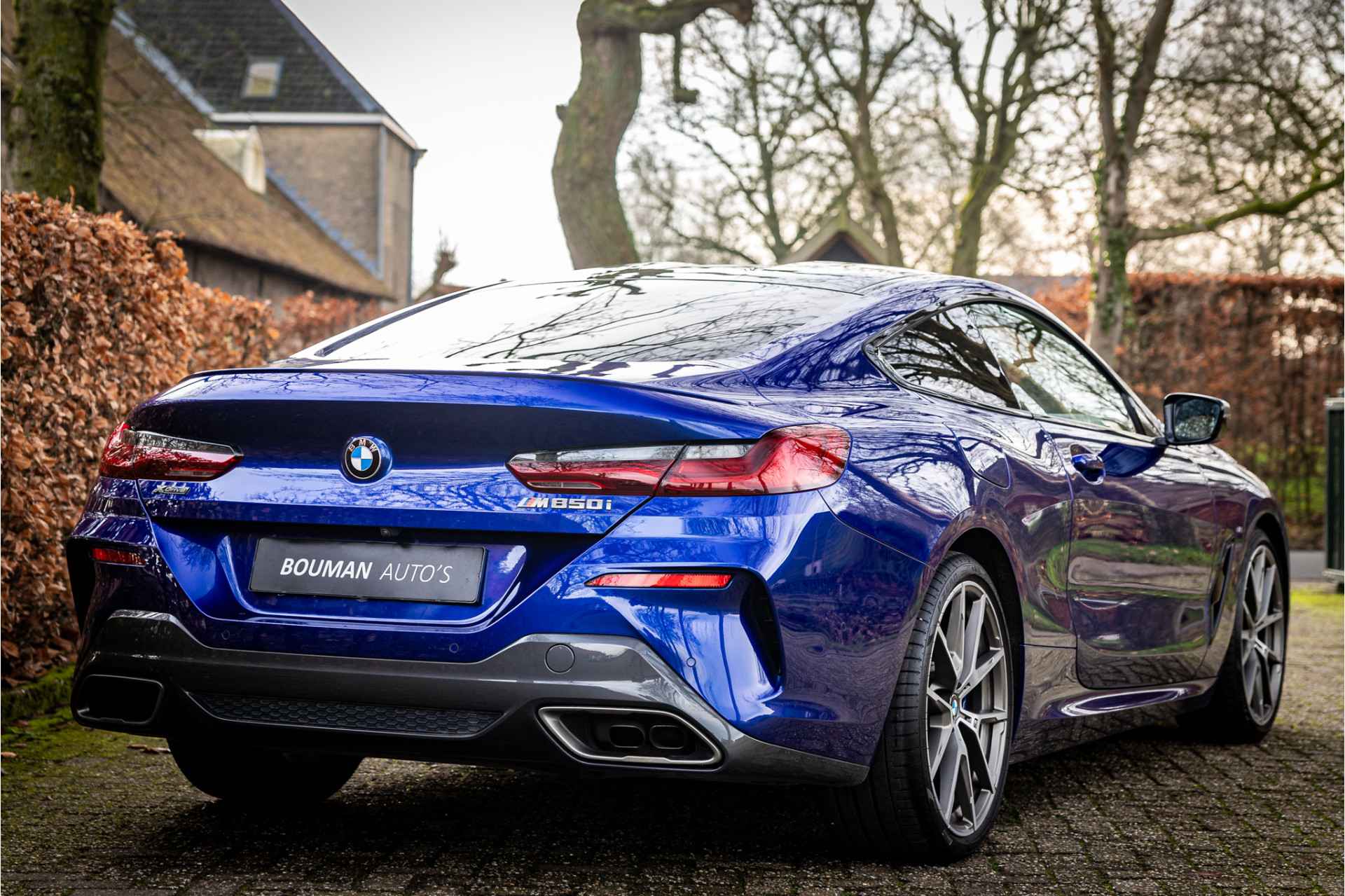 Fraai uitgevoerde BMW M850i Coupe met een Individual kleurstelling en zeer uitgebreide optielijst. Deze auto is nieuw in Duitsland geleverd en volledig dealer onderhouden. Nieuwwaarde bedraagt circa 190.000 euro. De Individual lakkleur San Marino Blau en het Merino Schwarz leder interieur zijn een stijlvolle kleurencombinatie. Het dashboard en de portieren zijn voorzien van een zwarte lederovertrek.