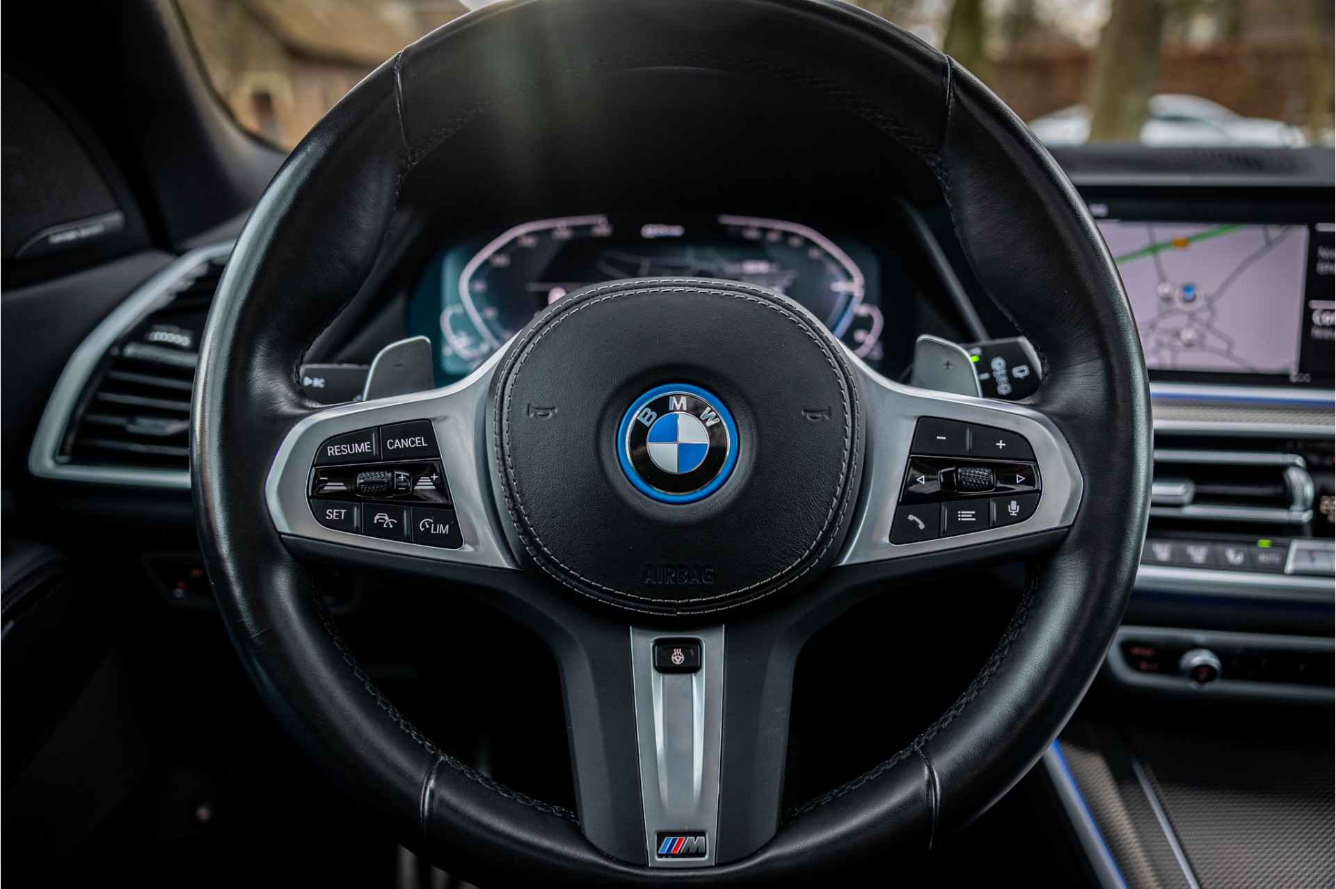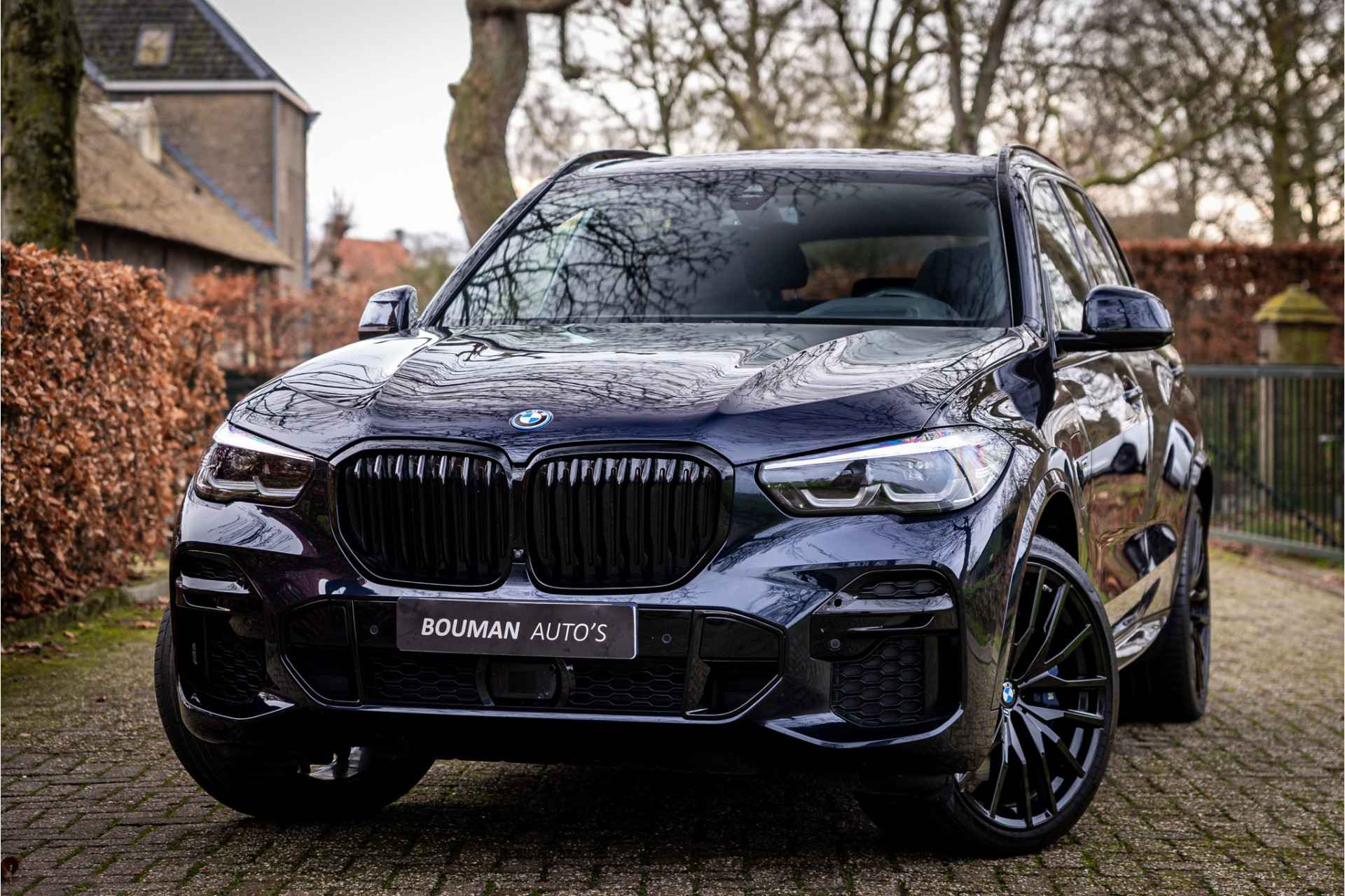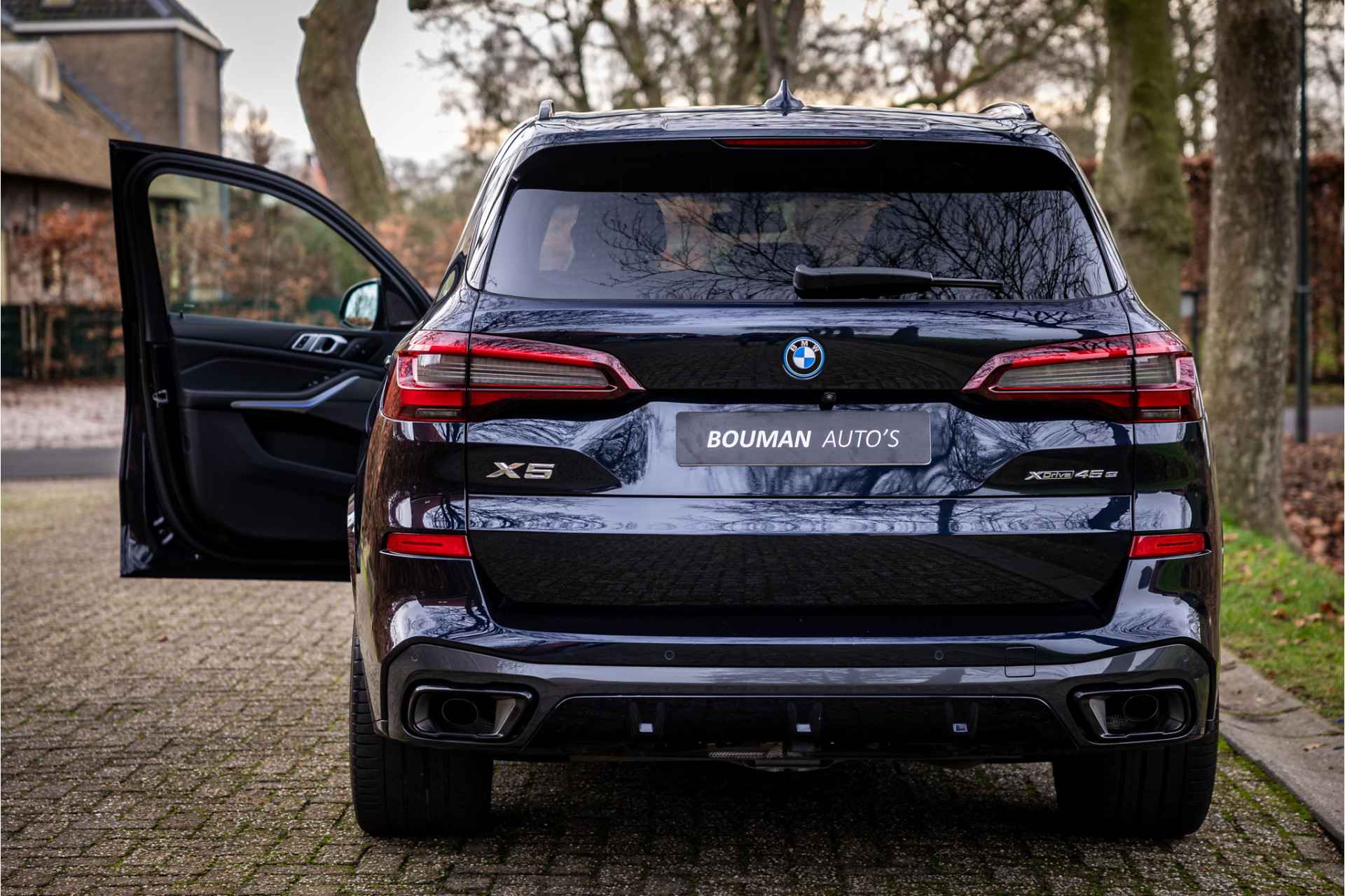 Fraai uitgevoerde BMW X5 45e M Sport met een uitgebreide optielijst. Deze auto is afkomstig van de eerste eigenaar en volledig dealer onderhouden. De lakkleur Carbonschwarz Metallic en het Individual zwart leder interieur zijn een stijlvolle kleurencombinatie. Als onderdeel van het Individual volledig leder pakket zijn de middenconsole, dashboardkastje, bovenzijde dashboard en de portieren zijn voorzien van een zwarte lederovertrek. Het shadowline pakket versterkt de dynamische uitstraling van deze X5.