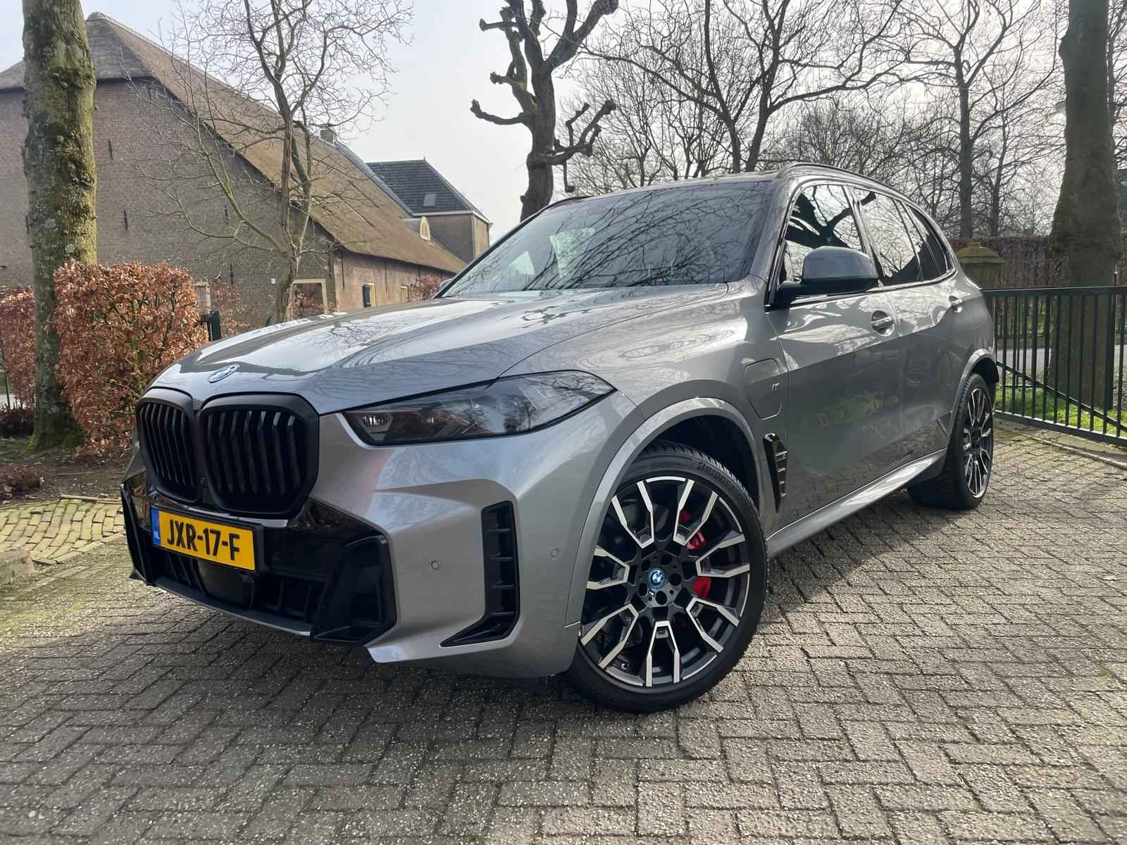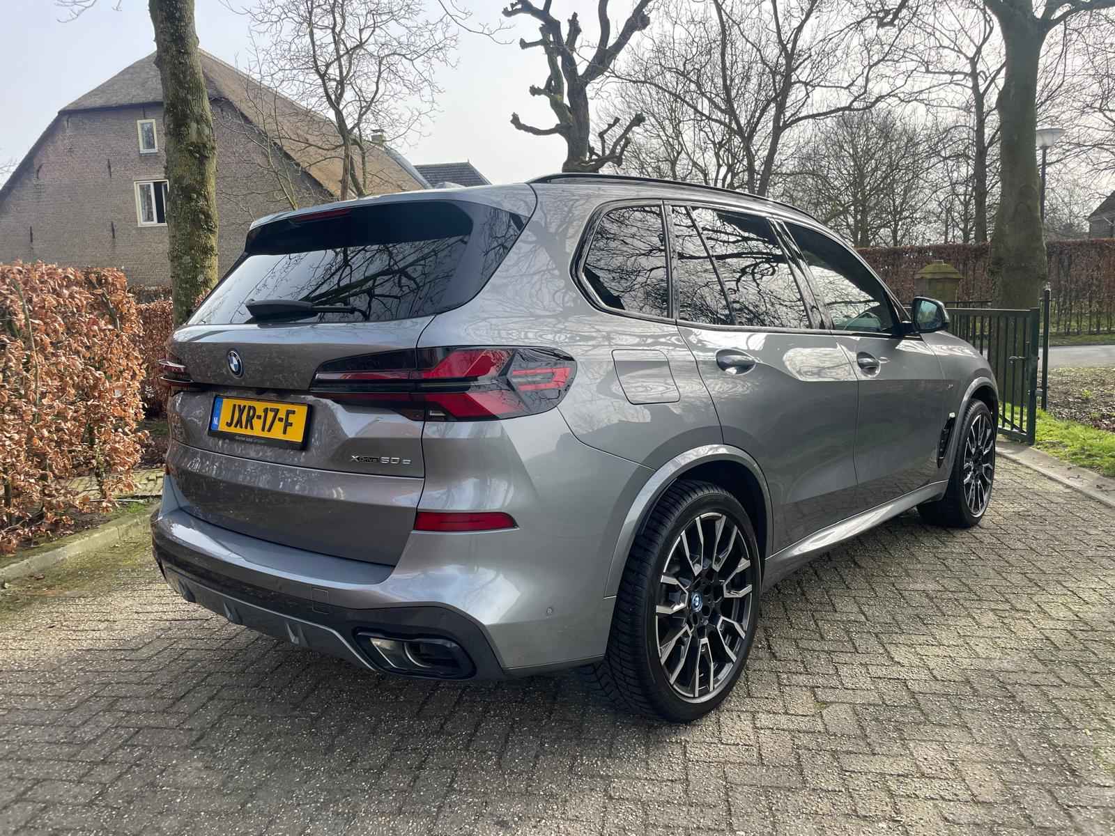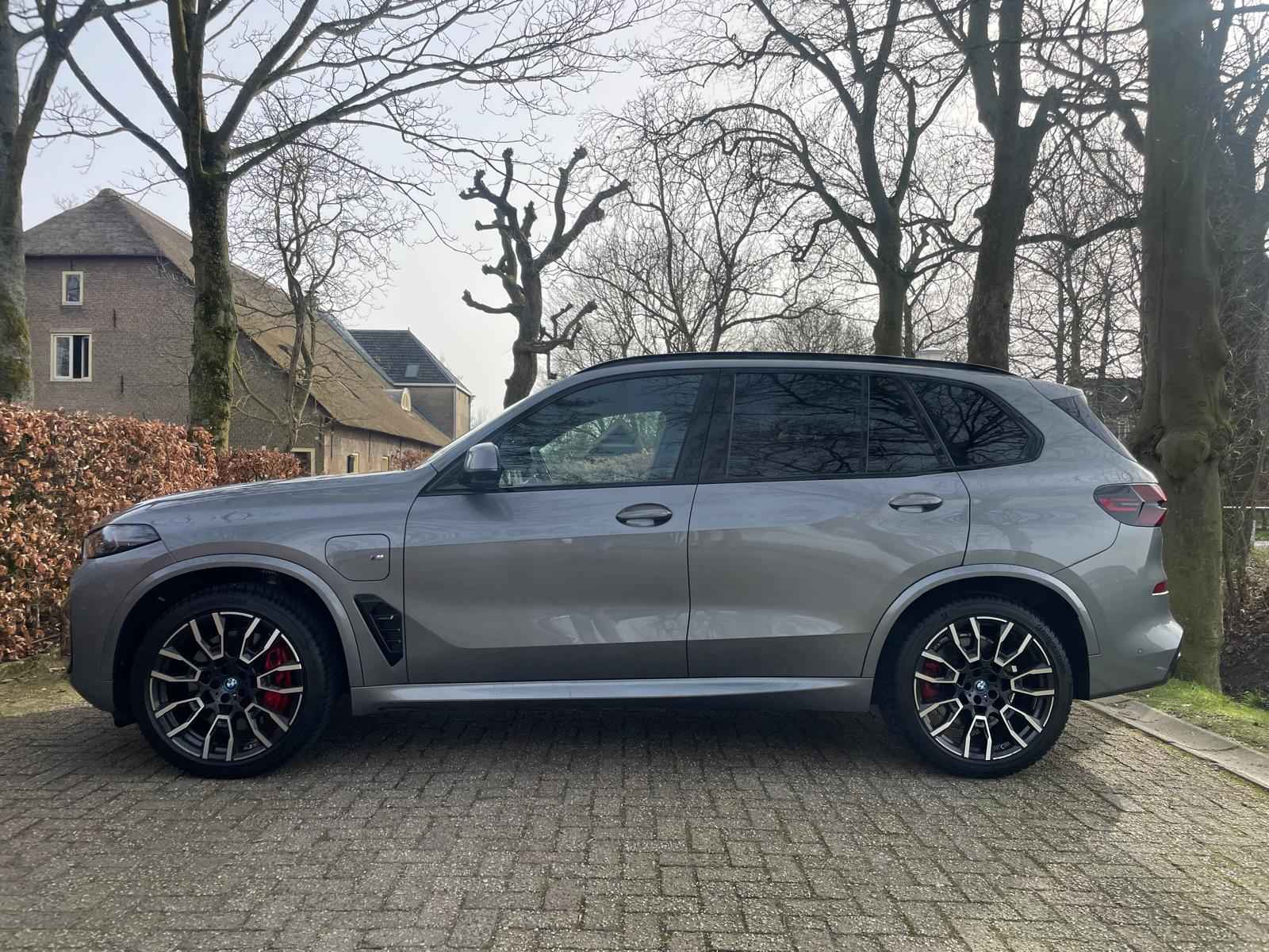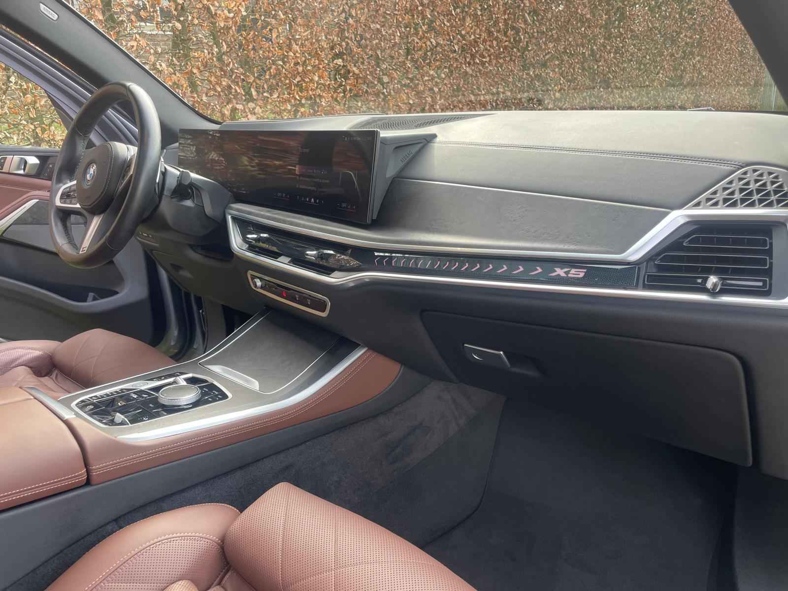 Fraai uitgevoerde BMW X5 50e M Sport Pro in een stijlvolle configuratie en bomvol opties. Lakkleur is Skyscraper Grau metallic en het Coffee leder interieur geeft een warme beleving in het interieur. Het dashboard en de portieren zijn voorzien van een lederovertrek. De interieurhemel is voorzien van antraciet stof. Het shadowline pakket versterkt de dynamische uitstraling van deze X5.