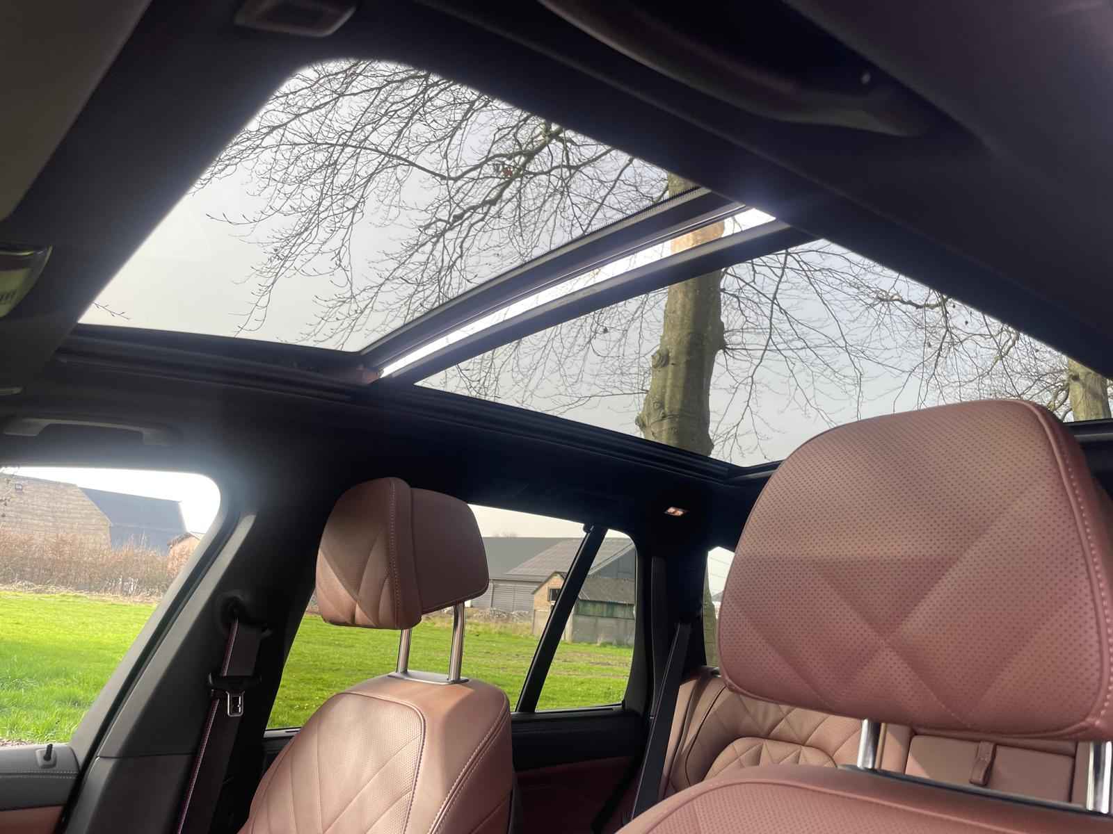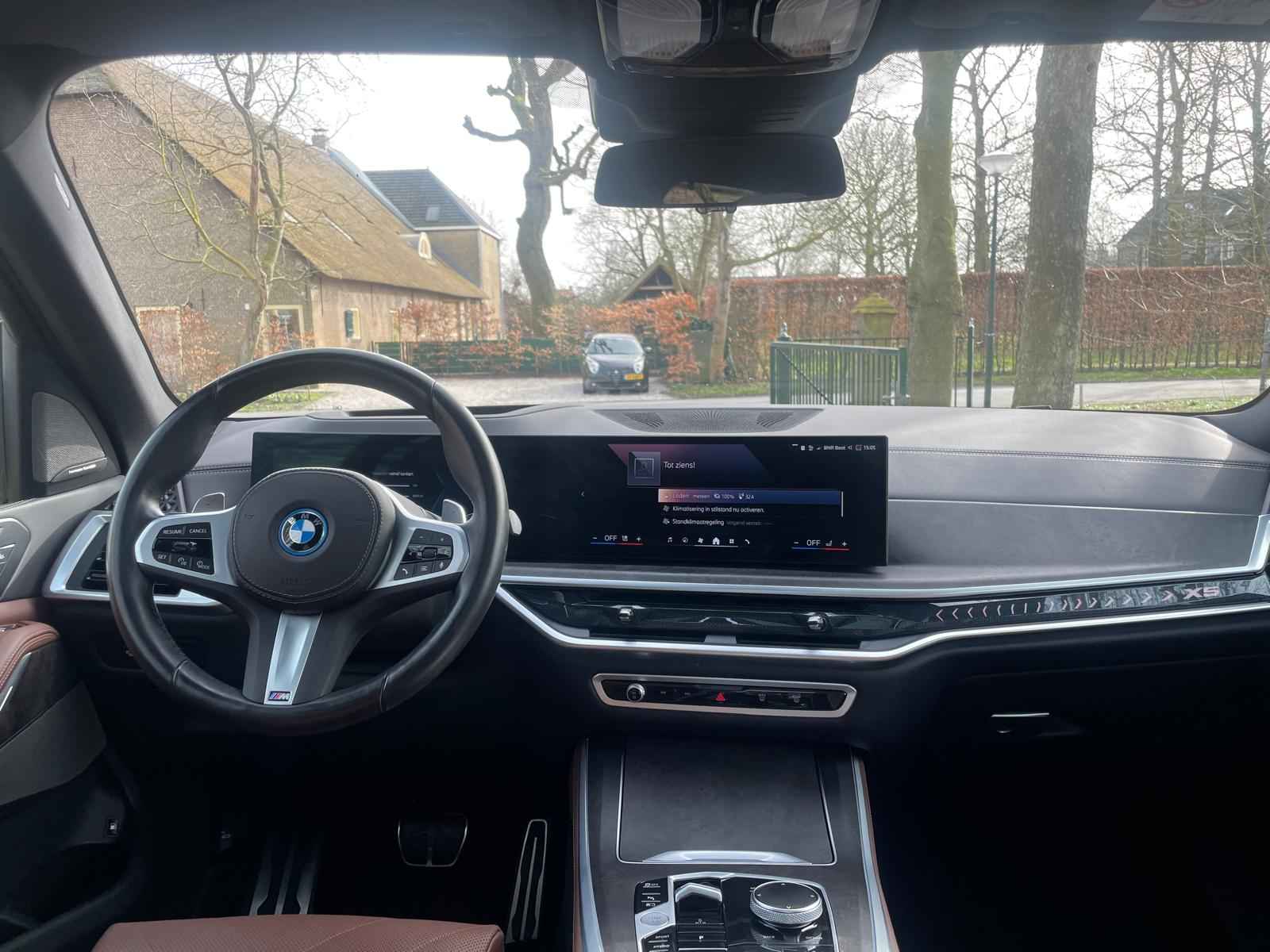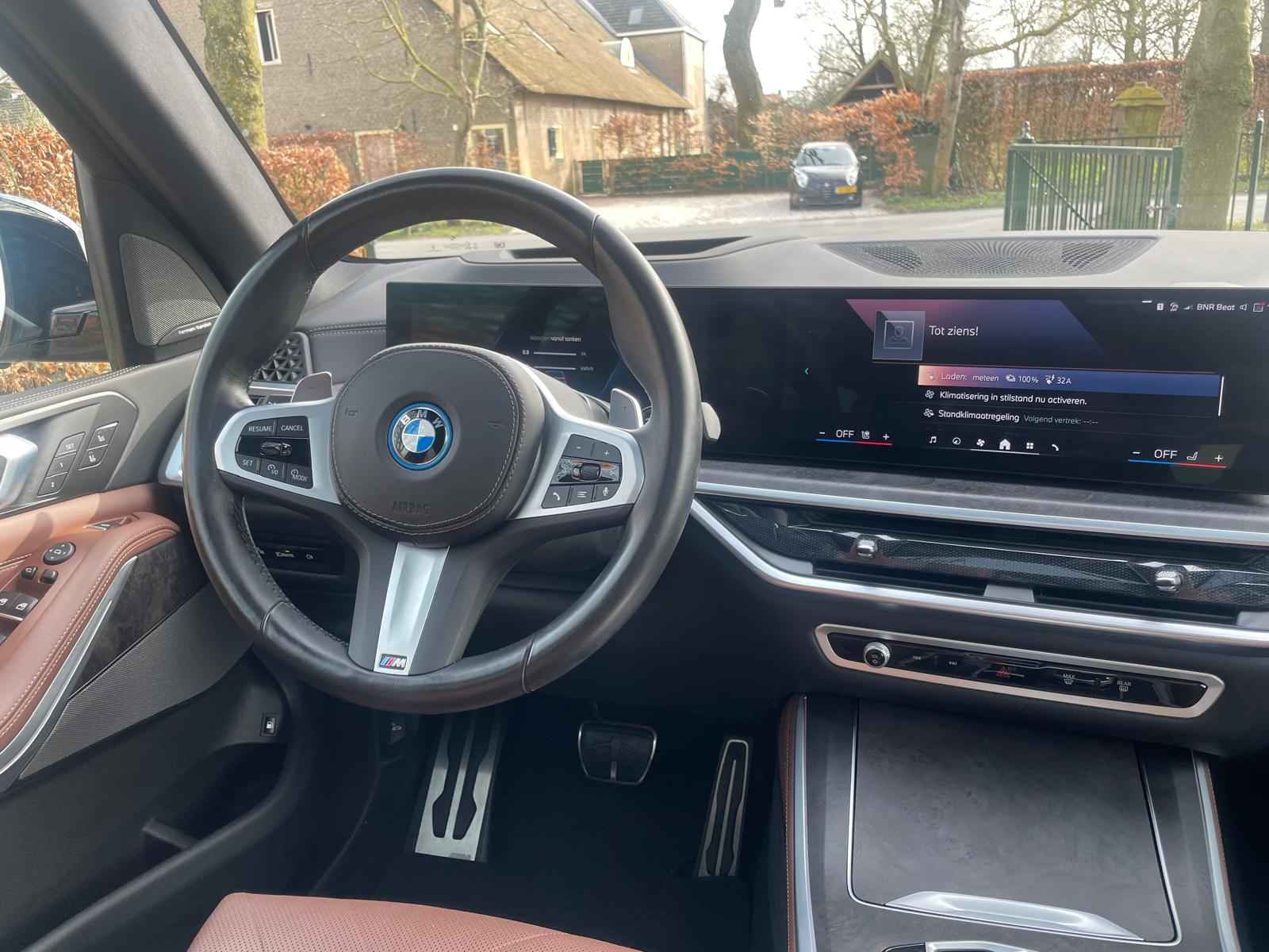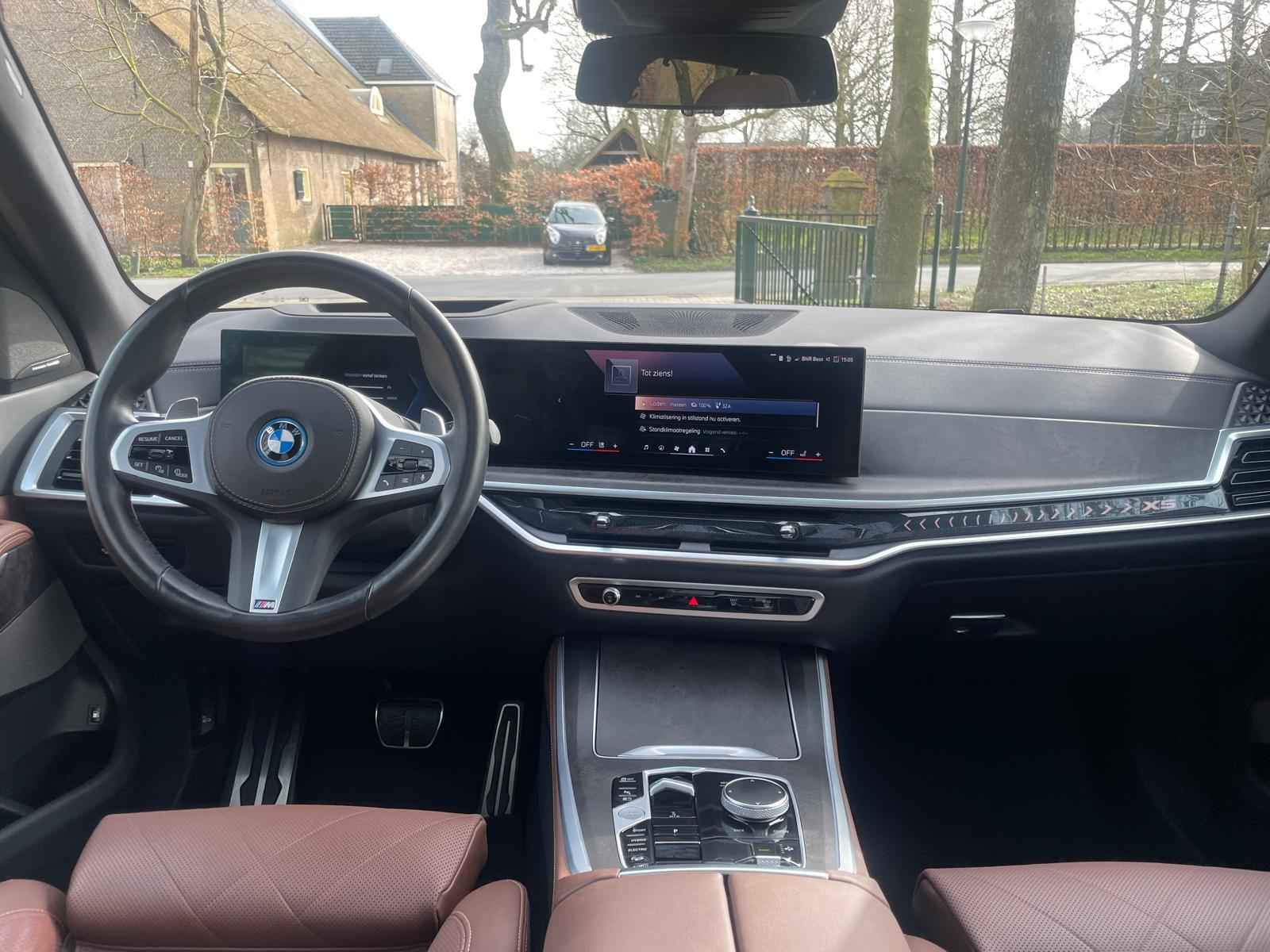 Tot de verdere uitrusting behoort massagefunctie op de voorstoelen, soft close portieren, 22" dubbelspaak 915 M velg, stoelventilatie op voorstoelen, ambient air pakket met automatische parfumering, verwarmbare / koelbare bekerhouders, Harman Kardon surround audio, head up display, 4 gescheiden zone klimaatregeling, elektrisch wegklapbare trekhaak, Iconic Glow verlichte grille, akoestisch geluidsisolerend glas, luchtvering met niveauregeling, comfort access (keyless entry), LED koplampen met adaptieve lichtverdeling, 360 graden camera met remote 3D View, BMW Gesture Control, dode hoek assistent, actieve spoorassistent, draadloos laden voor smartphone, achteruitrijcamera, comfortstoelen met memory functie, DAB-tuner, navigatiesysteem Professional en speed limit weergave, uitgebreide bluetooth telefoonvoorbereiding met audiostreaming, verwarmbare voorstoelen, verwarmbare zitplaatsen achter, verwarmbaar stuurwiel, travel pakket met universele aansluiting voor tablets en andere accessoires in achterzijde van voorstoelen, dakdraagsysteem hoogglans shadow line, extra getint glas achter, elektrisch bedienbare achterklep, automatische klimaatregeling met gescheiden zones voor en achter, elektrisch inklapbare buitenspiegels en multimedia aansluitingen.