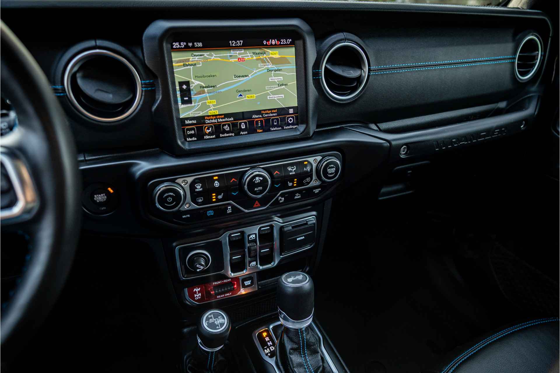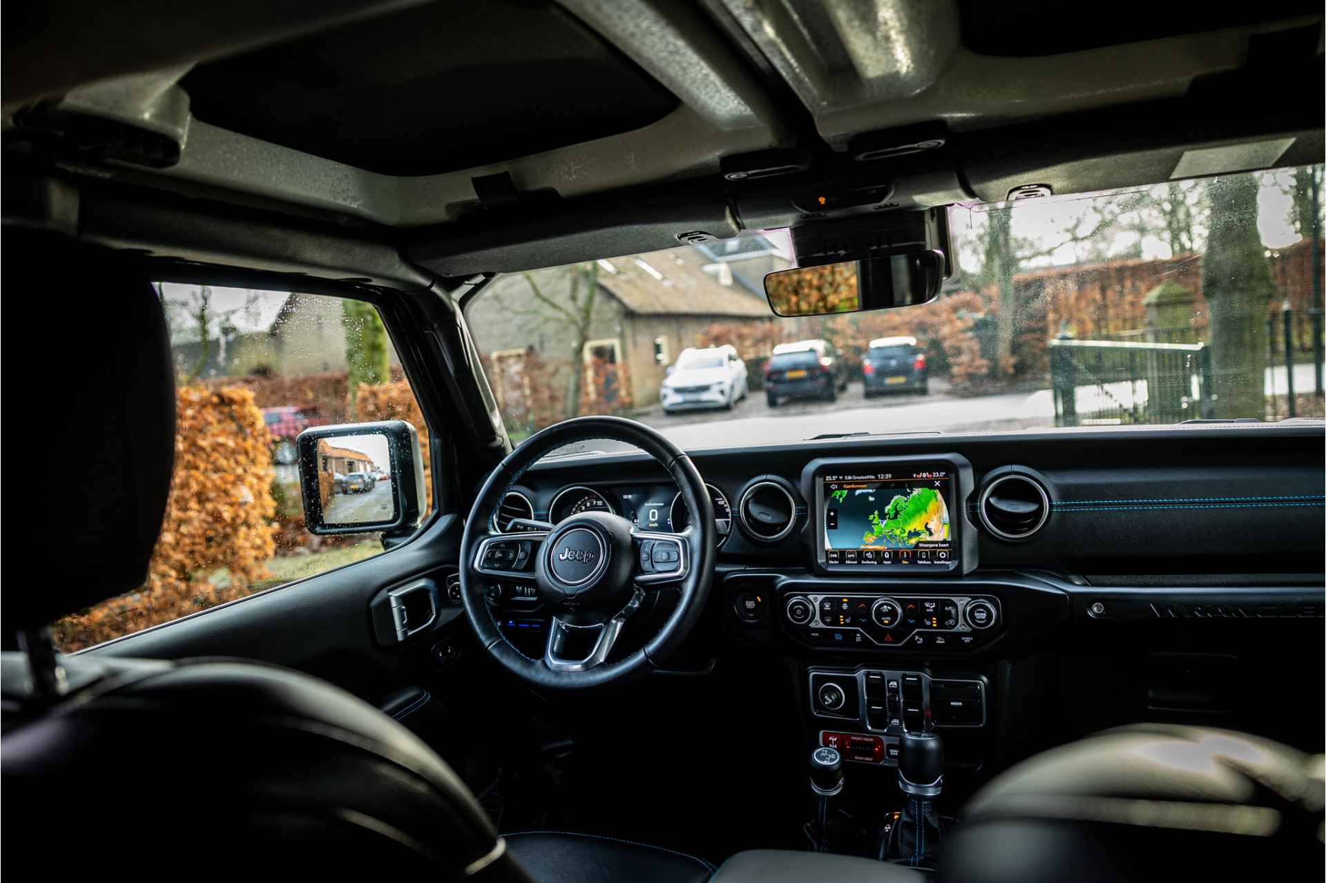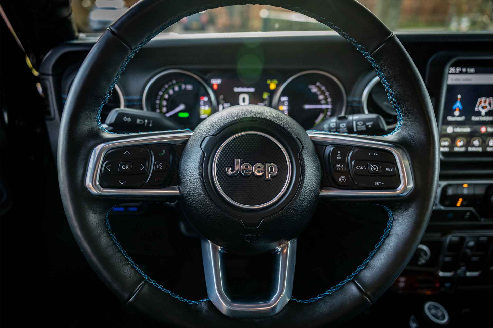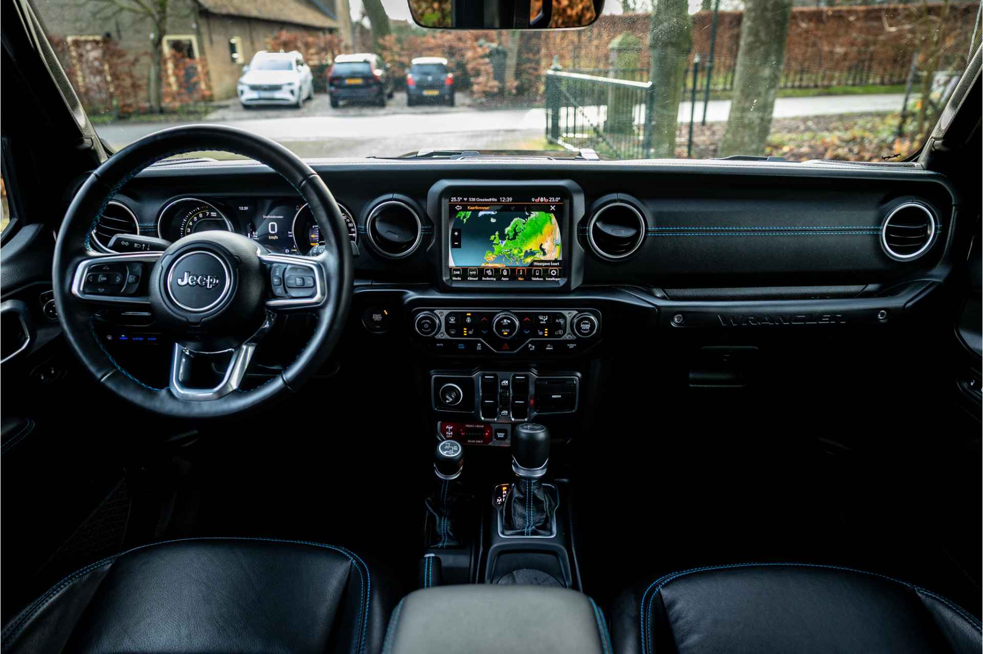 Keurige Jeep Wrangler Unlimited 4xe 380 Rubin met plug in hybride aandrijving. Lakkleur is Granite Crystal Metallic en de auto is voorzien van een wrap in de kleur zwart. Het interieur is voorzien van zwart leder. Deze Wrangler is volledig open te rijden dankzij de uitneembare dakpanelen over de gehele lengte. Ook de portieren kunnen worden verwijderd en de voorruit is omklapbaar. Deze Rubicon versie maakt van de Wrangler een echte allrounder doordat hij beschikt over swaybar control (elektronisch ontkoppelbare stabilisatorstang), Rock-trac full time 4WD systeem, front offroad camera en Trac-Lok anti slip differentieel achter. U zult dit niet dagelijks nodig hebben, maar het is wel zo fijn dat als je het terrein ingaat de auto ook echt zijn mannetje staat. Het rijden in de stad en snelweg kan volledig elektrisch worden gedaan, de elektrische actieradius bedraagt 45 kilometer.