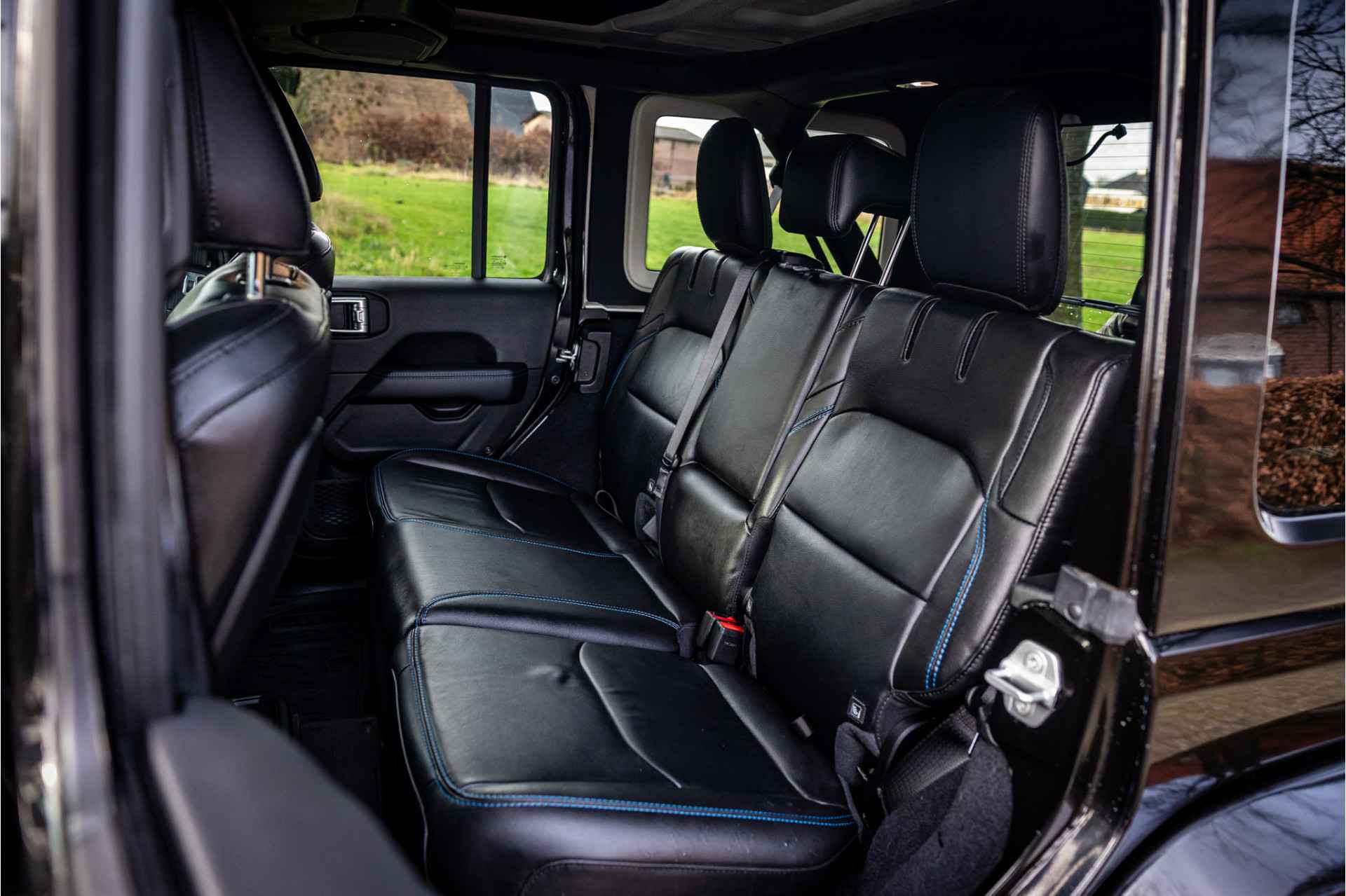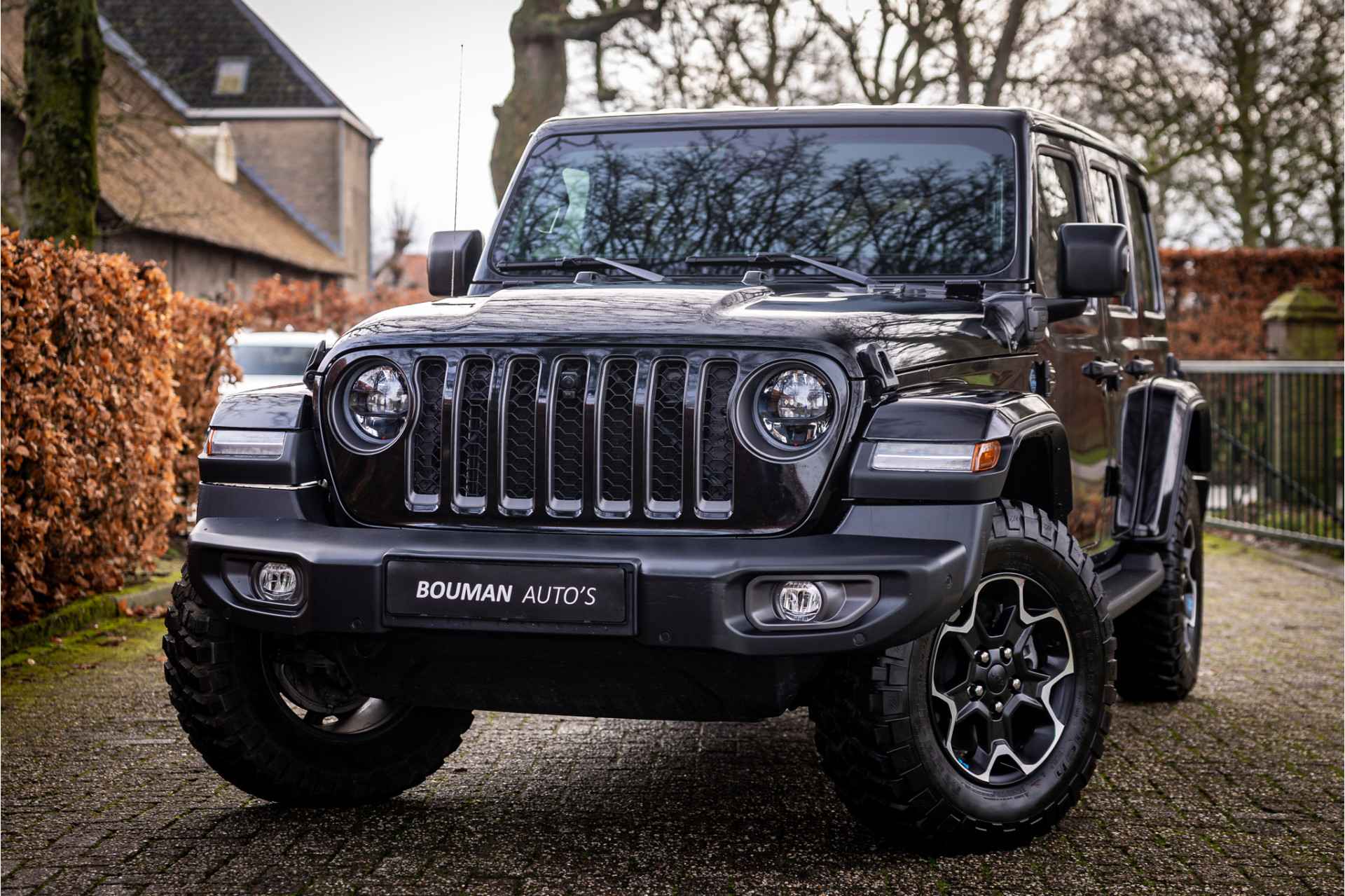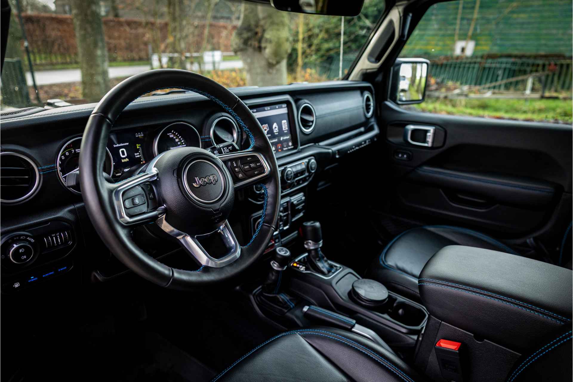 Keurige Jeep Wrangler Unlimited 4xe 380 Rubin met plug in hybride aandrijving. Lakkleur is Granite Crystal Metallic en de auto is voorzien van een wrap in de kleur zwart. Het interieur is voorzien van zwart leder. Deze Wrangler is volledig open te rijden dankzij de uitneembare dakpanelen over de gehele lengte. Ook de portieren kunnen worden verwijderd en de voorruit is omklapbaar. Deze Rubicon versie maakt van de Wrangler een echte allrounder doordat hij beschikt over swaybar control (elektronisch ontkoppelbare stabilisatorstang), Rock-trac full time 4WD systeem, front offroad camera en Trac-Lok anti slip differentieel achter. U zult dit niet dagelijks nodig hebben, maar het is wel zo fijn dat als je het terrein ingaat de auto ook echt zijn mannetje staat. Het rijden in de stad en snelweg kan volledig elektrisch worden gedaan, de elektrische actieradius bedraagt 45 kilometer.