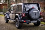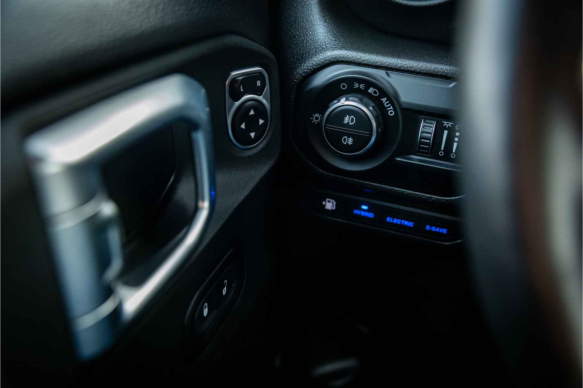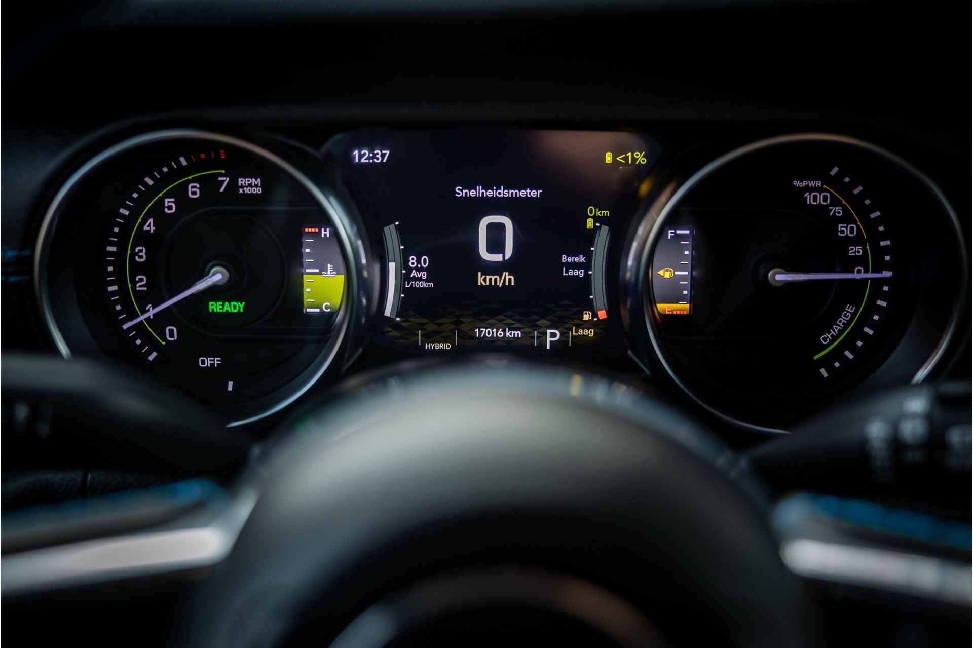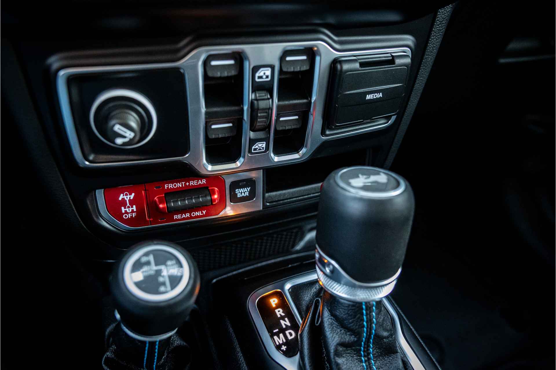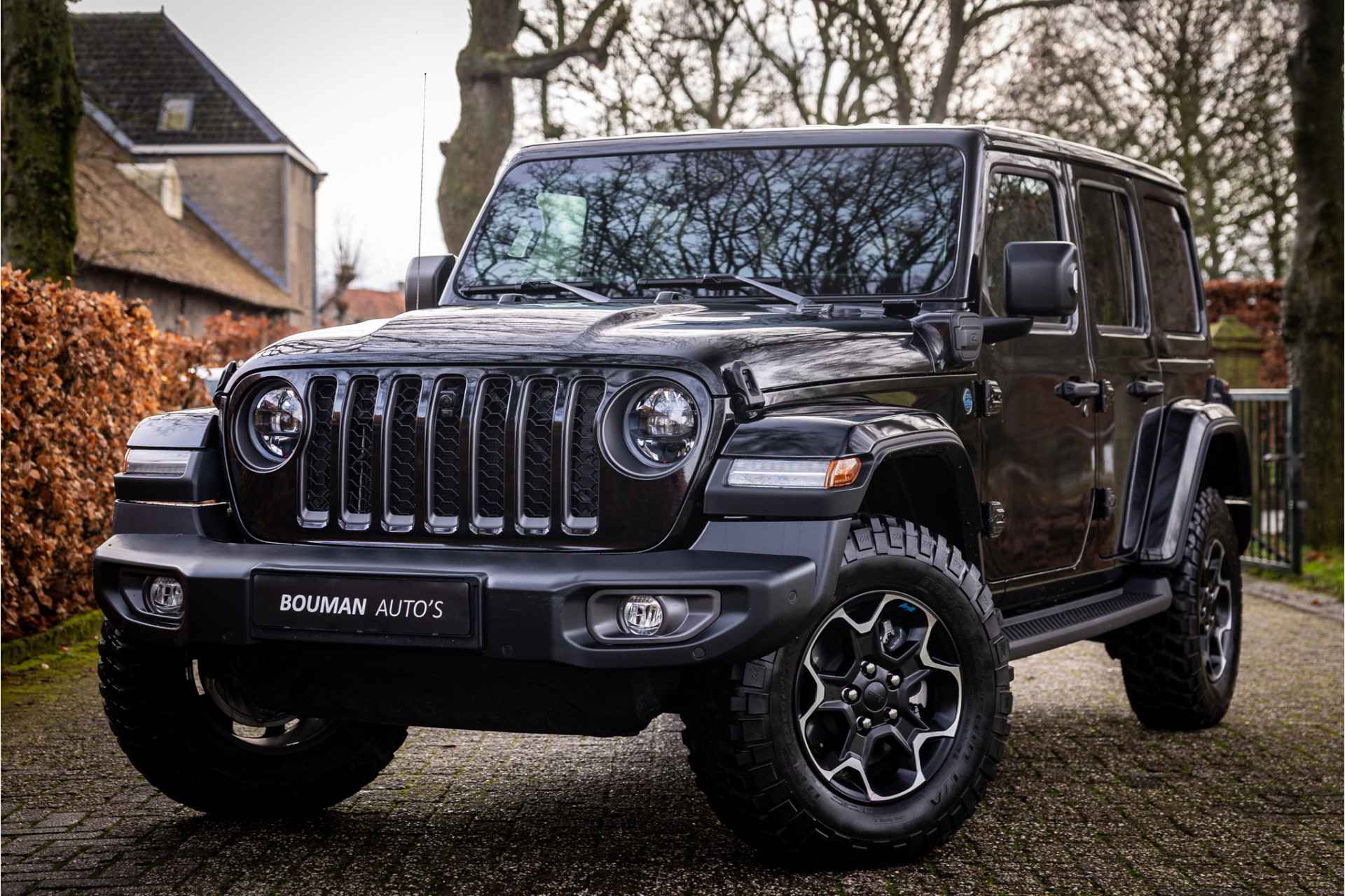 Keurige Jeep Wrangler Unlimited 4xe 380 Rubin met plug in hybride aandrijving. Lakkleur is Granite Crystal Metallic en de auto is voorzien van een wrap in de kleur zwart. Het interieur is voorzien van zwart leder. Deze Wrangler is volledig open te rijden dankzij de uitneembare dakpanelen over de gehele lengte. Ook de portieren kunnen worden verwijderd en de voorruit is omklapbaar. Deze Rubicon versie maakt van de Wrangler een echte allrounder doordat hij beschikt over swaybar control (elektronisch ontkoppelbare stabilisatorstang), Rock-trac full time 4WD systeem, front offroad camera en Trac-Lok anti slip differentieel achter. U zult dit niet dagelijks nodig hebben, maar het is wel zo fijn dat als je het terrein ingaat de auto ook echt zijn mannetje staat. Het rijden in de stad en snelweg kan volledig elektrisch worden gedaan, de elektrische actieradius bedraagt 45 kilometer.