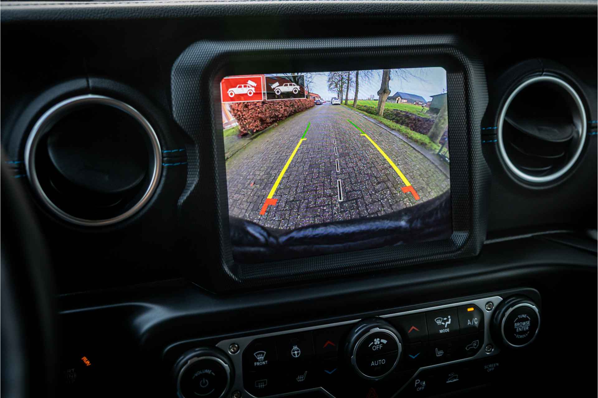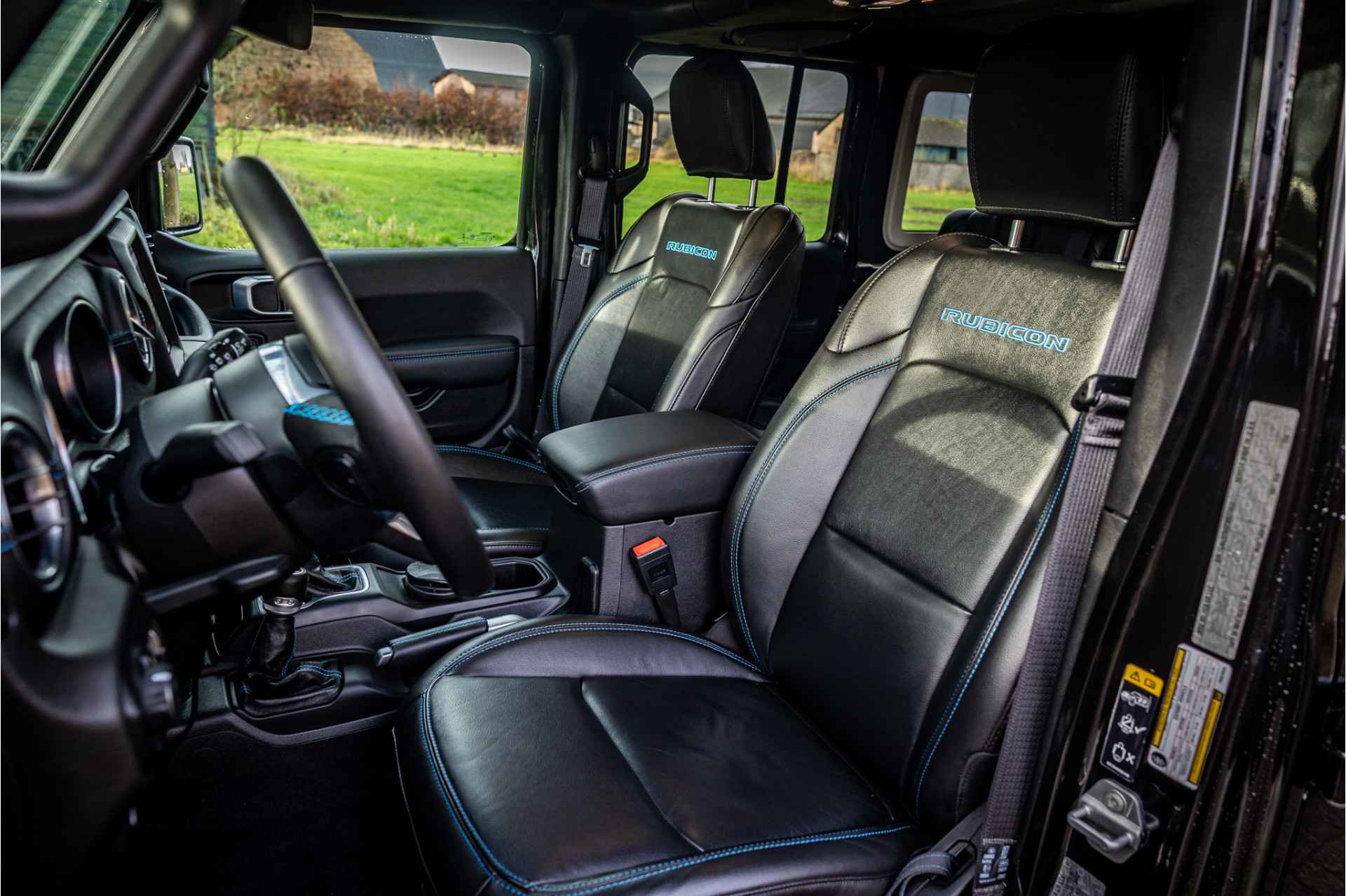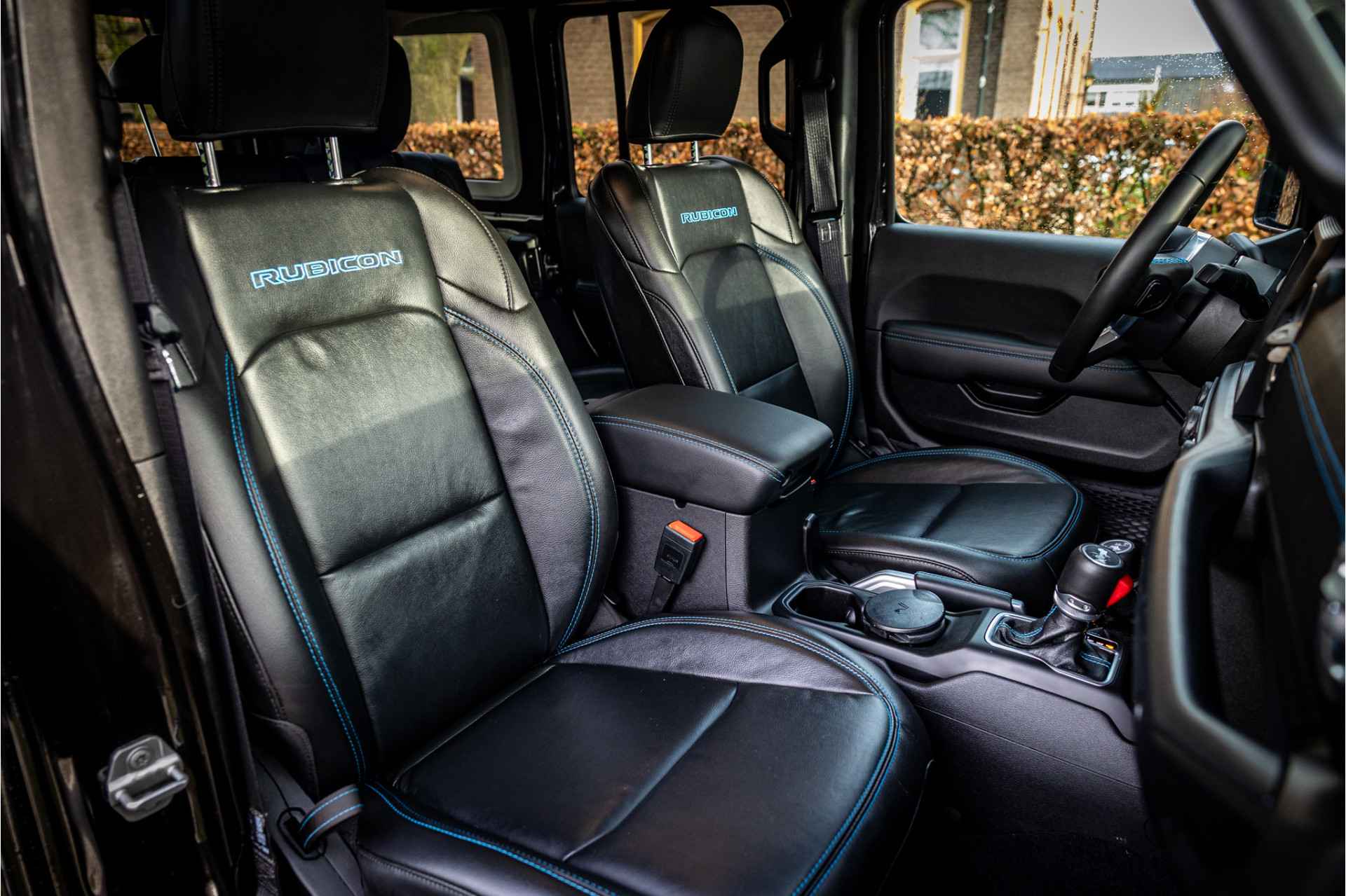 Tot de verdere uitrusting behoort adaptive cruise control met stop en go, keyless entry, dode hoek assistent, 8.4" touchscreen navigatie met Apple Carplay en Android Auto, Alpine Audio systeem met 9 speakers, LED koplampen met auto high beam functie, camera voor en achter, trekhaak, LED ambient interieurverlichting, bluetooth connectiviteit, Jeep Navigatie, verwarmbare voorstoelen en stuurwiel, voorstoelen voorzien van Rubicon logo, dual zone klimaatregeling, 17" lichtmetalen velgen, parkeersensoren voor en achter, metallic lak, trailer assist, torx tool kit voor verwijdering van deuren en dak en omklappen voorruit en volwaardig reservewiel op achterklep.