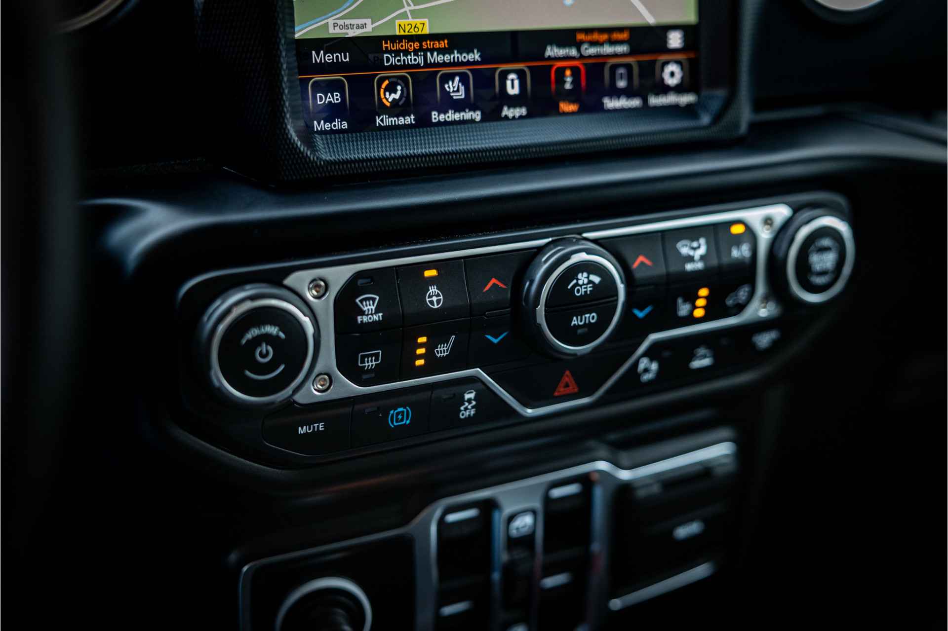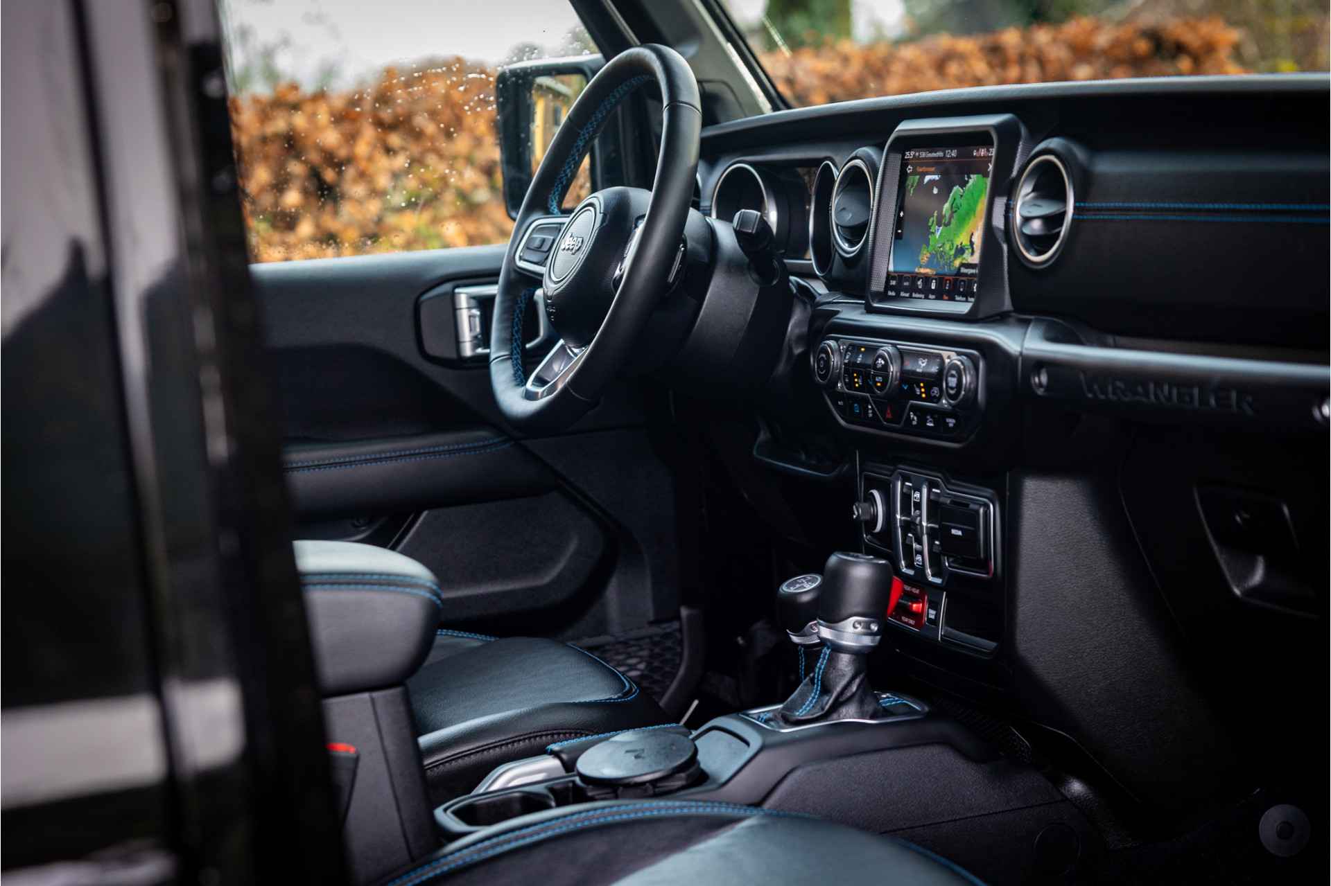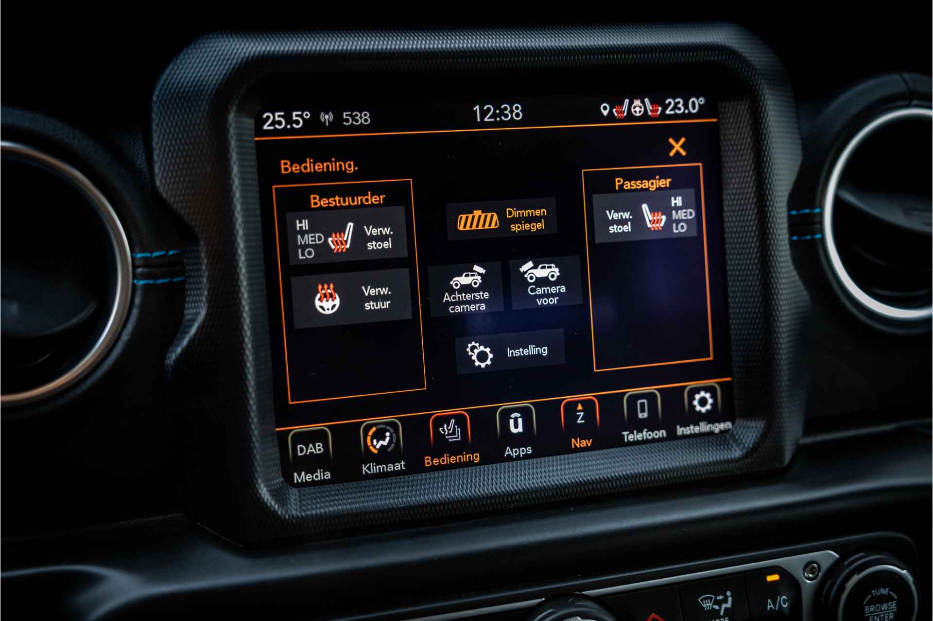 Tot de verdere uitrusting behoort adaptive cruise control met stop en go, keyless entry, dode hoek assistent, 8.4" touchscreen navigatie met Apple Carplay en Android Auto, Alpine Audio systeem met 9 speakers, LED koplampen met auto high beam functie, camera voor en achter, trekhaak, LED ambient interieurverlichting, bluetooth connectiviteit, Jeep Navigatie, verwarmbare voorstoelen en stuurwiel, voorstoelen voorzien van Rubicon logo, dual zone klimaatregeling, 17" lichtmetalen velgen, parkeersensoren voor en achter, metallic lak, trailer assist, torx tool kit voor verwijdering van deuren en dak en omklappen voorruit en volwaardig reservewiel op achterklep.
