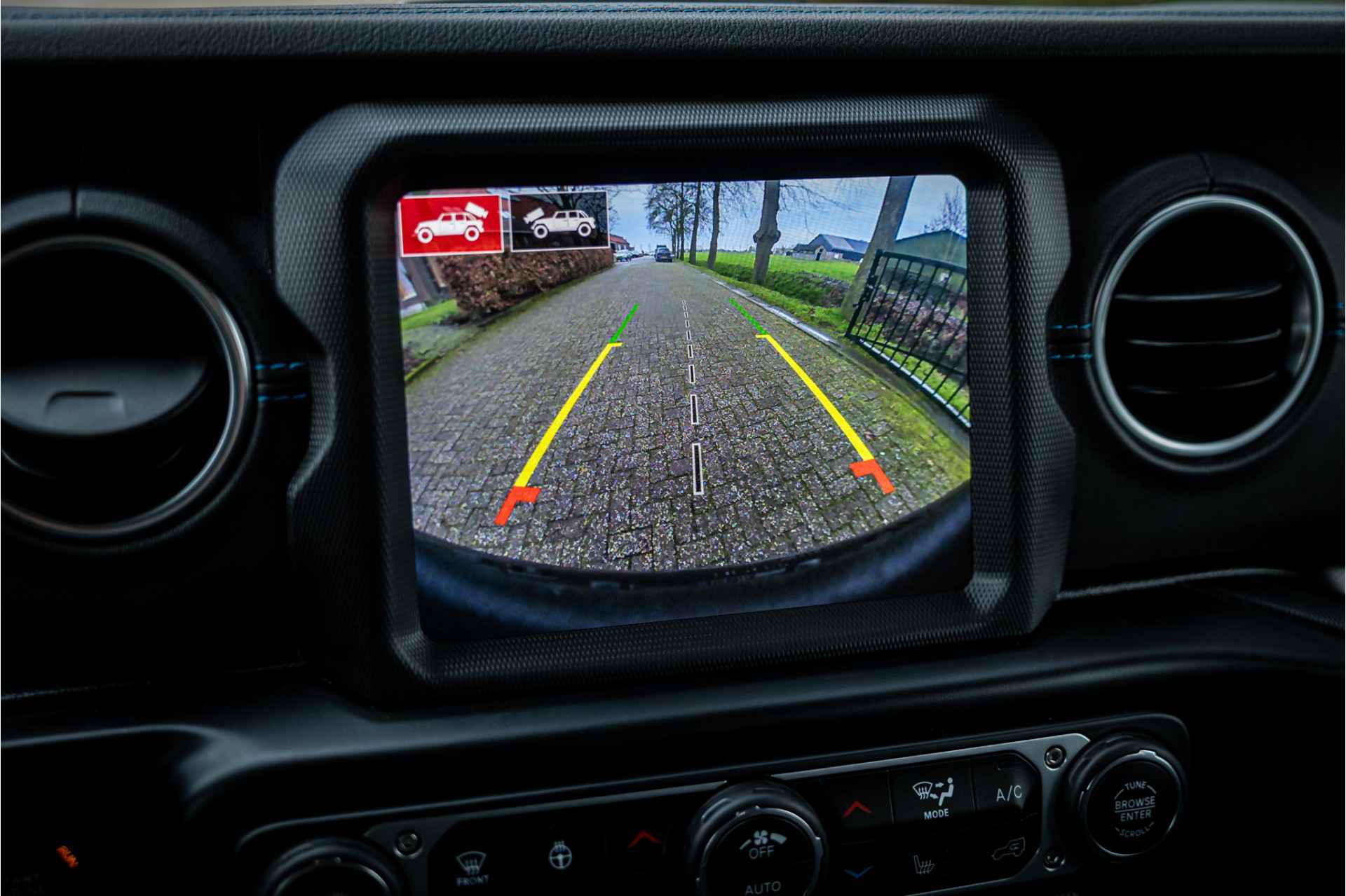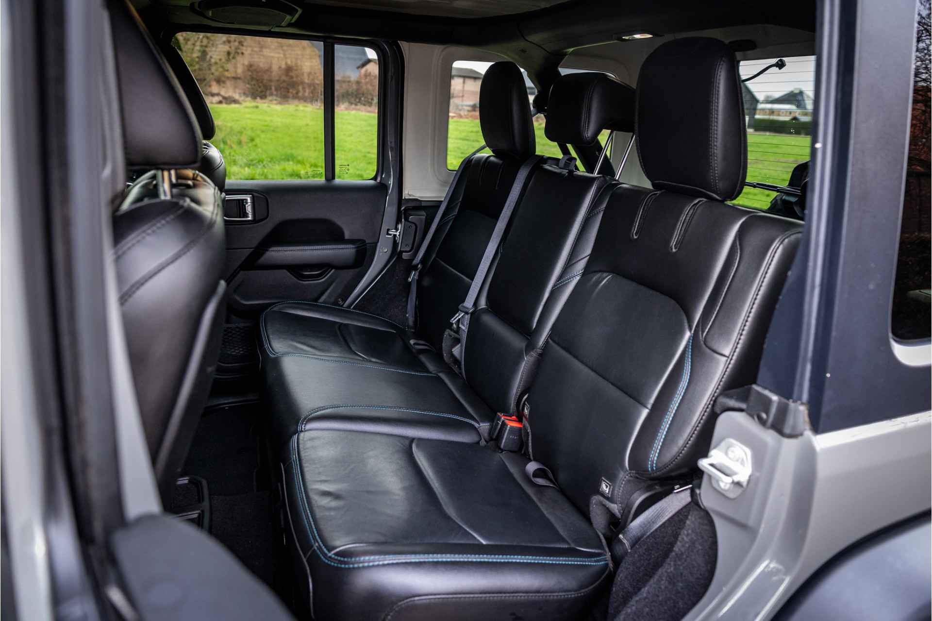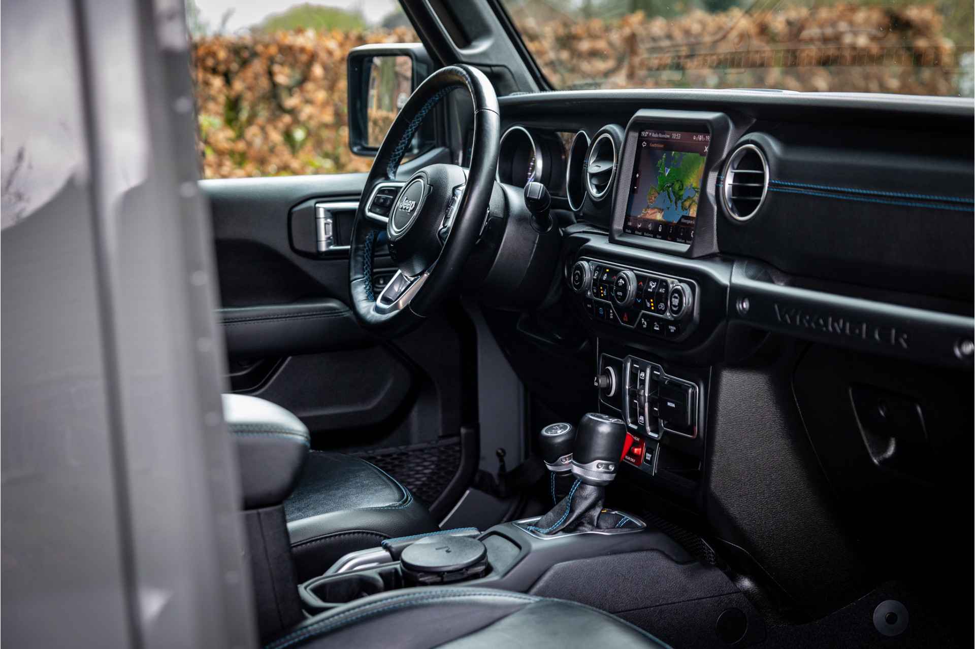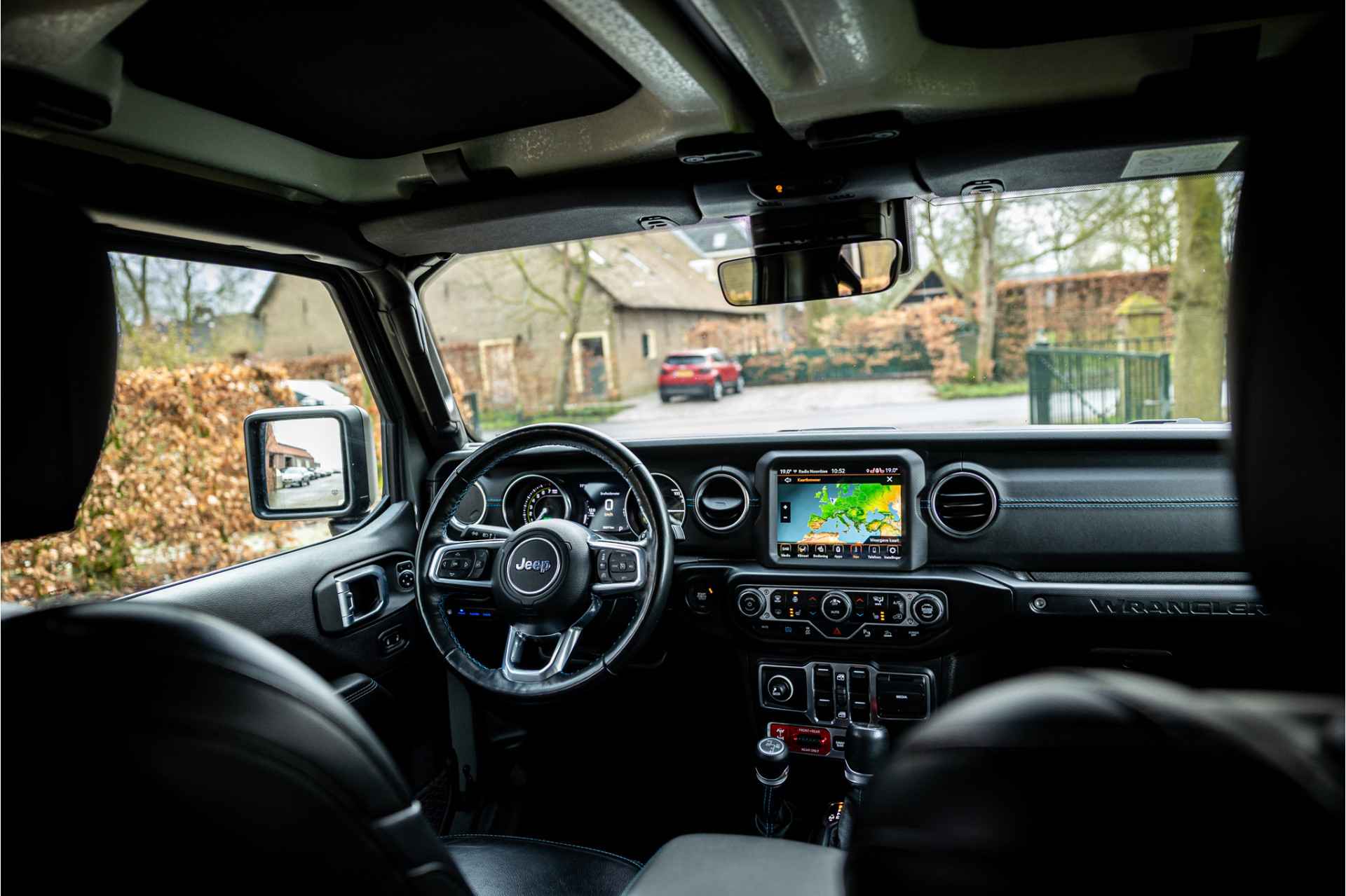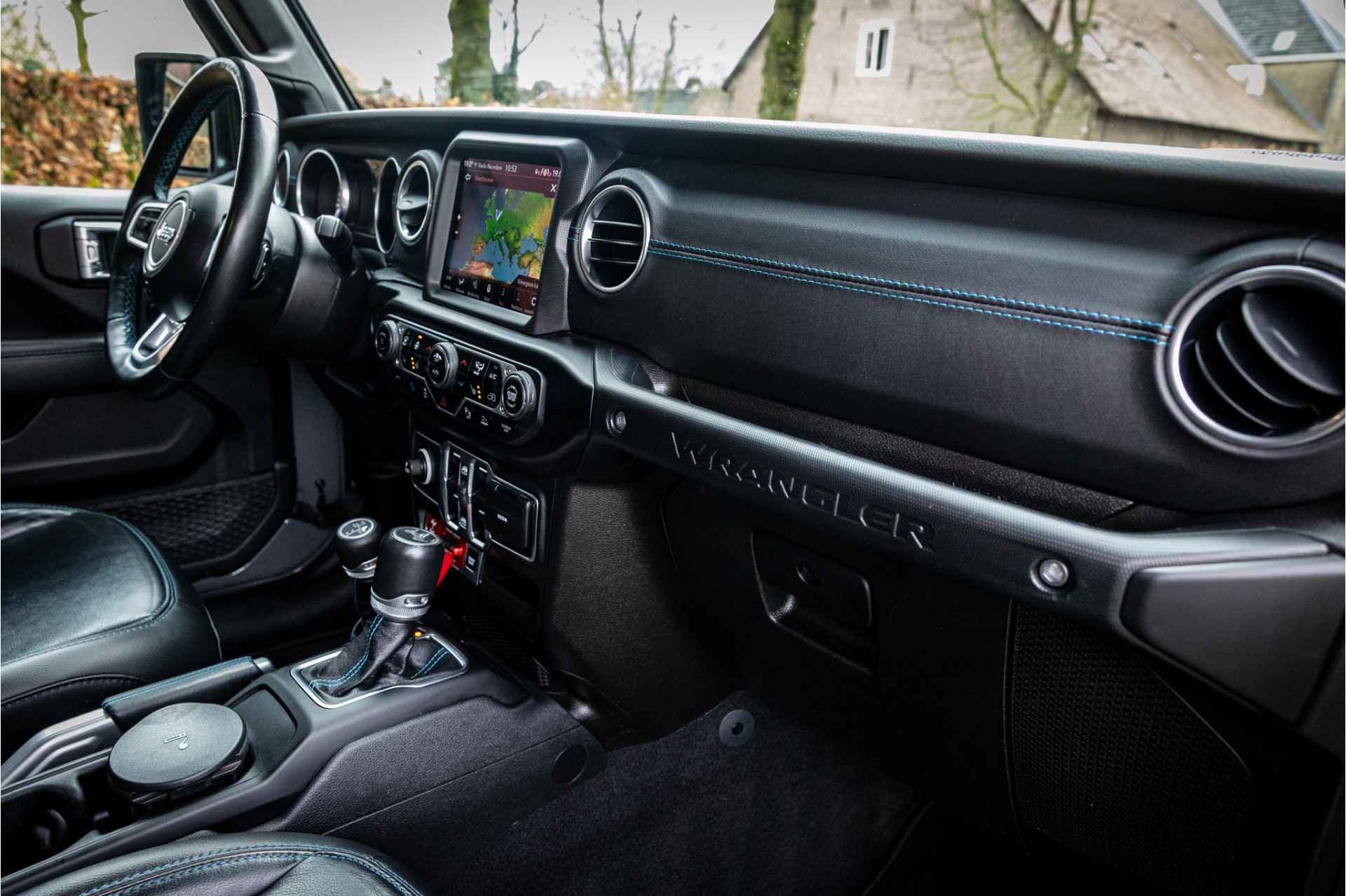 Tot de verdere uitrusting behoort adaptive cruise control met stop en go, keyless entry, dode hoek assistent, 8.4" touchscreen navigatie met Apple Carplay en Android Auto, Alpine Audio systeem met 9 speakers, LED koplampen met auto high beam functie, camera voor en achter, afneembare trekhaak, bluetooth connectiviteit, Jeep Navigatie, verwarmbare voorstoelen en stuurwiel, voorstoelen voorzien van Rubicon logo, dual zone klimaatregeling, 17" lichtmetalen velgen, parkeersensoren voor en achter, metallic lak, torx tool kit voor verwijdering van deuren en dak en omklappen voorruit en volwaardig reservewiel op achterklep.