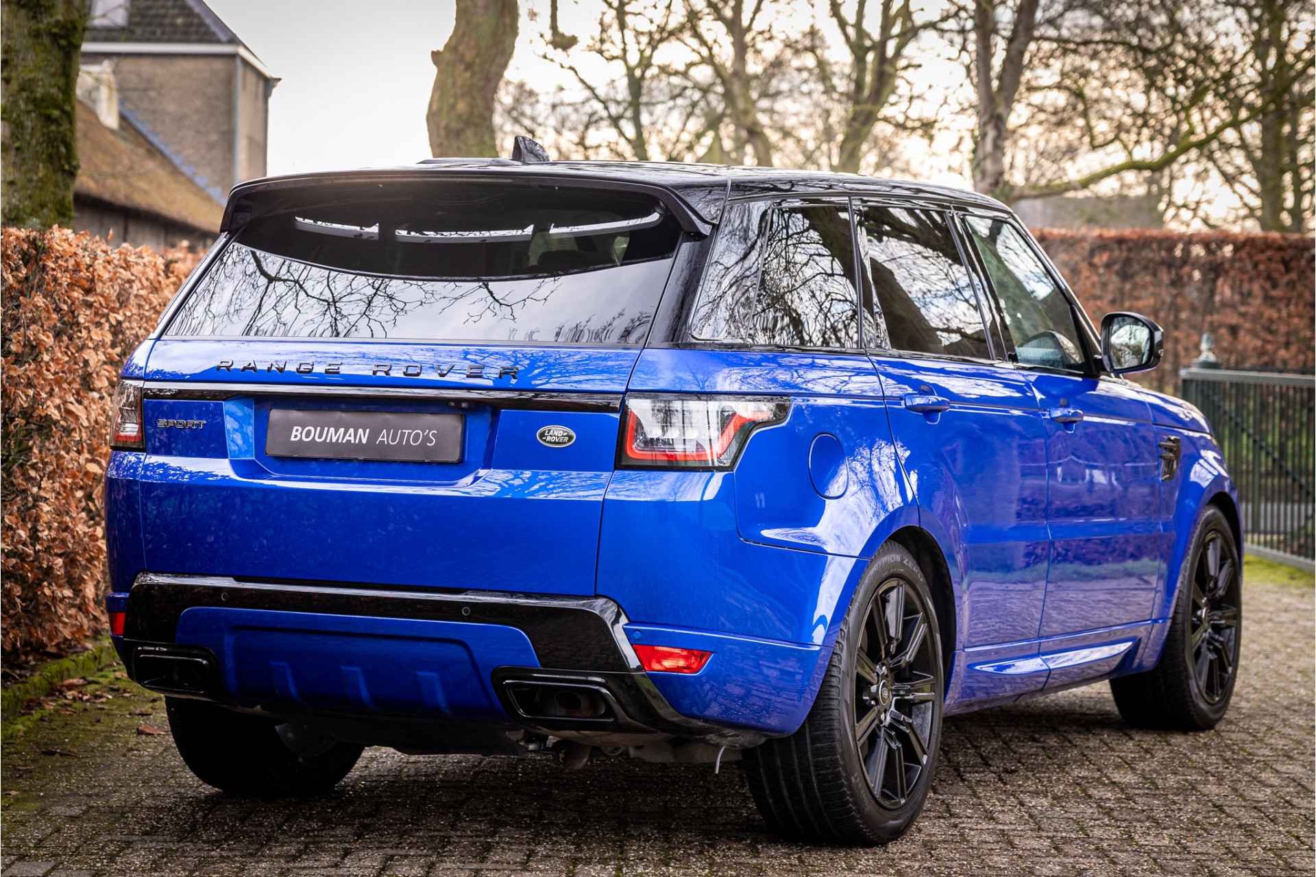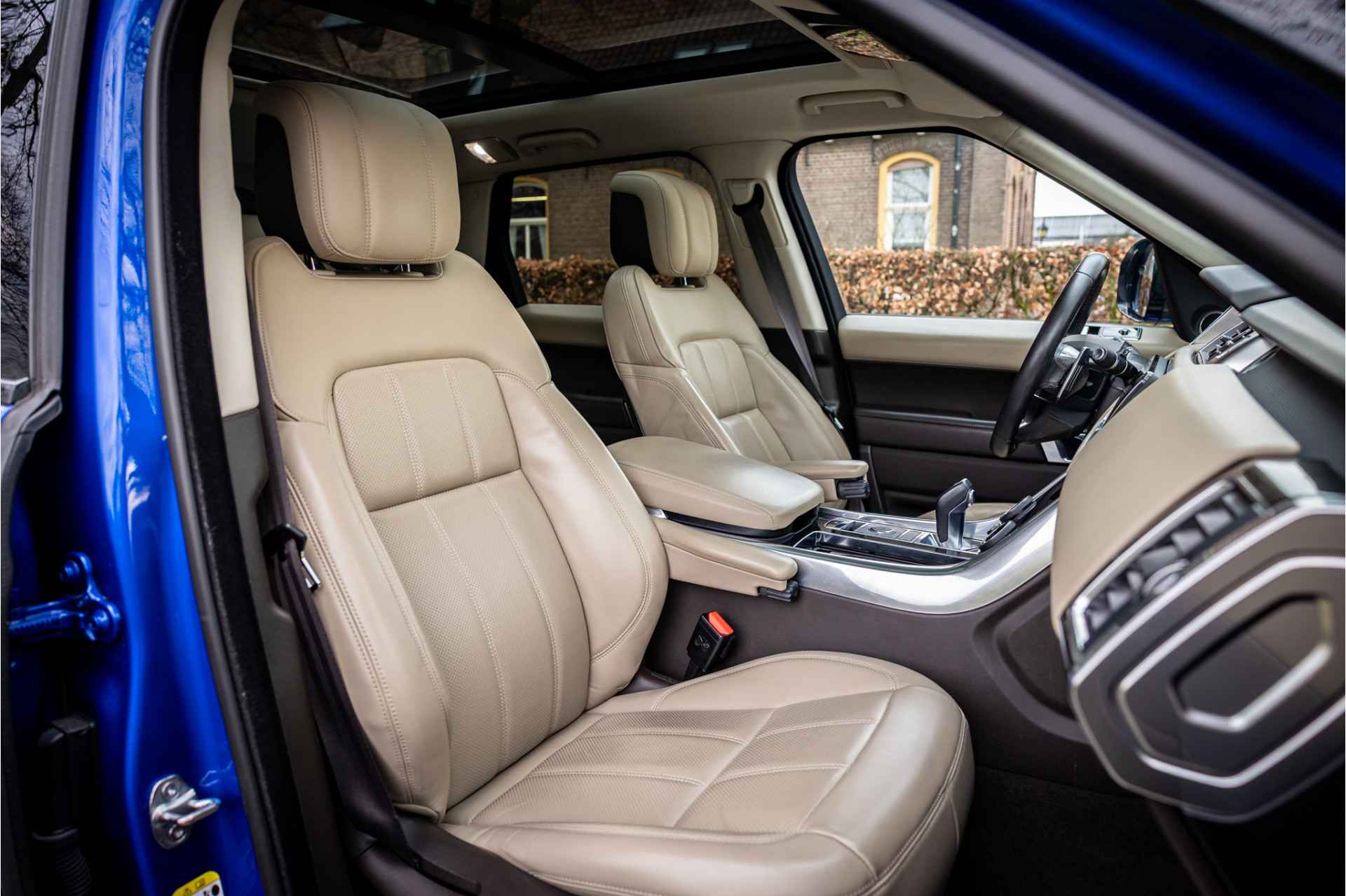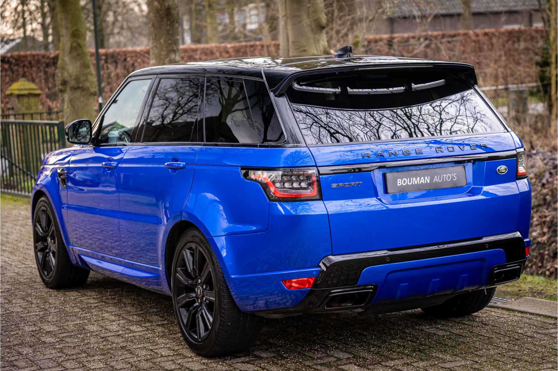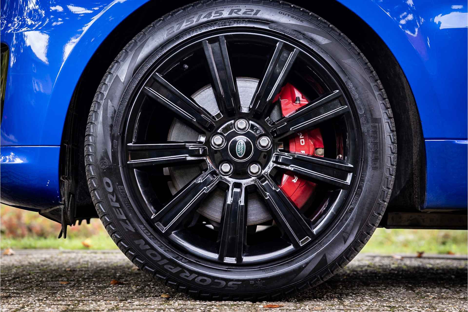 Fraaie Range Rover Sport in HSE Dynamic uitvoering met hybride aandrijflijn. Deze auto is afkomstig van de eerste eigenaar en in nette staat. Lakkleur is SVO Velocity Blue, dit is een exclusieve lak afkomstig van Landrover Special Vehicle Operations, deze afdeling is gespecialiseerd in het individualiseren van Range Rover modellen. Deze lakkleur heeft een meerprijs van 5.500 euro. Het interieur is bekleed met Ebony beige leder. De auto is aan de buitenzijde voorzien van een black pack in combinatie met rode remklauwen. Het dak is gespoten in hoogglans zwart wat een fraai contrast geeft met de blauwe lakkleur.