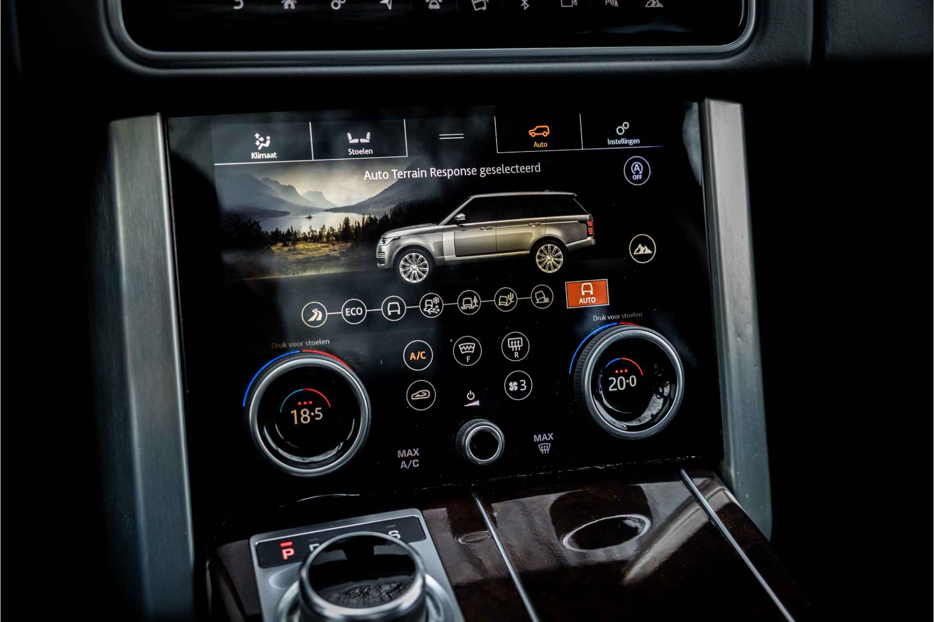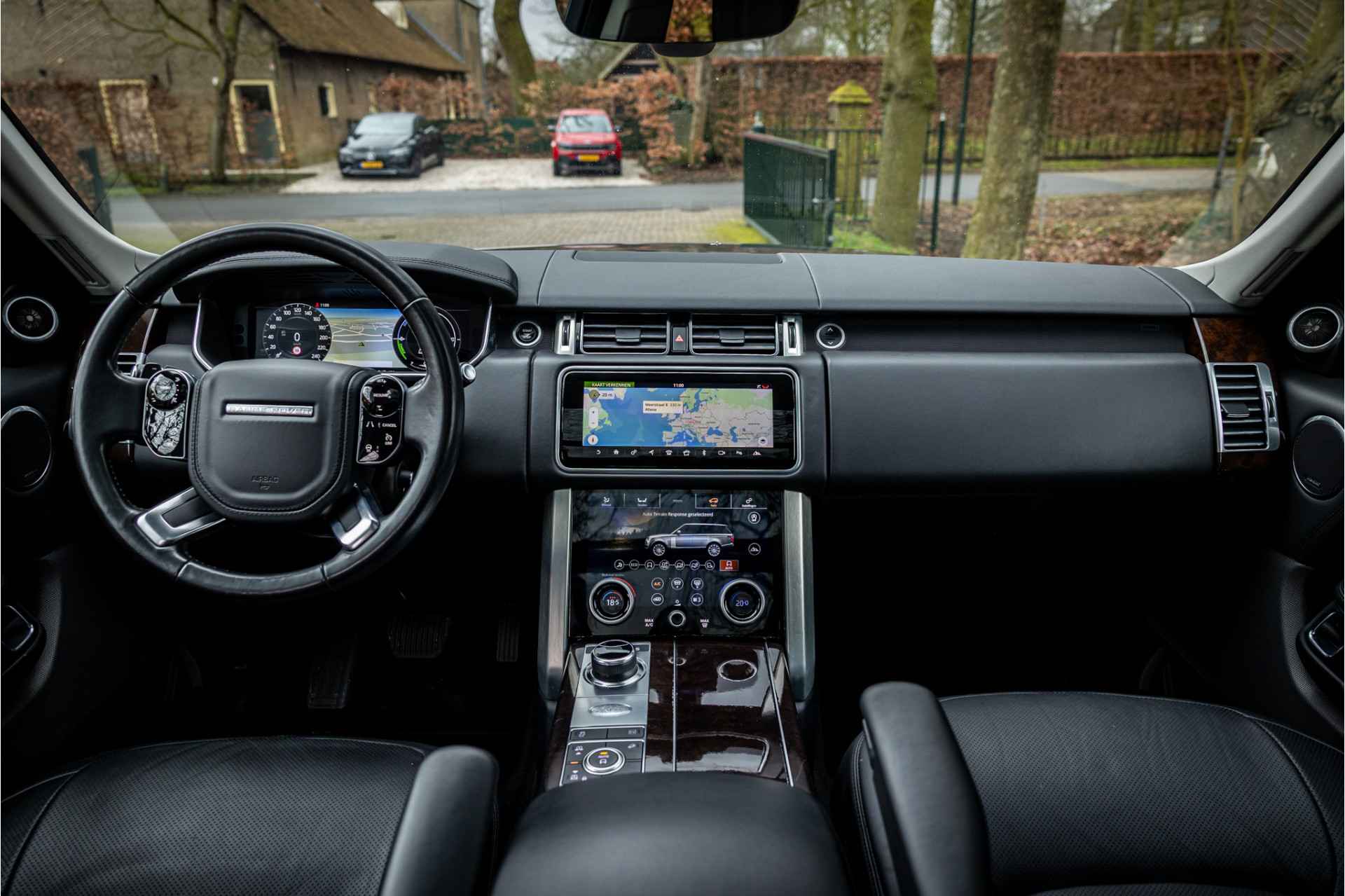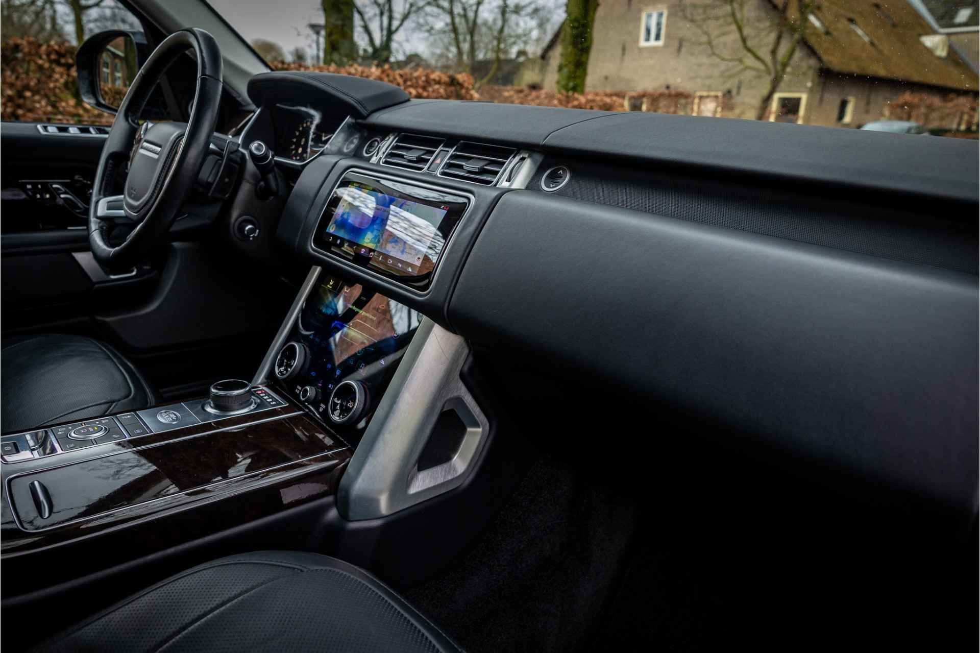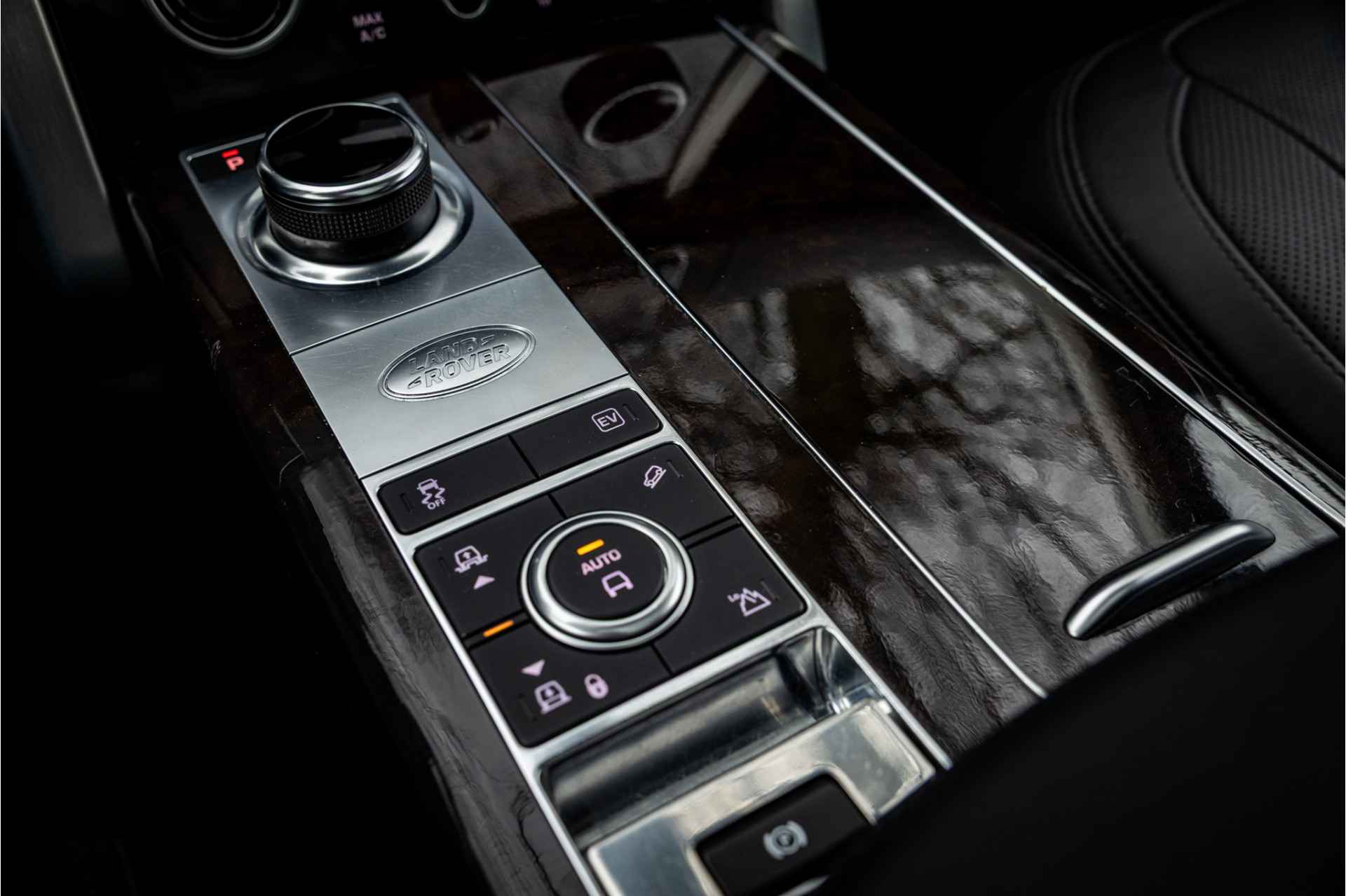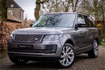 Fraaie Range Rover Vogue met hybride aandrijflijn in complete uitvoering. Lakkleur is Ammonite Grey metallic, het interieur is bekleed met Ebony Black leder wat ook is doorgevoerd op het dashboard.