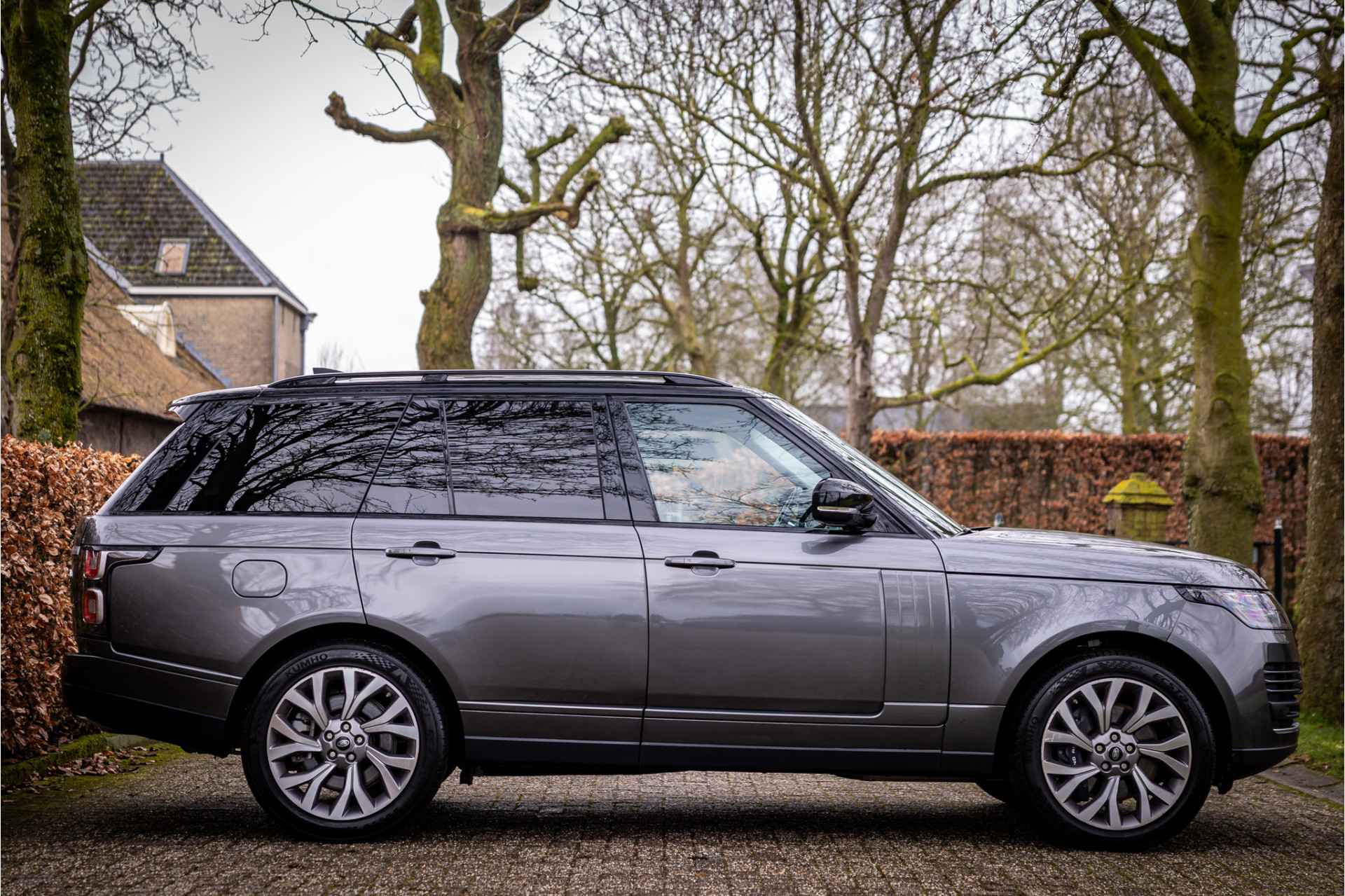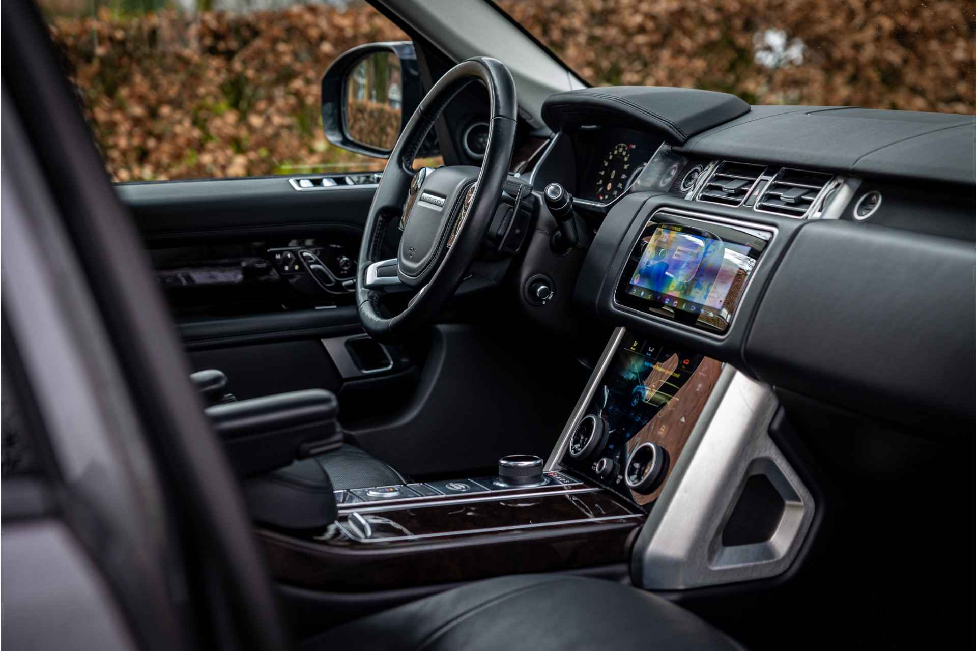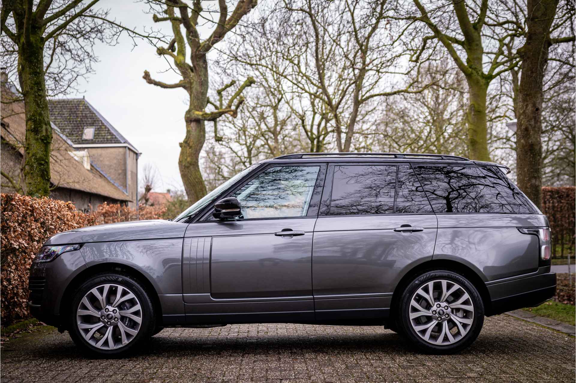 Fraaie Range Rover Vogue met hybride aandrijflijn in complete uitvoering. Lakkleur is Ammonite Grey metallic, het interieur is bekleed met Ebony Black leder wat ook is doorgevoerd op het dashboard.