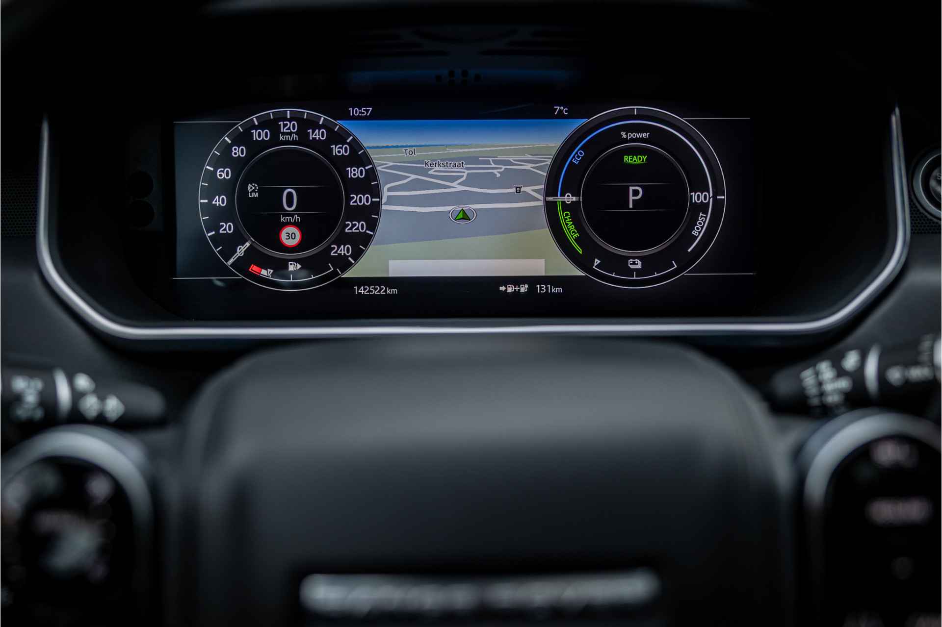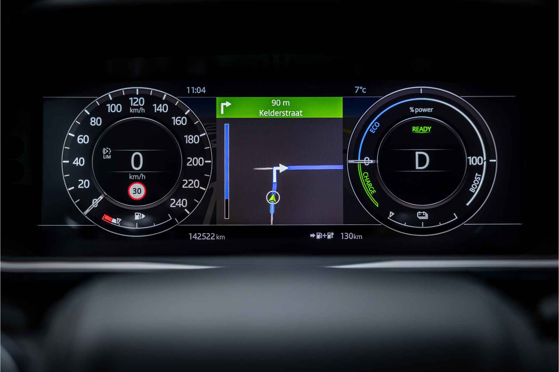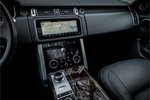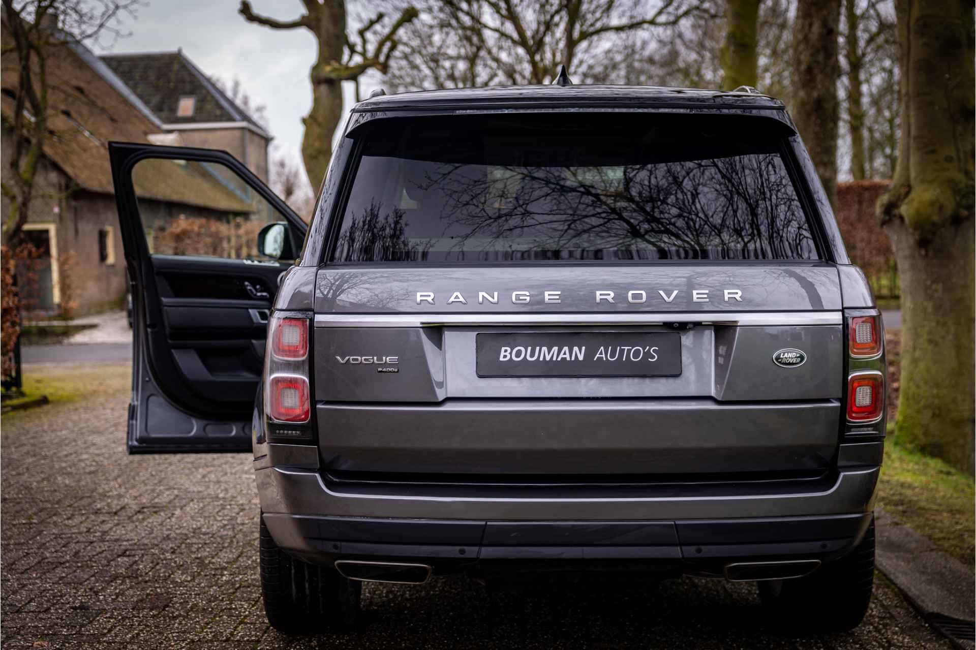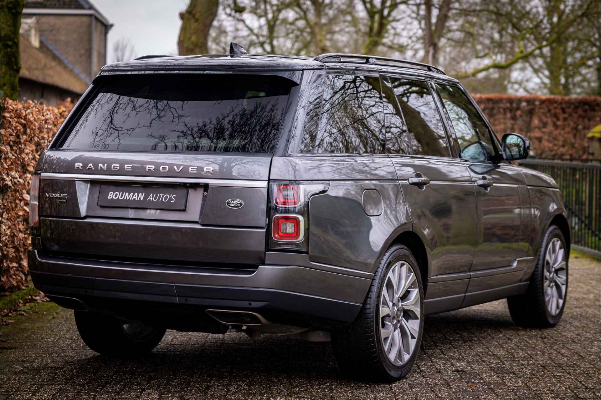 Fraaie Range Rover Vogue met hybride aandrijflijn in complete uitvoering. Lakkleur is Ammonite Grey metallic, het interieur is bekleed met Ebony Black leder wat ook is doorgevoerd op het dashboard.