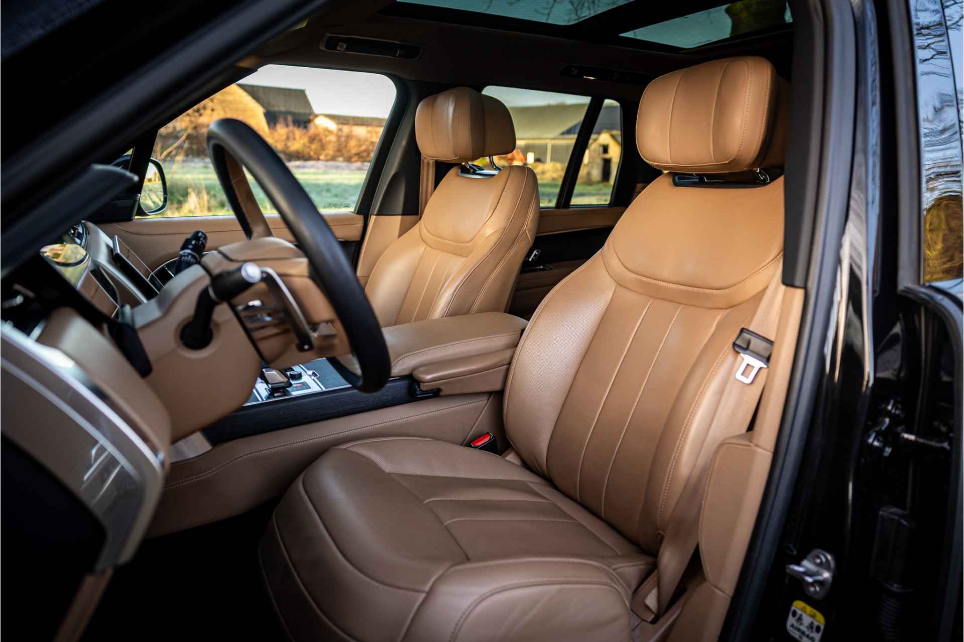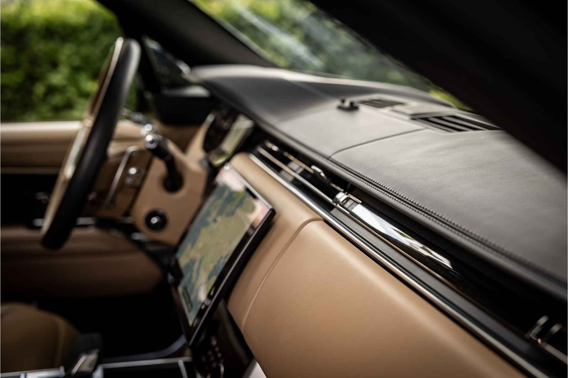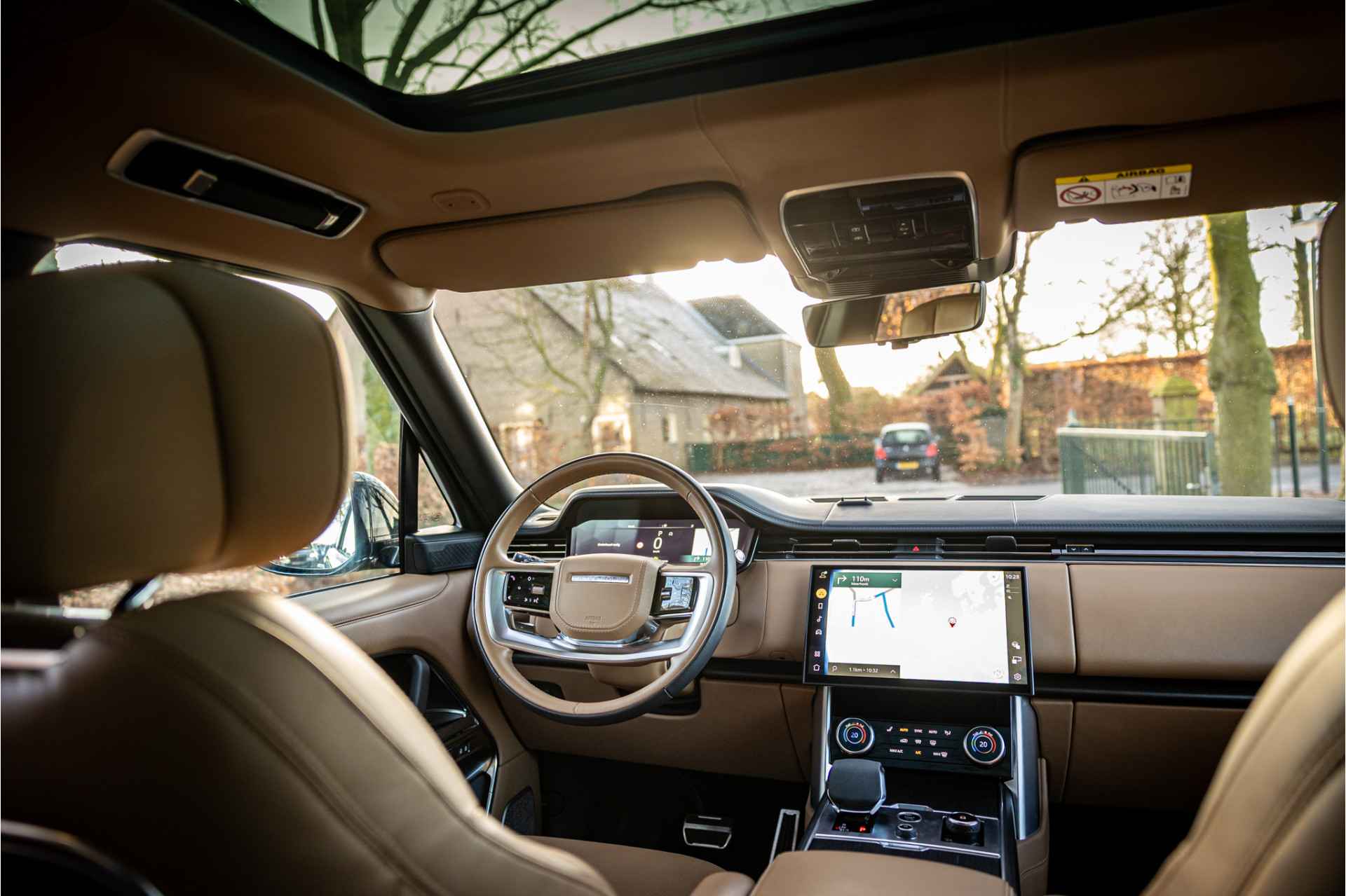 Fraaie Range Rover Autobiography P530 aangedreven door zijdezachte achtcilinder en stijlvolle kleursamenstelling. Lakkleur is Santorini Black metallic, het interieur is bekleed met Caraway leder wat ook is doorgevoerd op het dashboard. De volledige interieurhemel is bekleed met leder in Caraway kleurstelling.
