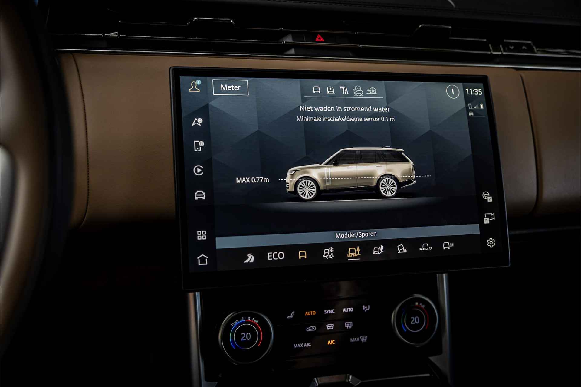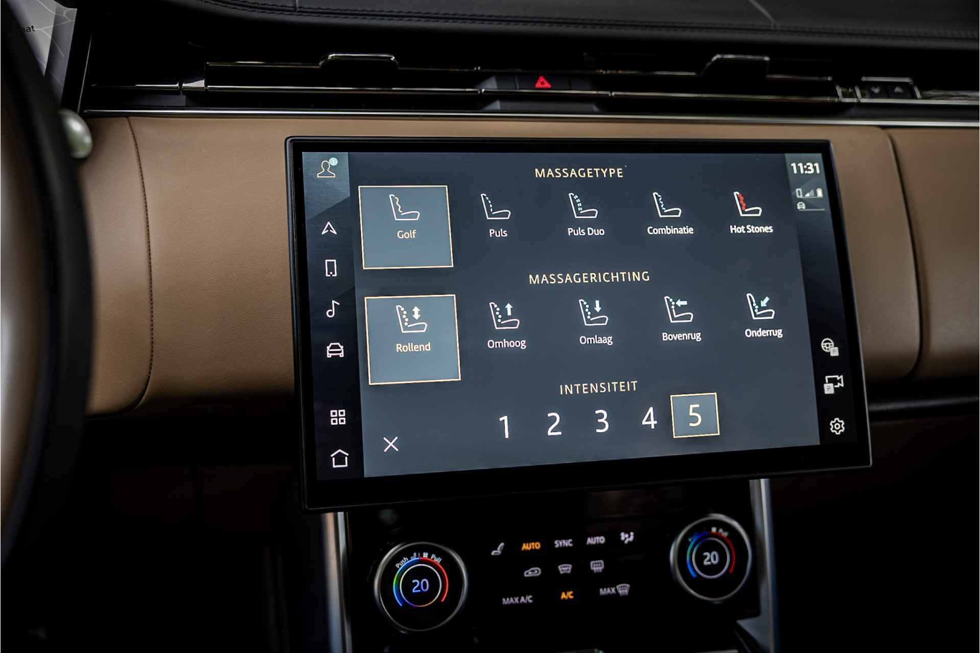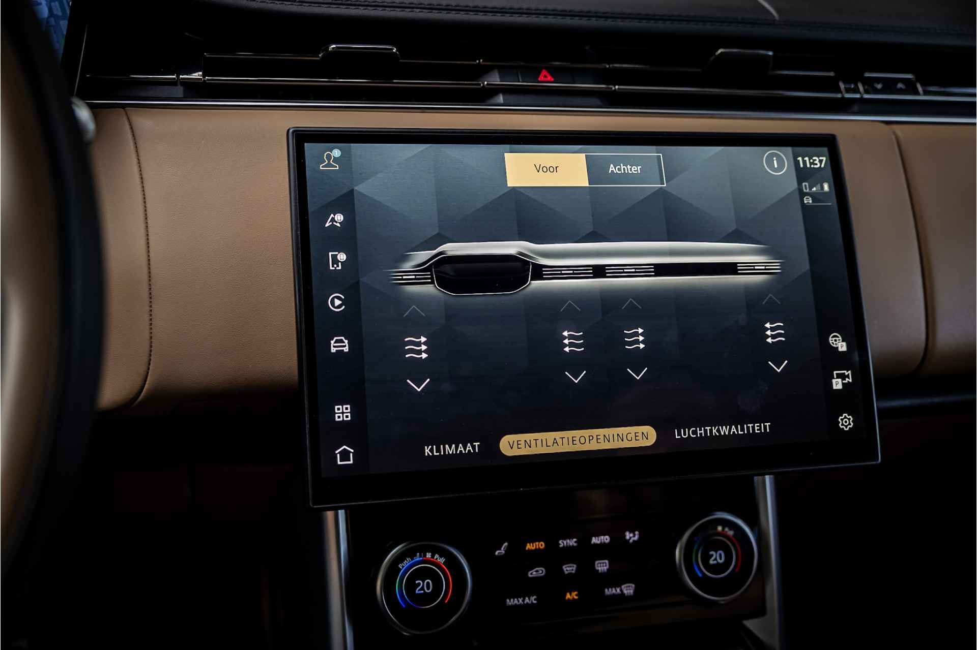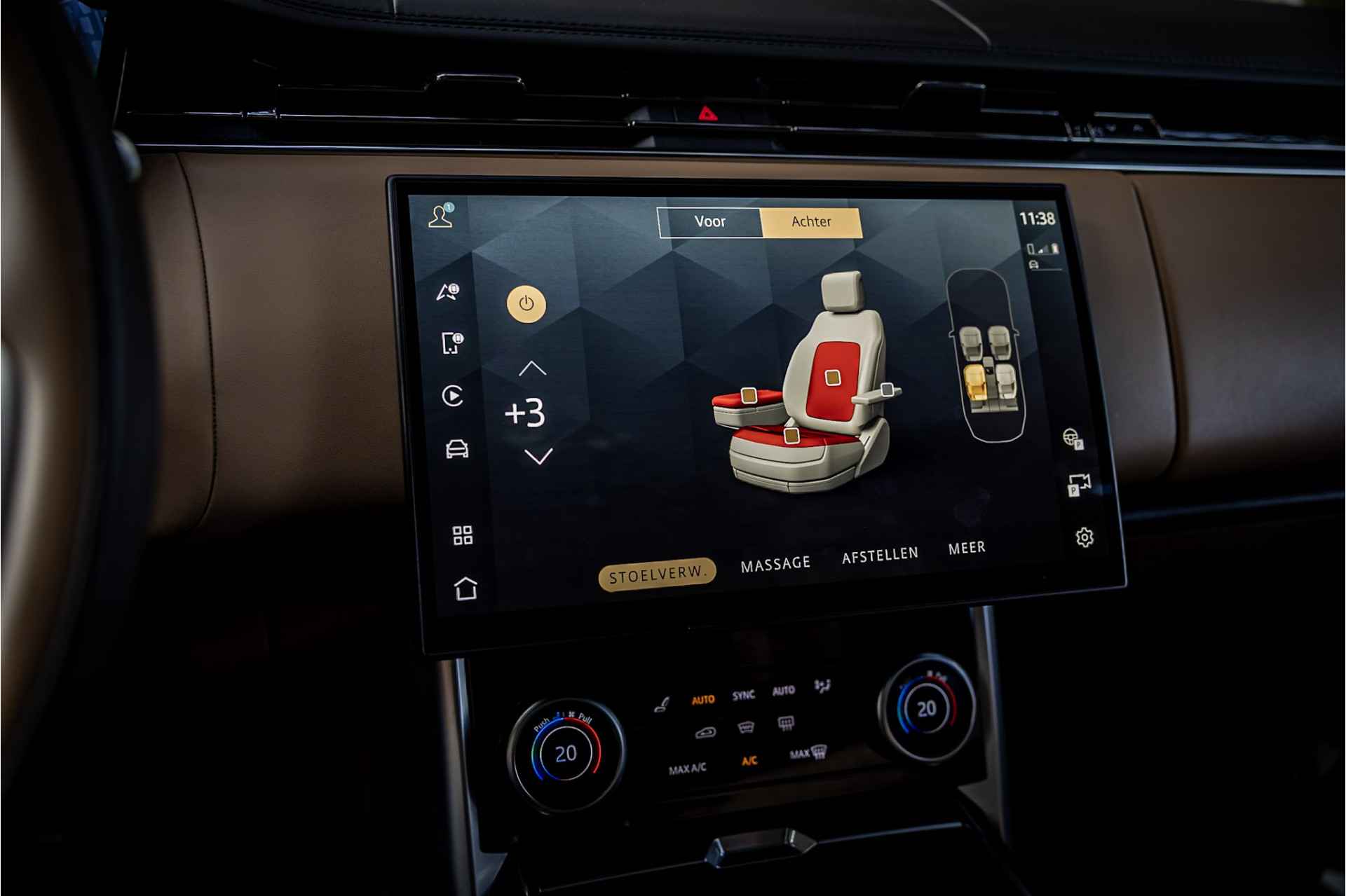 Deze Autobiography is compleet uitgerust met een glazen panoramadak waarbij het voorste deel geopend kan worden, Hot Stone massagefunctie op voorstoelen (uitgebreider dan de standaard massagefunctie), ventileerbare voor- en achterstoelen, koelvak in middenconsole, Meridian Signature Surround audiosysteem met 1.600 W en 34 luidsprekers en Active Noise Cancellation, 23" Styling 1075 Diamond Turned Finish Dark Grey velgen, Towing Pack met elektrisch uitklapbare trekhaak met 3.500 kg trekgewicht en Advanced Tow Assist waarbij de auto zelfstandig een trailer achteruit kan manouvreren zonder dat u als bestuurder het stuurwiel hoeft te gebruiken, vierwielbesturing met actief meesturende achterwielen, 24--voudig elektrisch verstelbare voorstoelen, Executive Class Comfort Seating achterin met memoryfunctie en elektrisch verstelbare stoelen met omhoogklapbare beensteun en 8" Rear Seat Touchscreen Controller in middenarmsteun, elektrisch neerklapbare achterstoelen, verwarmbare middenarmsteun en armsteunen in portieren, adaptive cruise control met steering assist, soft door close, 3D surround camera, uitgebreide ambianceverlichting interieur, luchtvering en automatische hoogteregeling, dode hoek assistentie, adaptieve verlichting, Reverse Traffic Detection, keyless entry en start, verkeersbordtekenherkenning, DAB tuner, akoestisch en gelaagd privacy glas achter, Apple Carplay en Android Auto, navigatiesysteem met touchscreen, verwarmbare voorstoelen en zitplaatsen achter, verwarmbaar stuurwiel, verwarmbare voorruit, warmtewerende voorruit, bluetooth telefoonintegratie, elektrisch inklapbare buitenspiegels, automatische klimaatregeling met vier gescheiden zones.