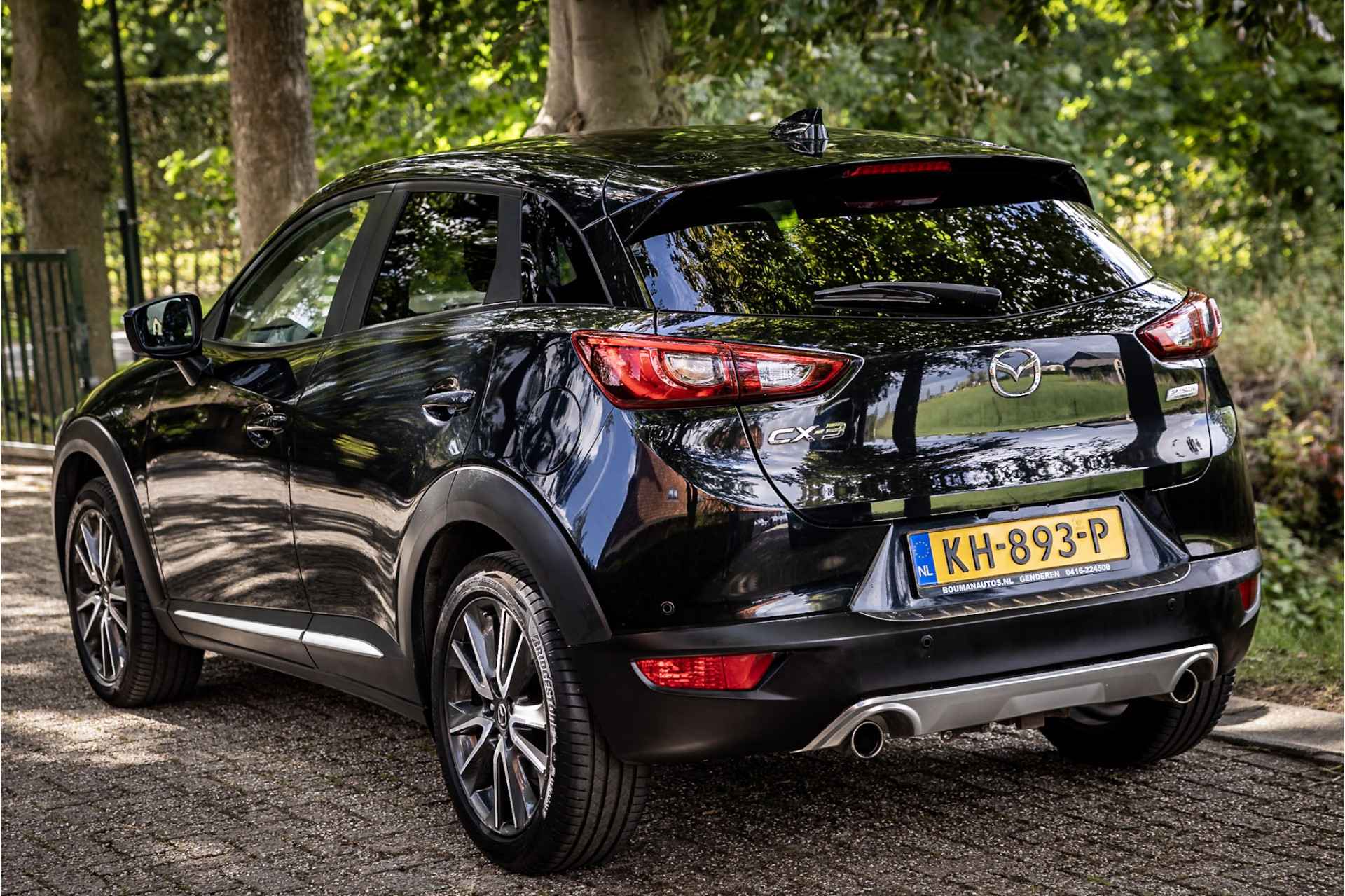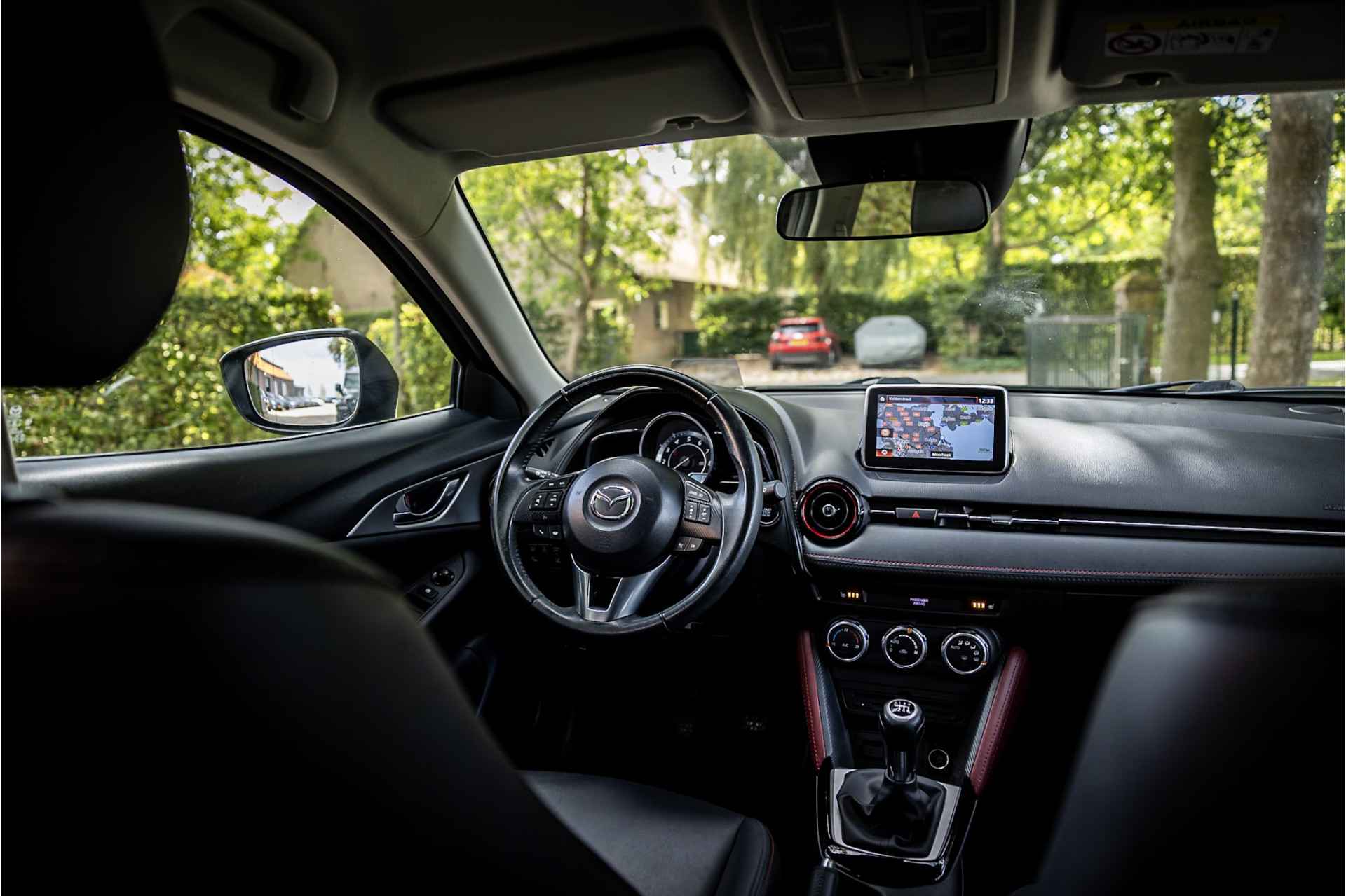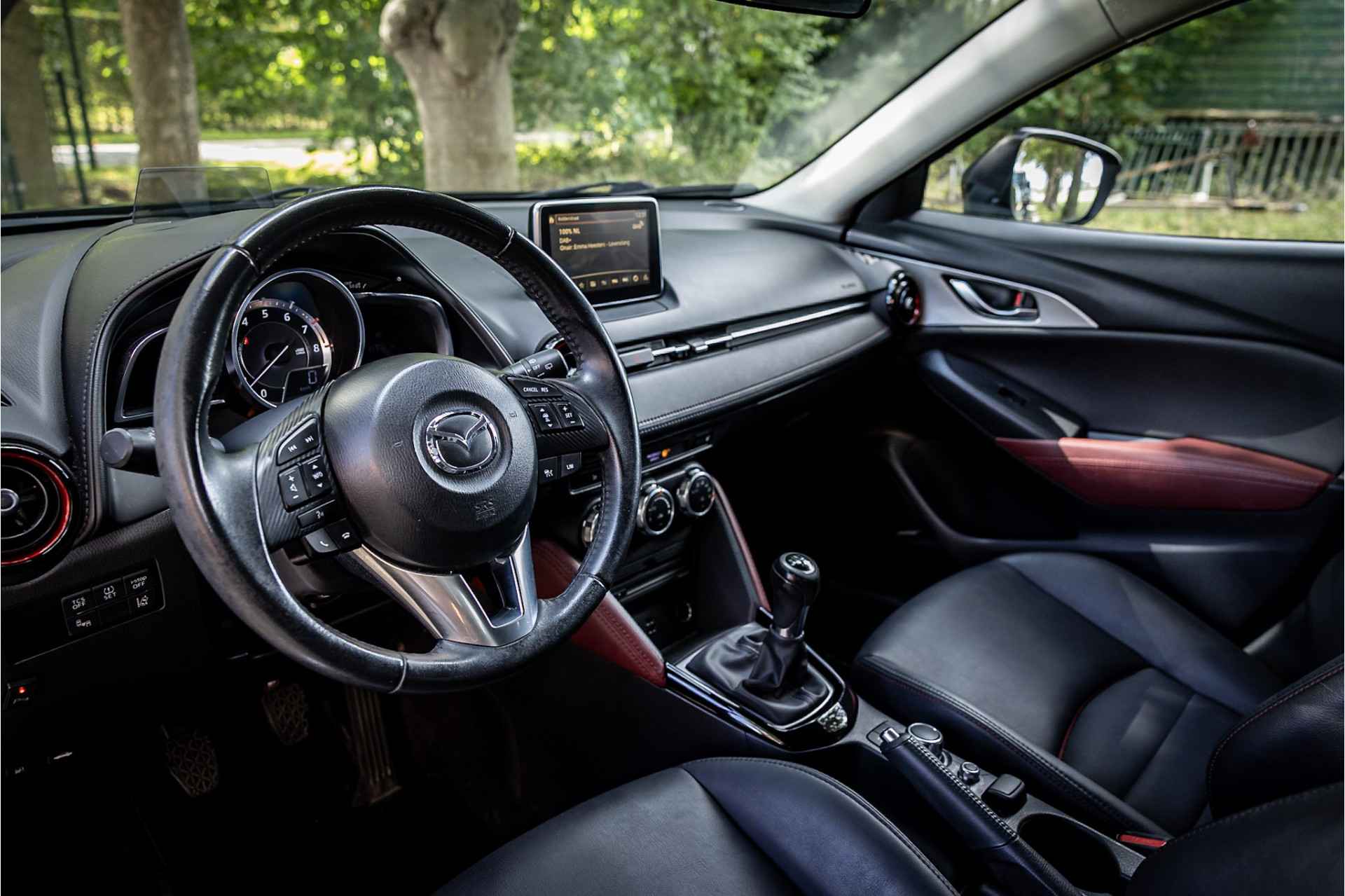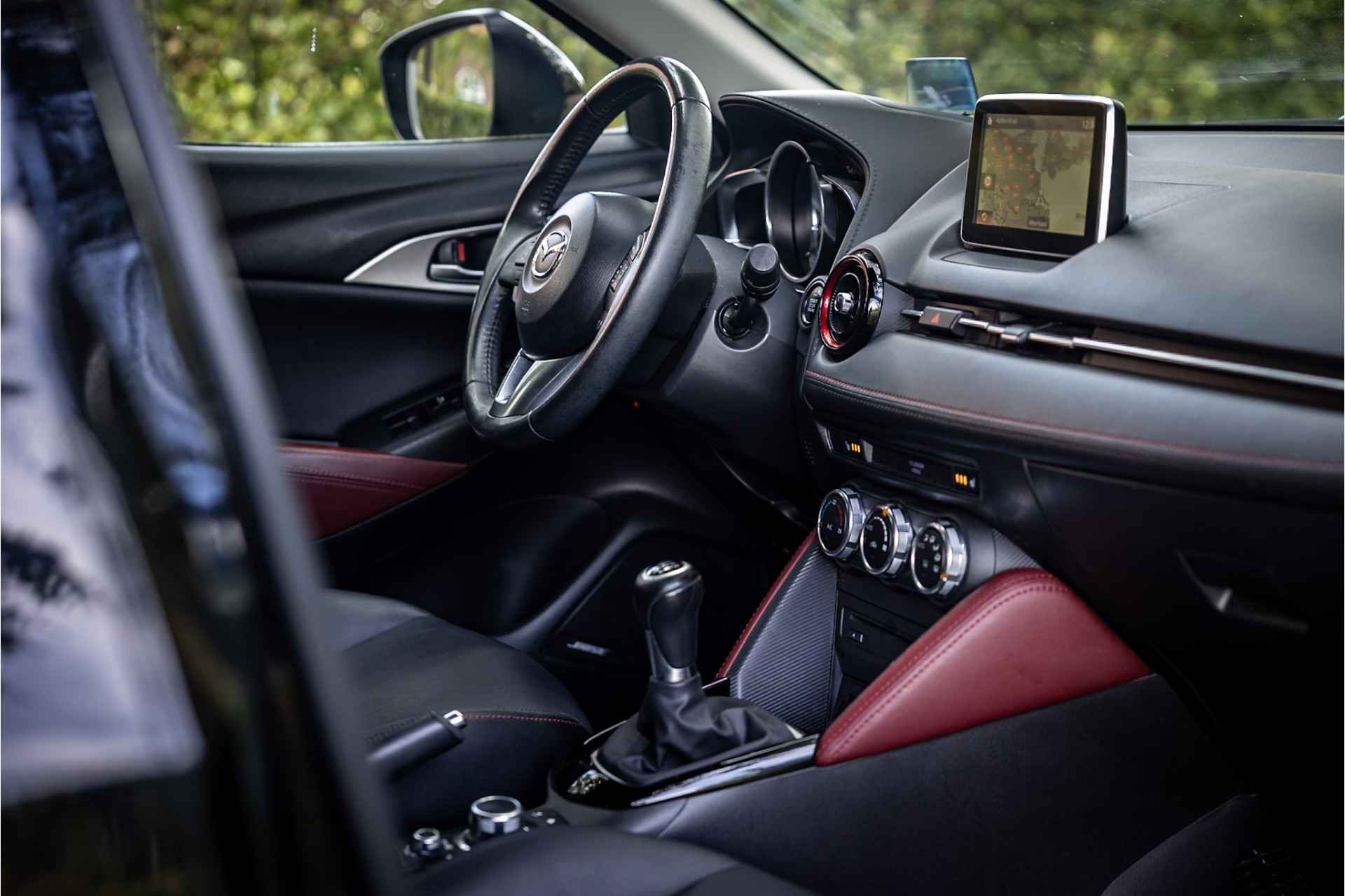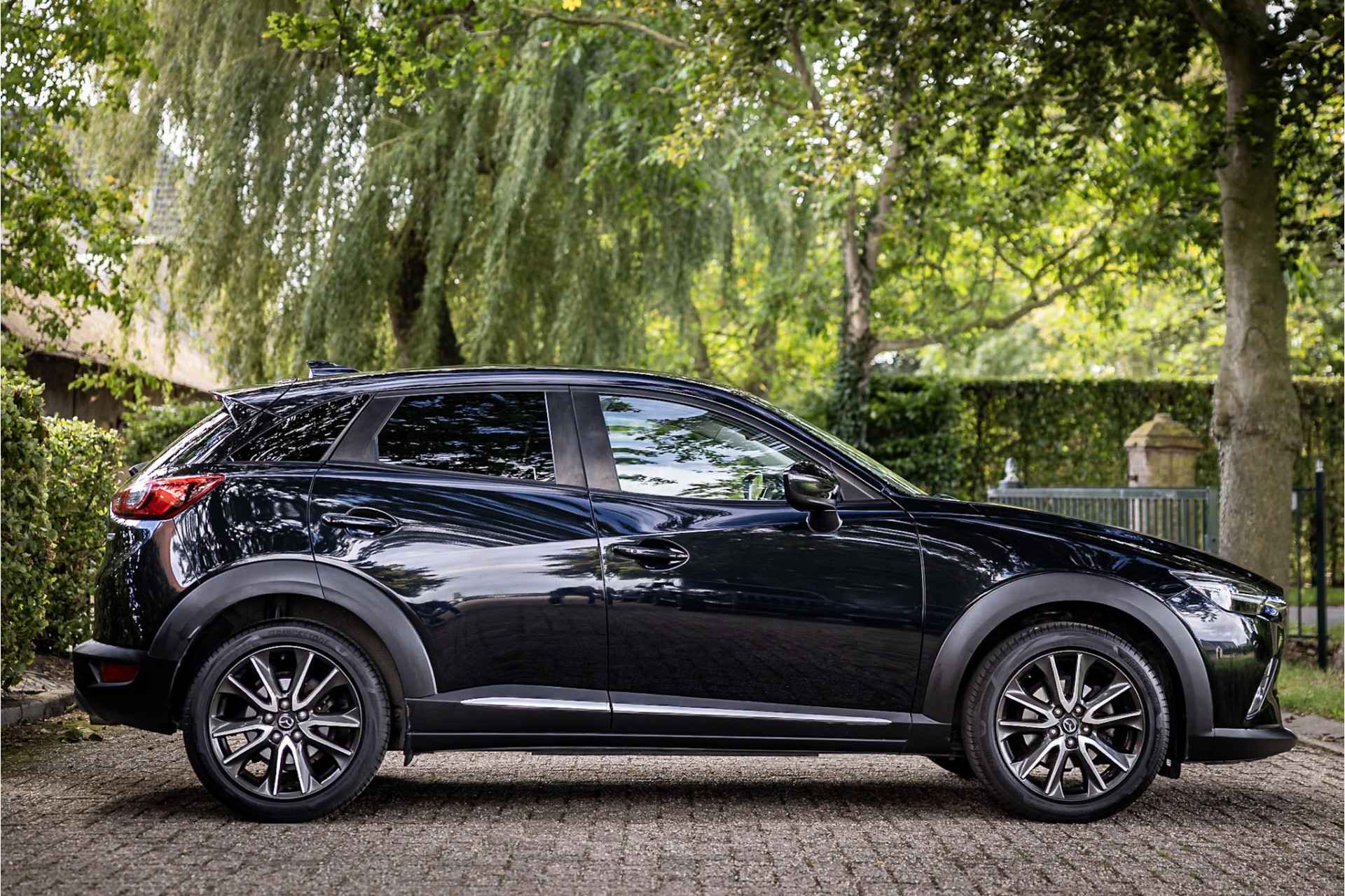 Leuke en stijlvol uitgevoerde Mazda CX-3 2.0 GT-M in keurige staat. Deze auto is nieuw in Nederland geleverd. Lakkleur is Jet Black metallic en het interieur is voorzien van zwart leder. Het dashboard en de bovenzijde van de portieren is afgewerkt met zwart leder.