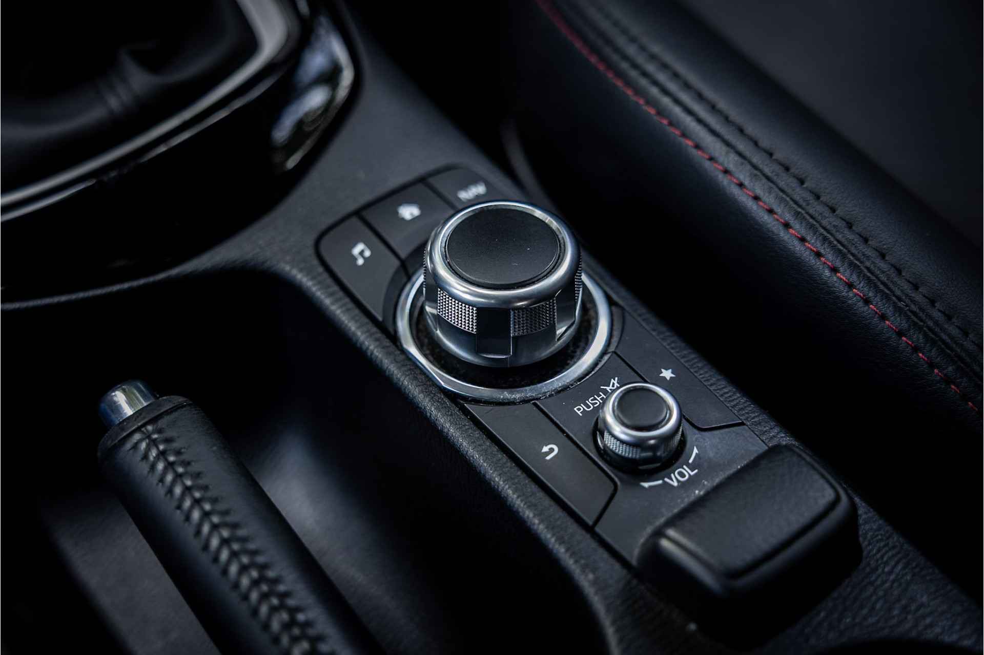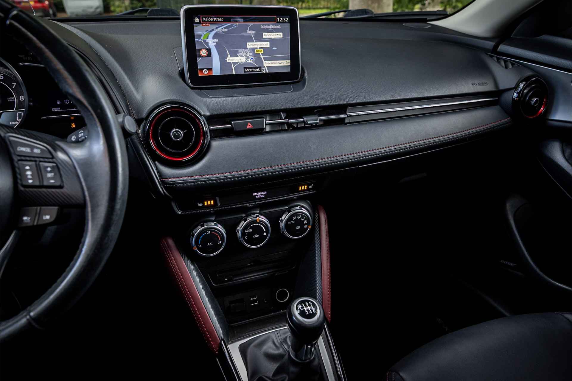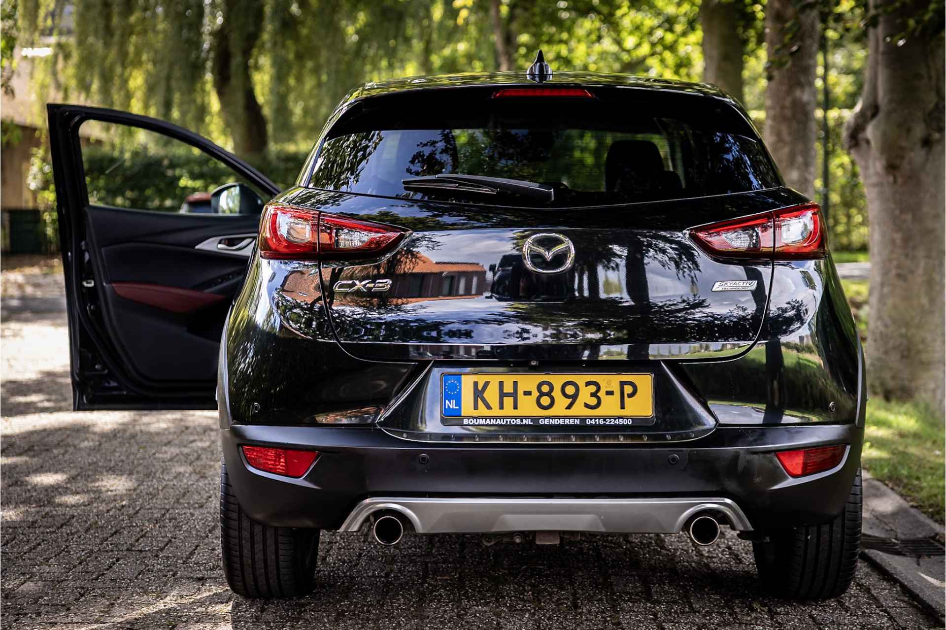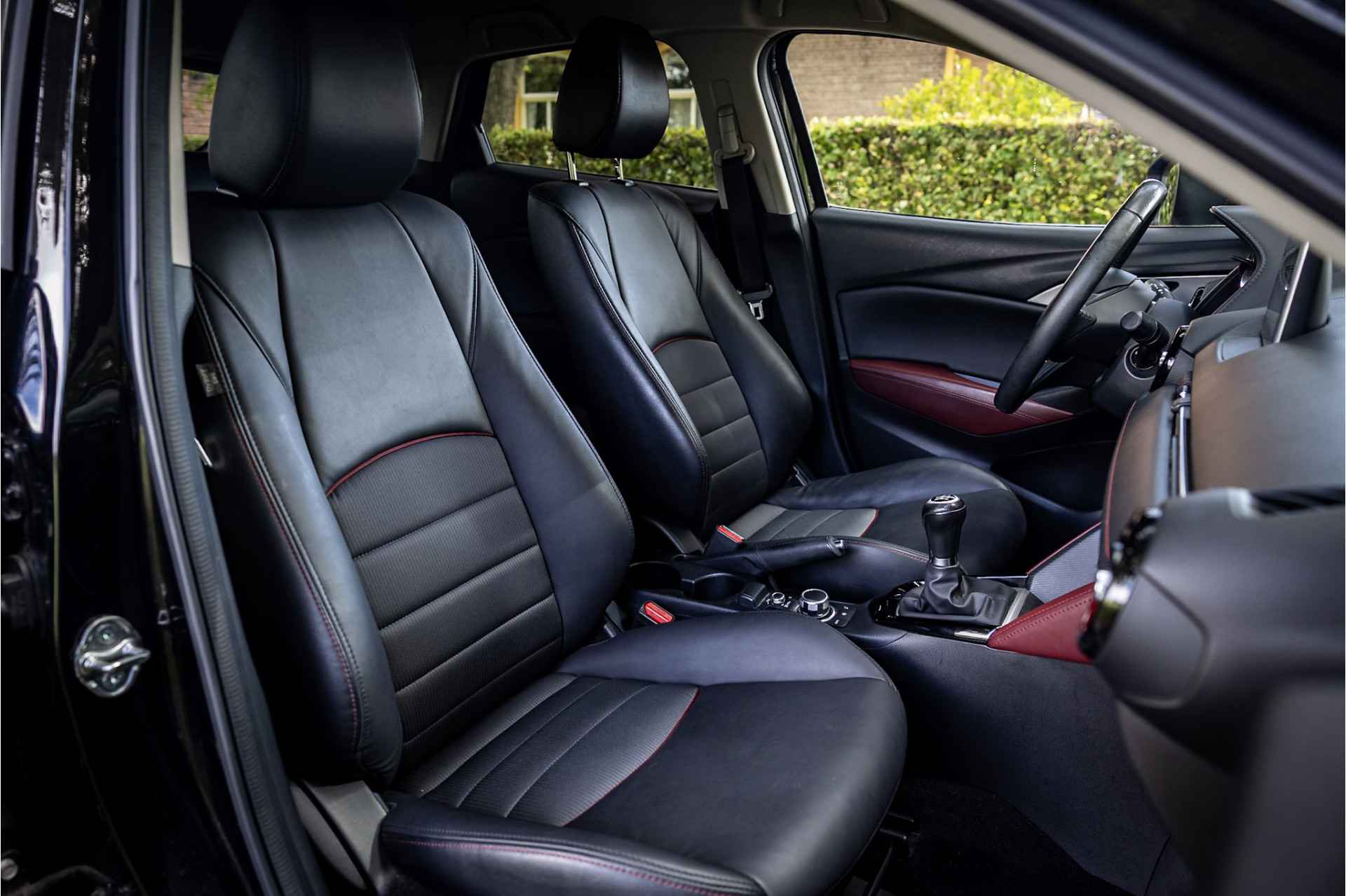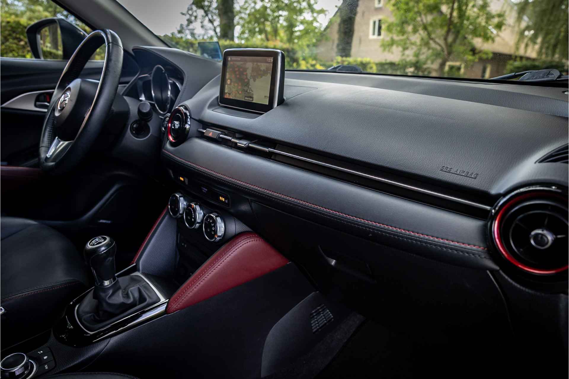 Leuke en stijlvol uitgevoerde Mazda CX-3 2.0 GT-M in keurige staat. Deze auto is nieuw in Nederland geleverd. Lakkleur is Jet Black metallic en het interieur is voorzien van zwart leder. Het dashboard en de bovenzijde van de portieren is afgewerkt met zwart leder.