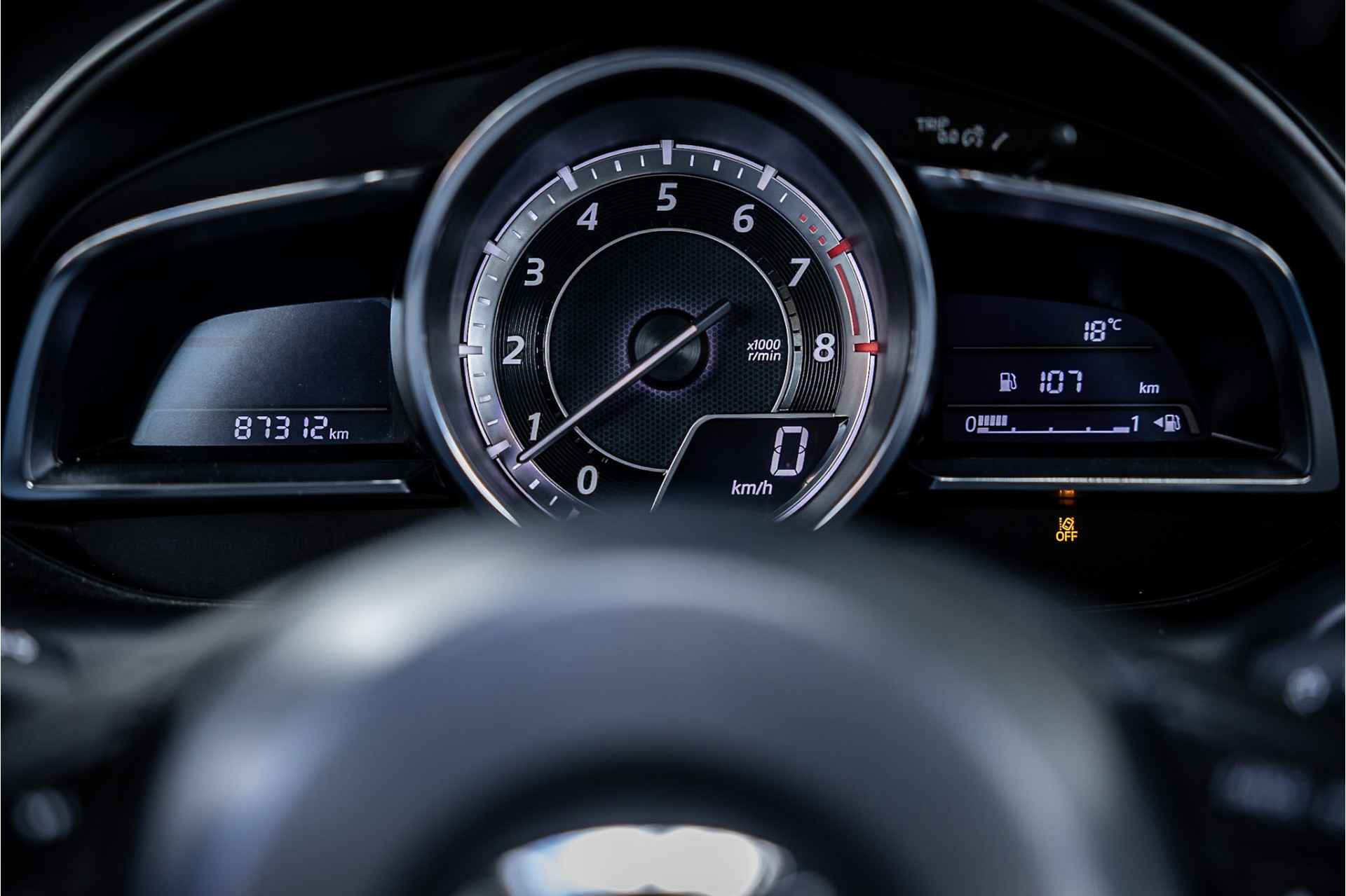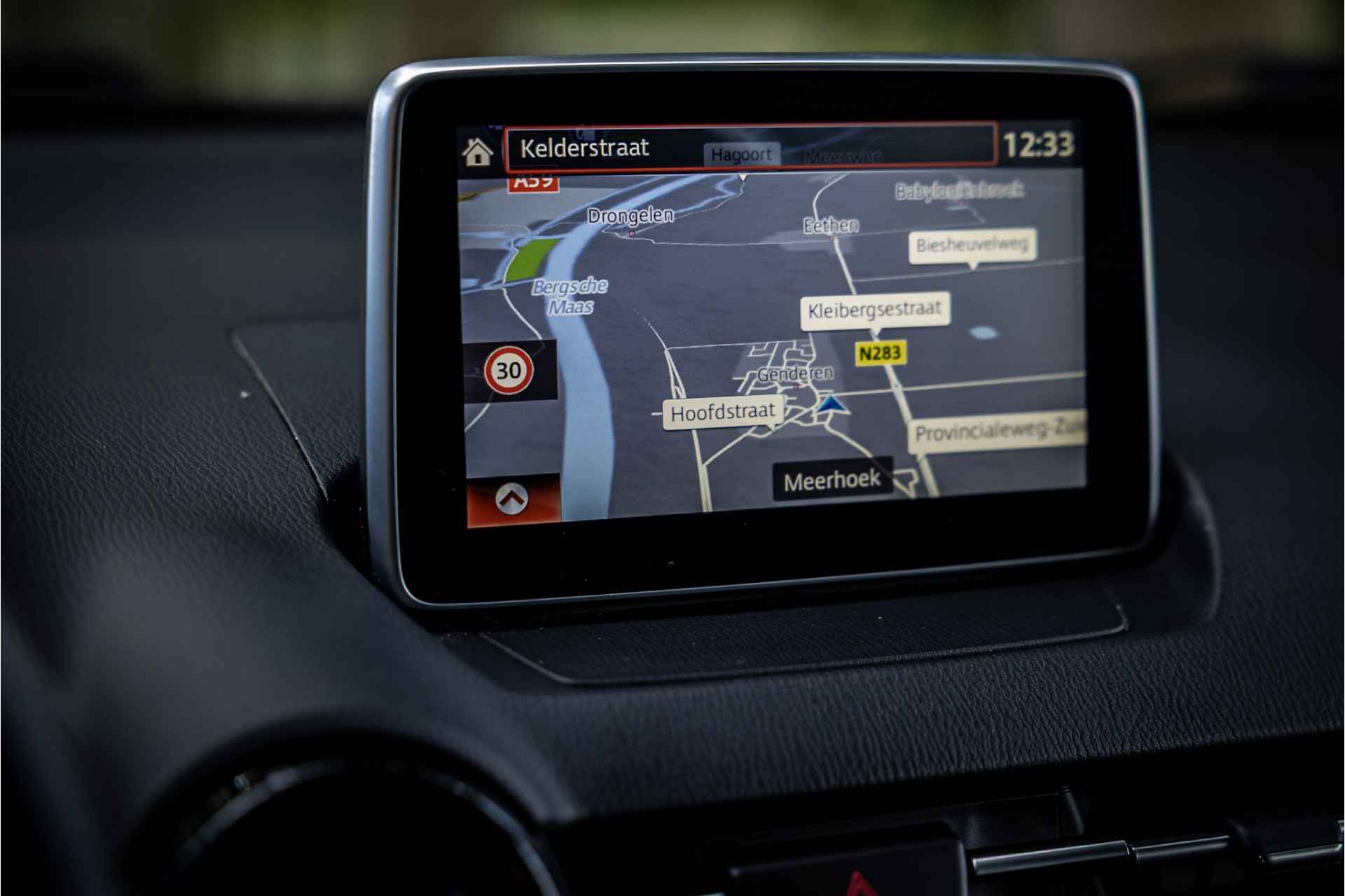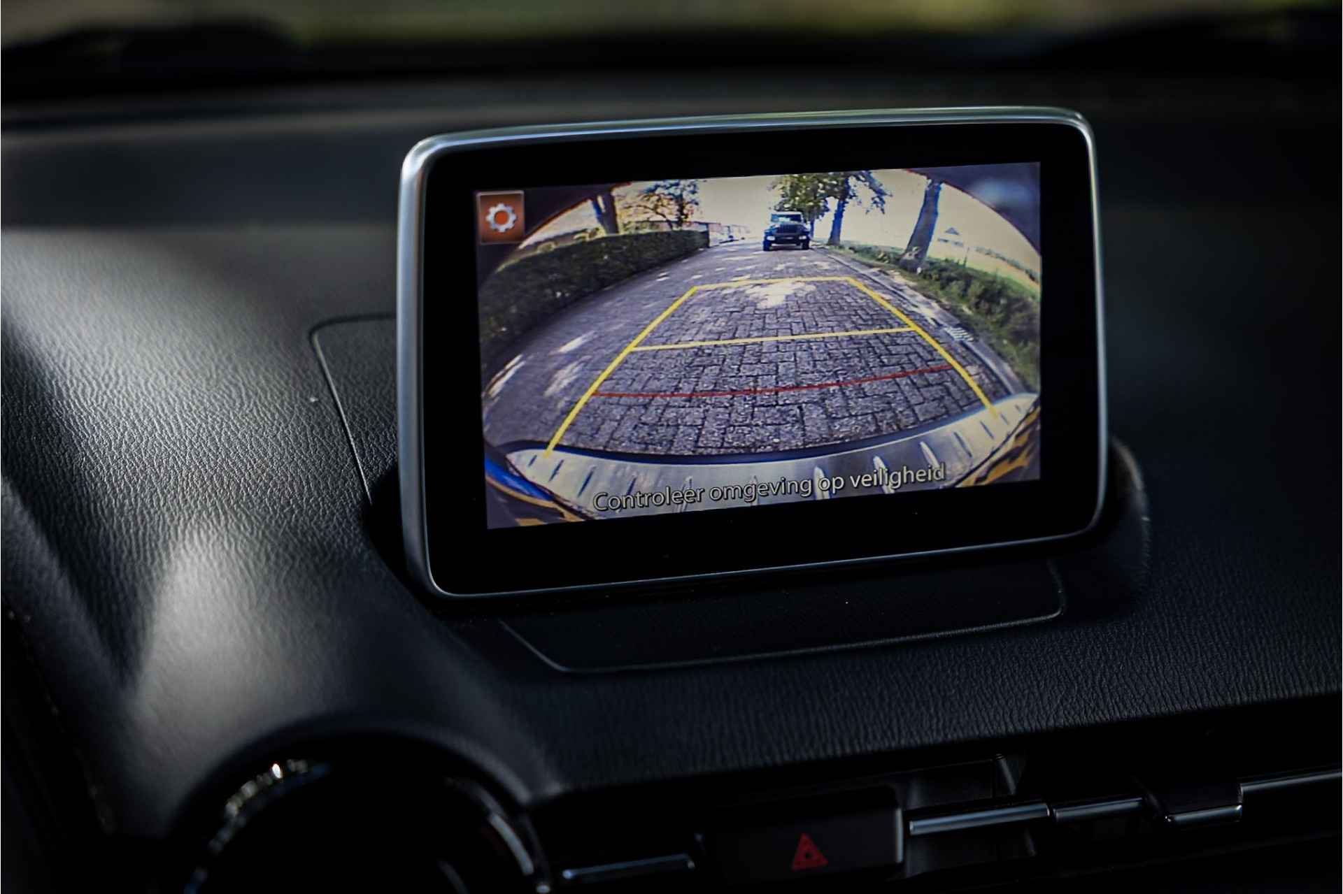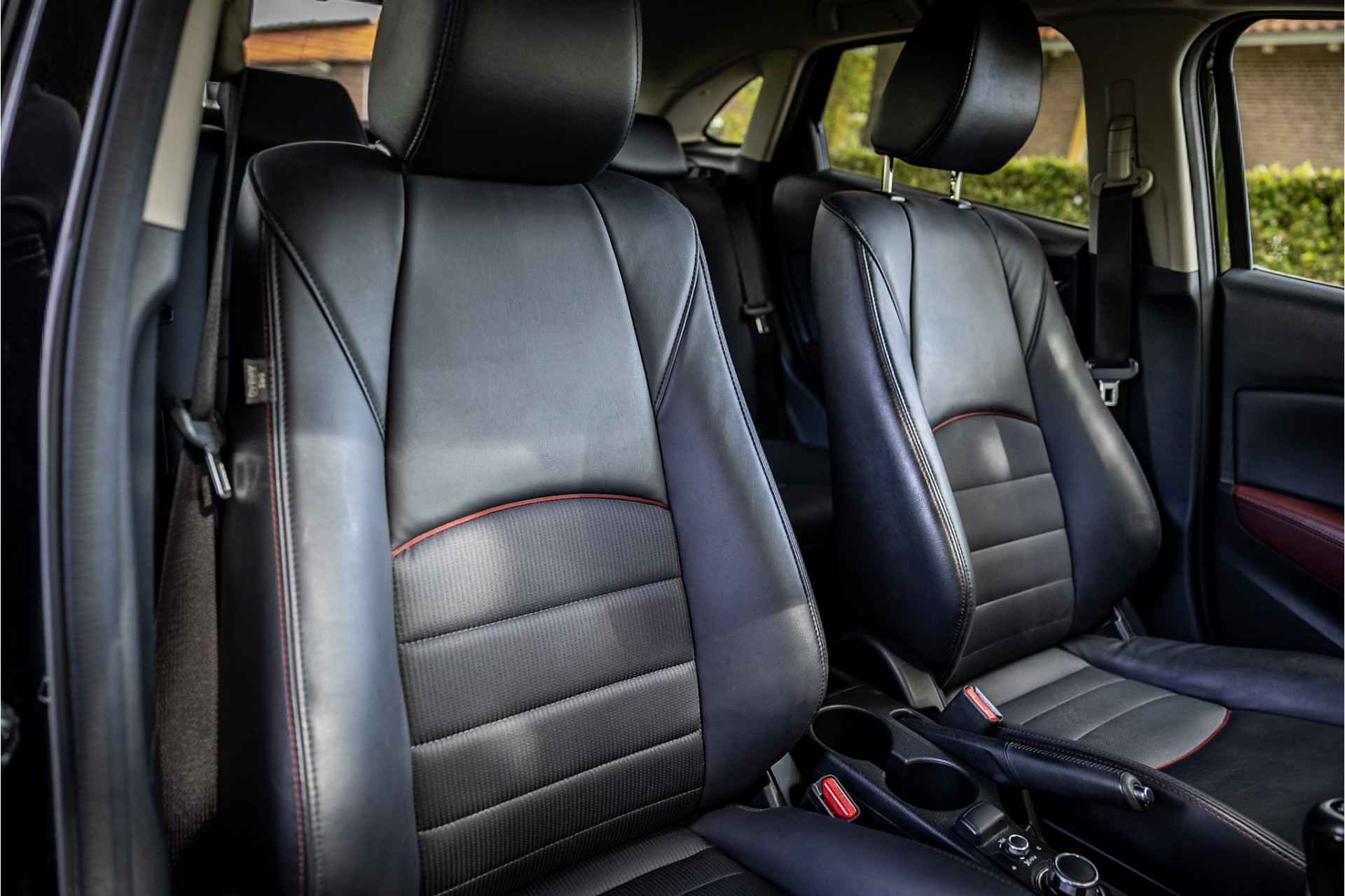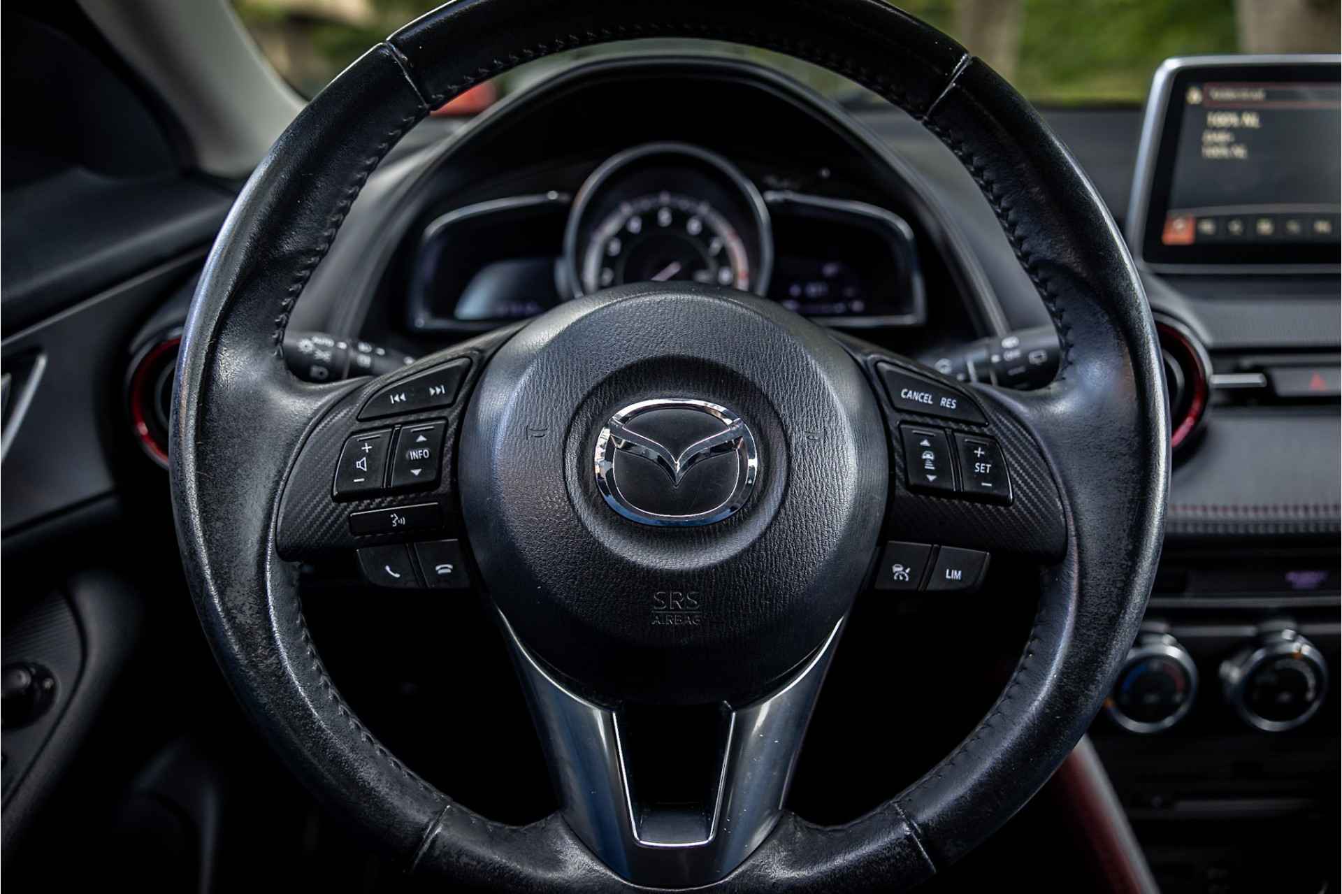 Leuke en stijlvol uitgevoerde Mazda CX-3 2.0 GT-M in keurige staat. Deze auto is nieuw in Nederland geleverd. Lakkleur is Jet Black metallic en het interieur is voorzien van zwart leder. Het dashboard en de bovenzijde van de portieren is afgewerkt met zwart leder.