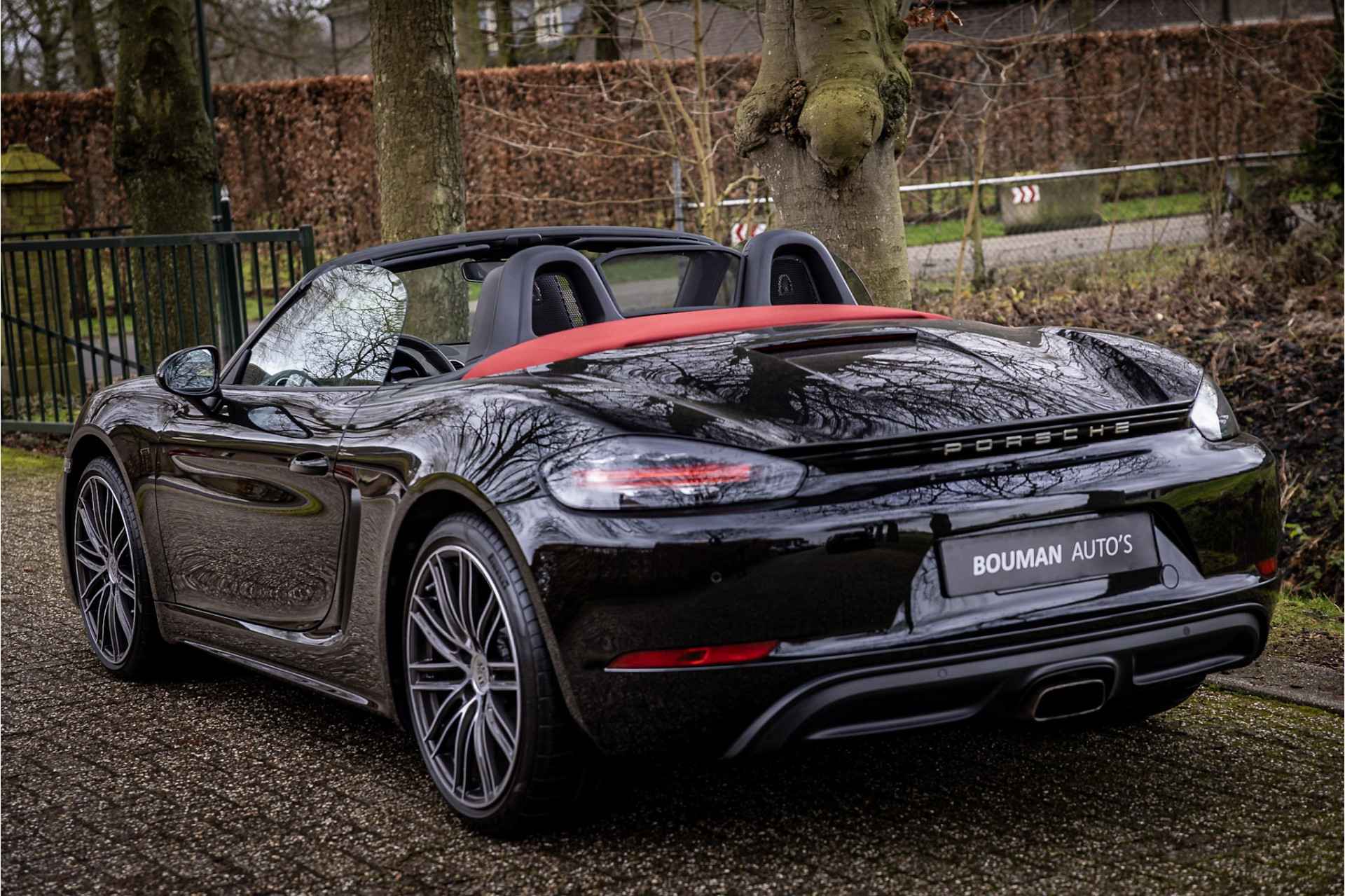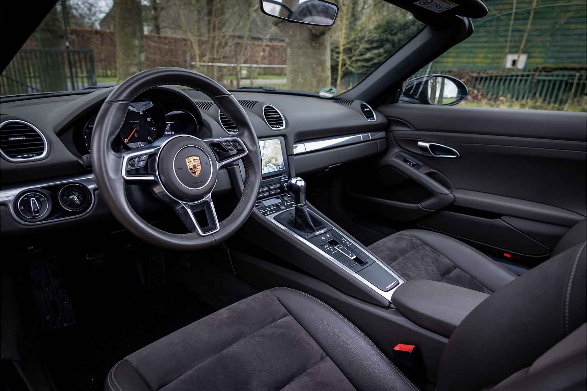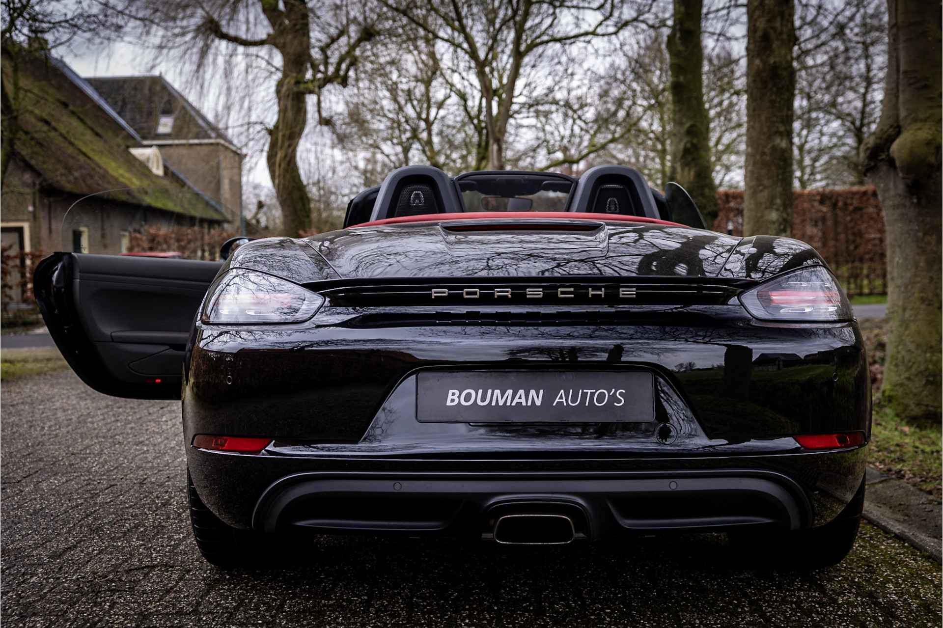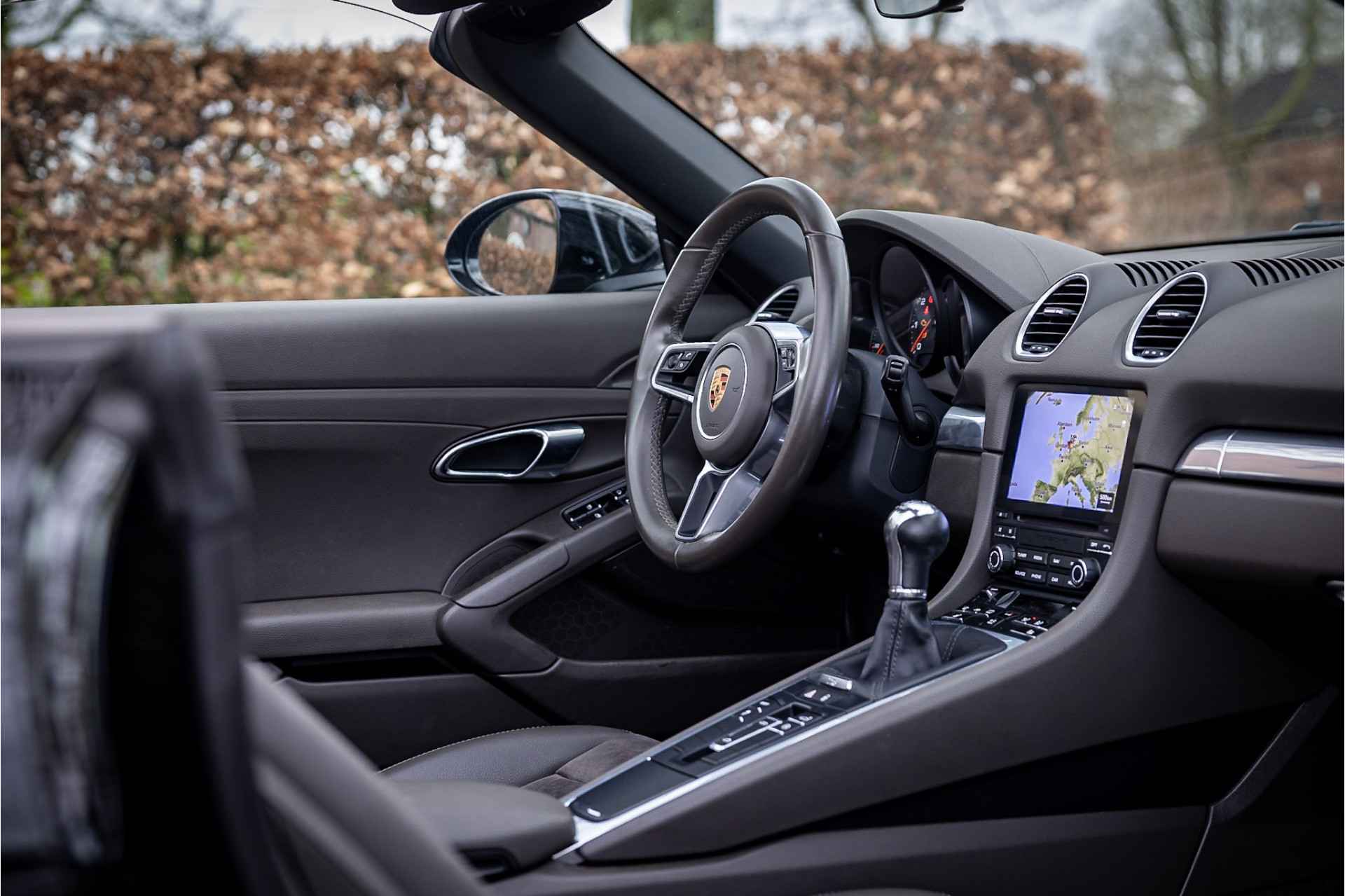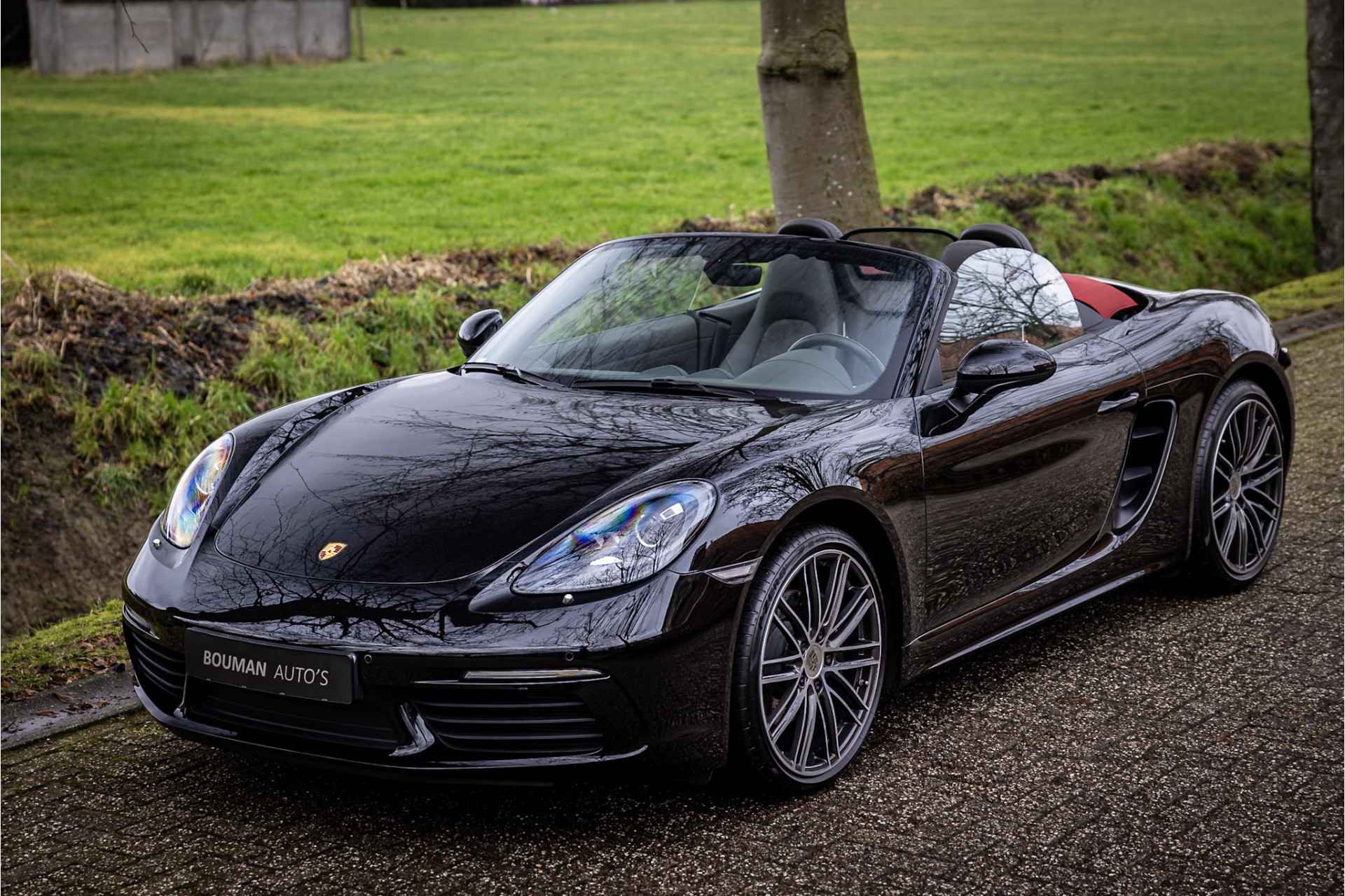 Fraaie Porsche Boxster 718 in handgeschakelde uitvoering. Deze auto is door ons in Duitsland aangekocht van de eerste eigenaar. De volledige Porsche dealer onderhoudshistorie is aanwezig. Lakkleur is Schwarz en het interieur is voorzien van sportstoelen in Achatgrau. De cabrioletkap is uitgevoerd in rood. Het 20" Turbo wiel versterkt de dynamische uitstraling van de auto.