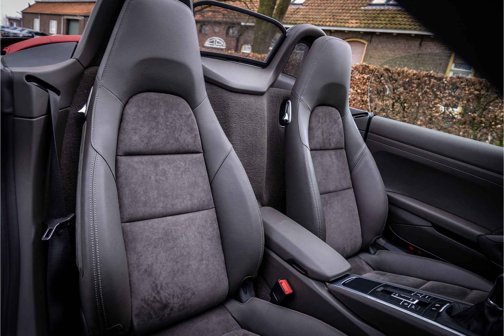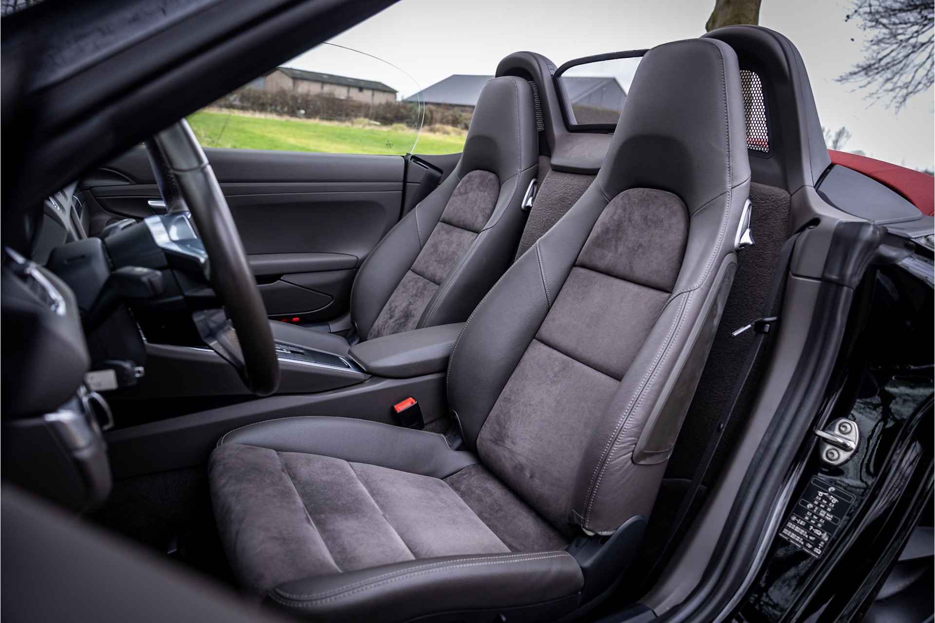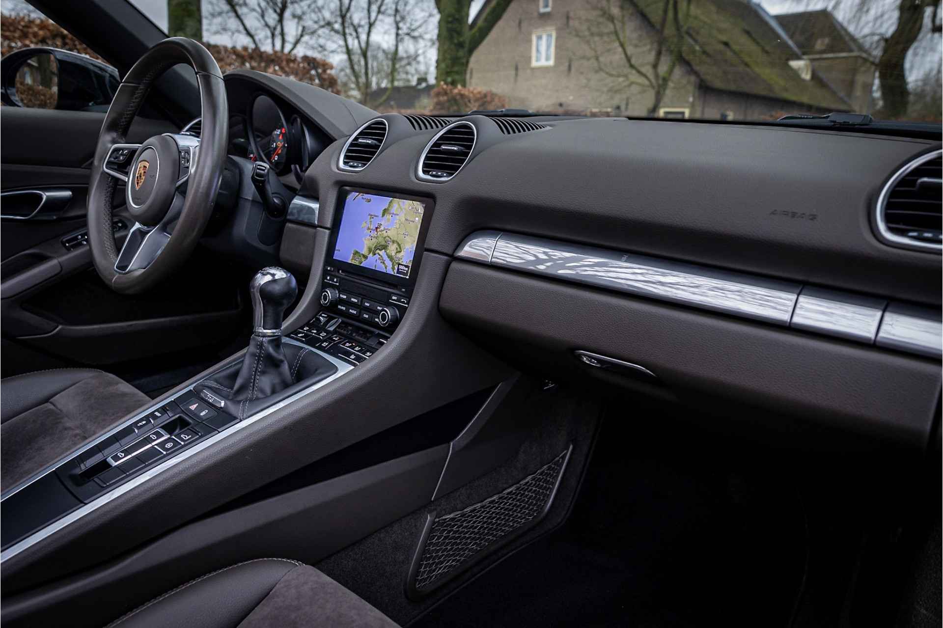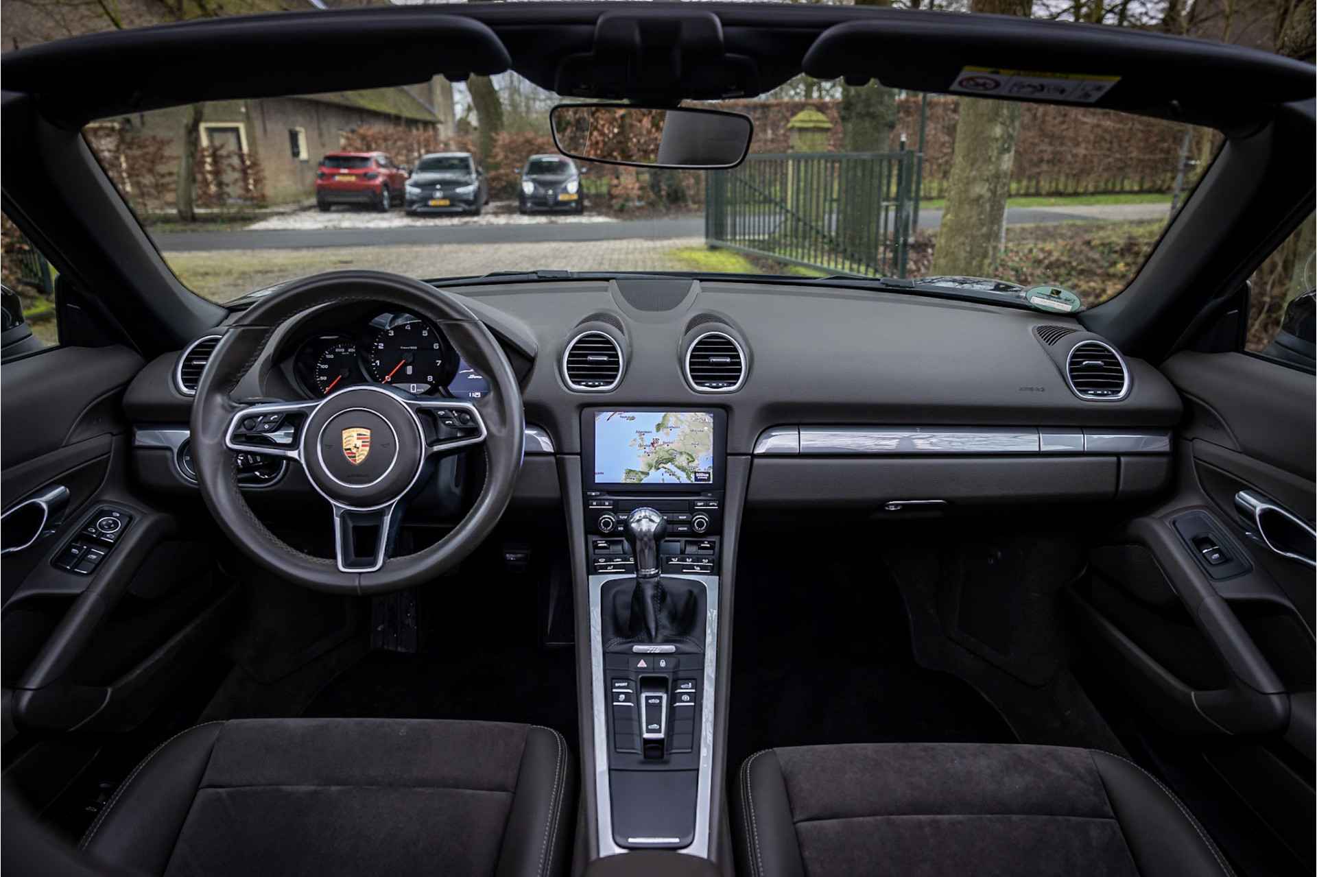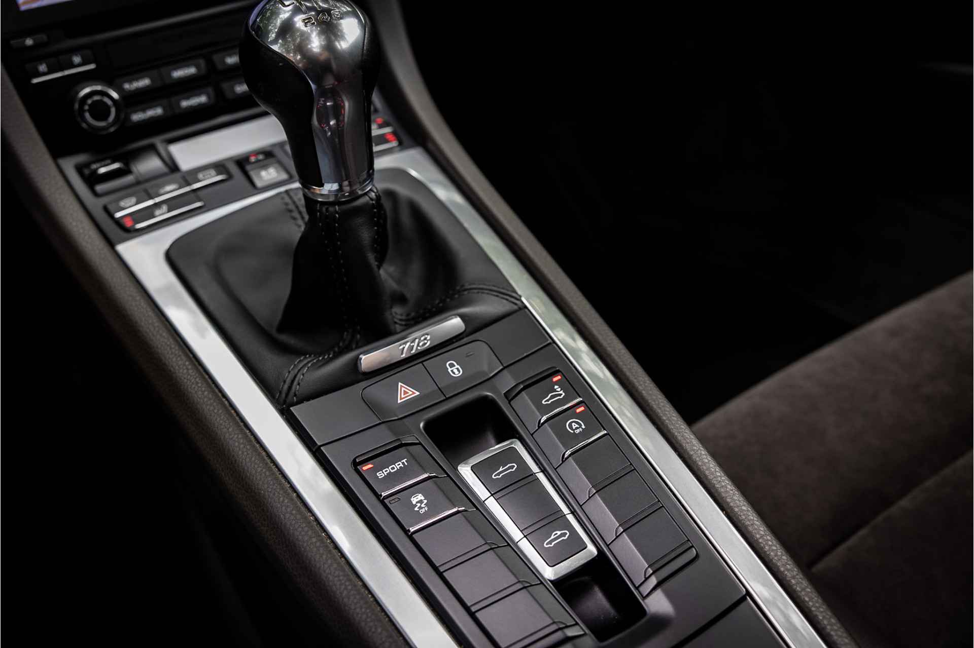 Fraaie Porsche Boxster 718 in handgeschakelde uitvoering. Deze auto is door ons in Duitsland aangekocht van de eerste eigenaar. De volledige Porsche dealer onderhoudshistorie is aanwezig. Lakkleur is Schwarz en het interieur is voorzien van sportstoelen in Achatgrau. De cabrioletkap is uitgevoerd in rood. Het 20" Turbo wiel versterkt de dynamische uitstraling van de auto.