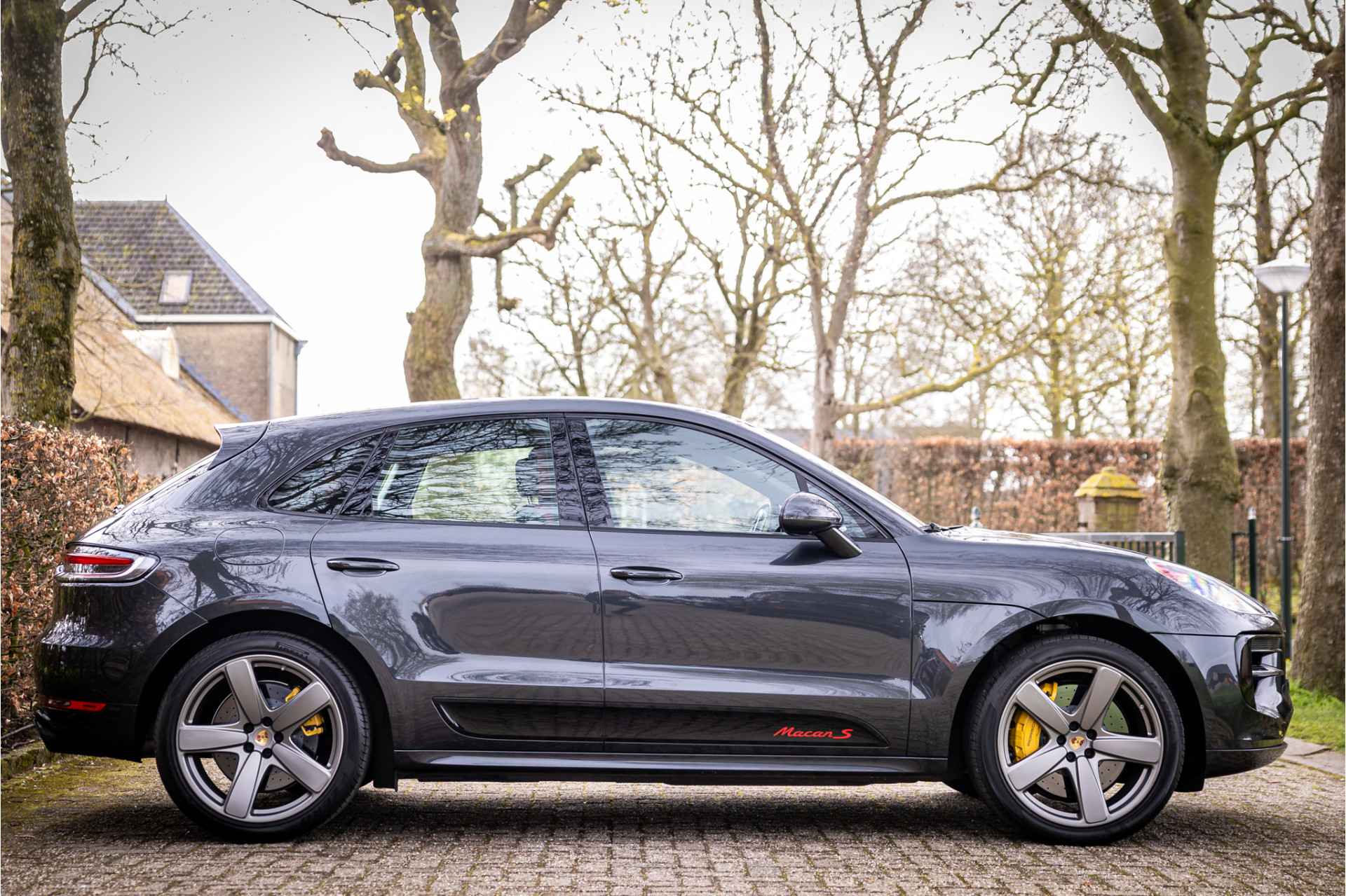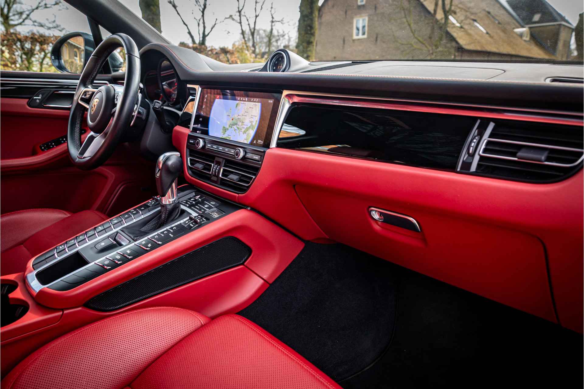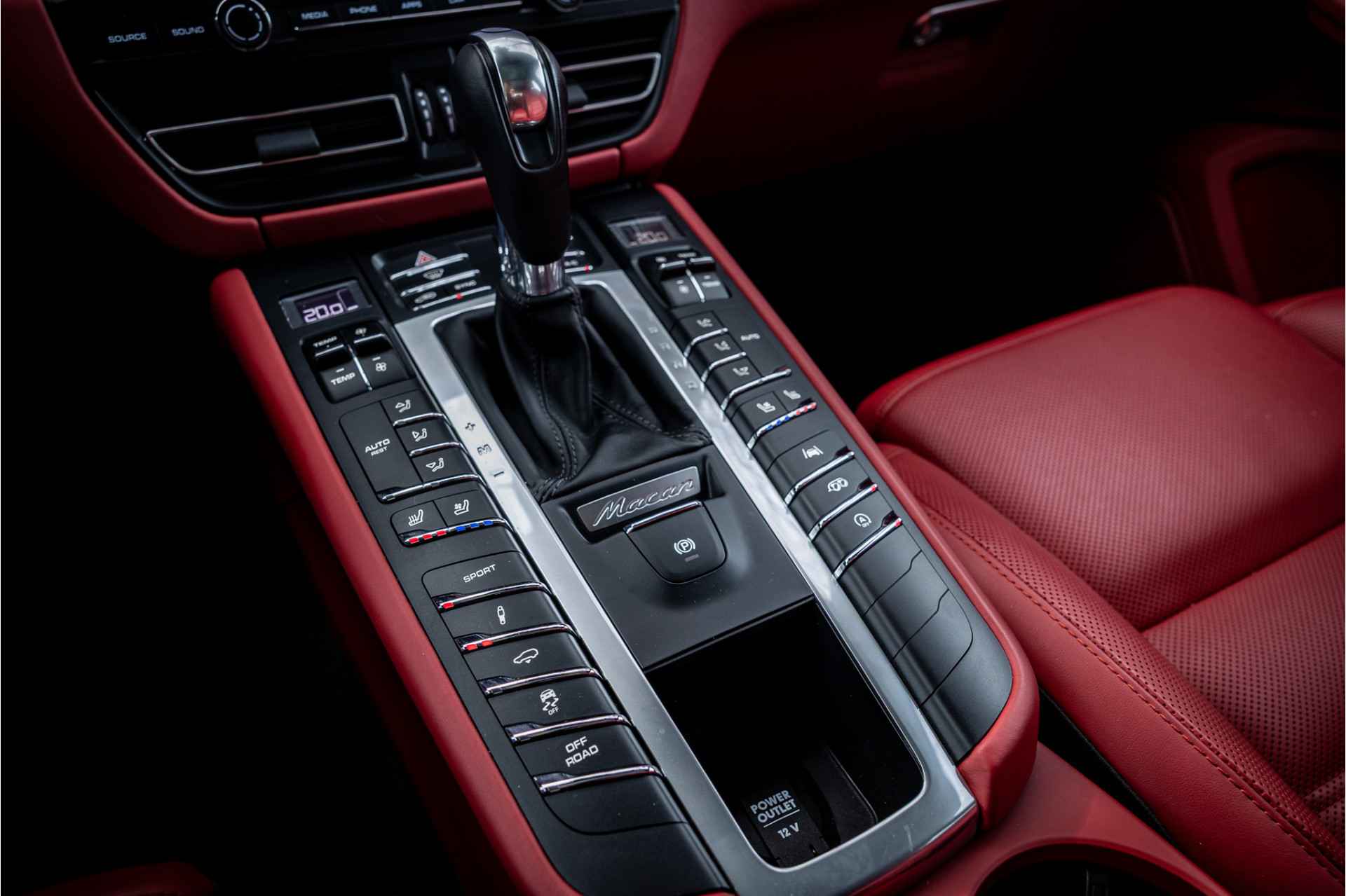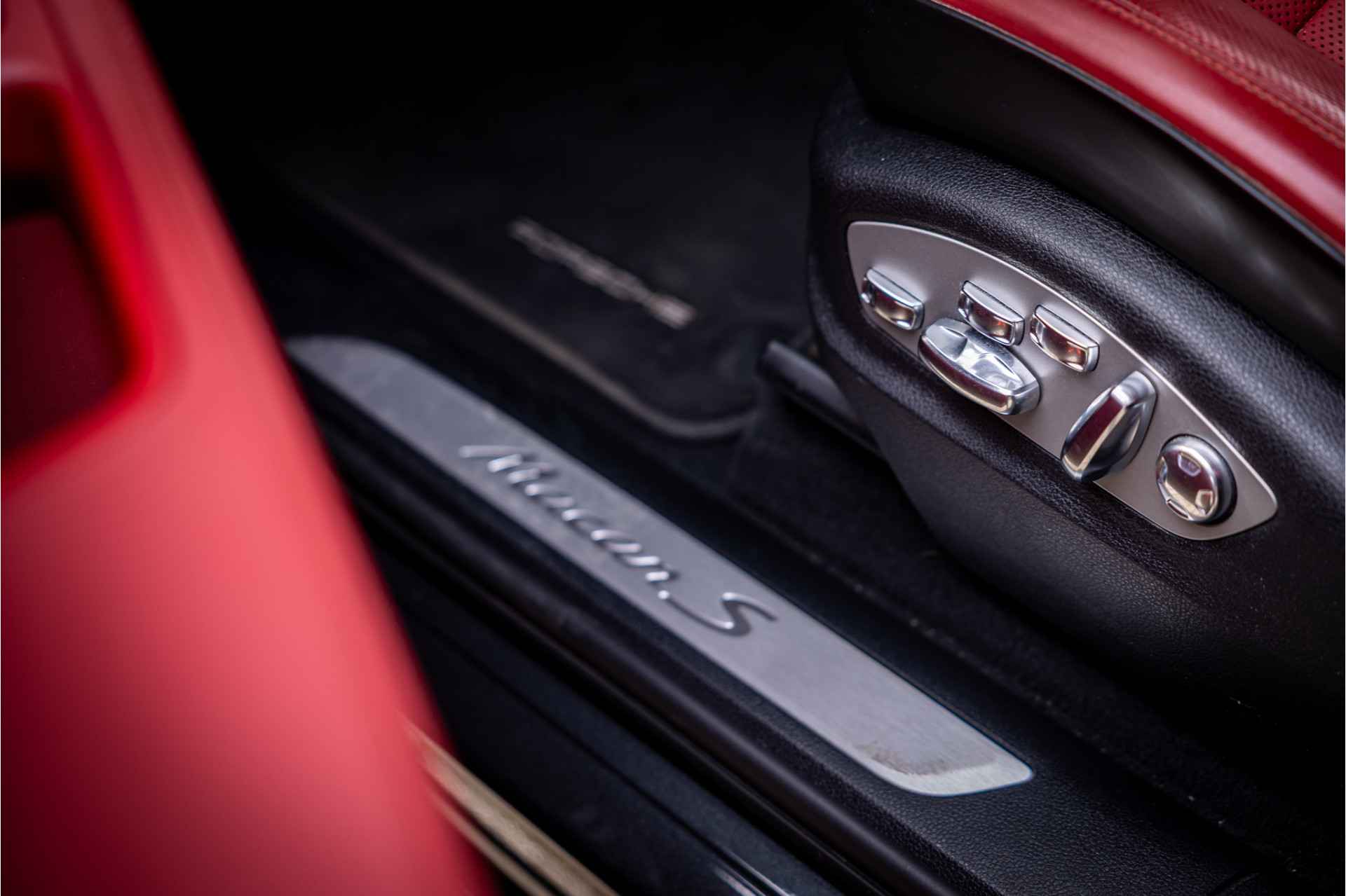 Prachtig uitgevoerde Porsche Macan S in fraaie kleurstelling en bijzondere opties. Deze auto is nieuw in Nederland geleverd en afkomstig van de eerste eigenaar. Lakkleur is Vulkangrau metallic en het interieur is voorzien van adaptieve sportstoelen bekleed met bi-color zwart-granaatrood leder. De hoofdsteunen zijn voorzien van het Porsche logo. De bovenzijde van het dashboard en portieren is afgewerkt met zwart leder en eveneens met rood stiksel. De hemelbekleding is uitgevoerd in de kleur zwart. De modelaanduiding op de sideblades is uitgevoerd in rood en de raamlijsten zijn hoogglans zwart.