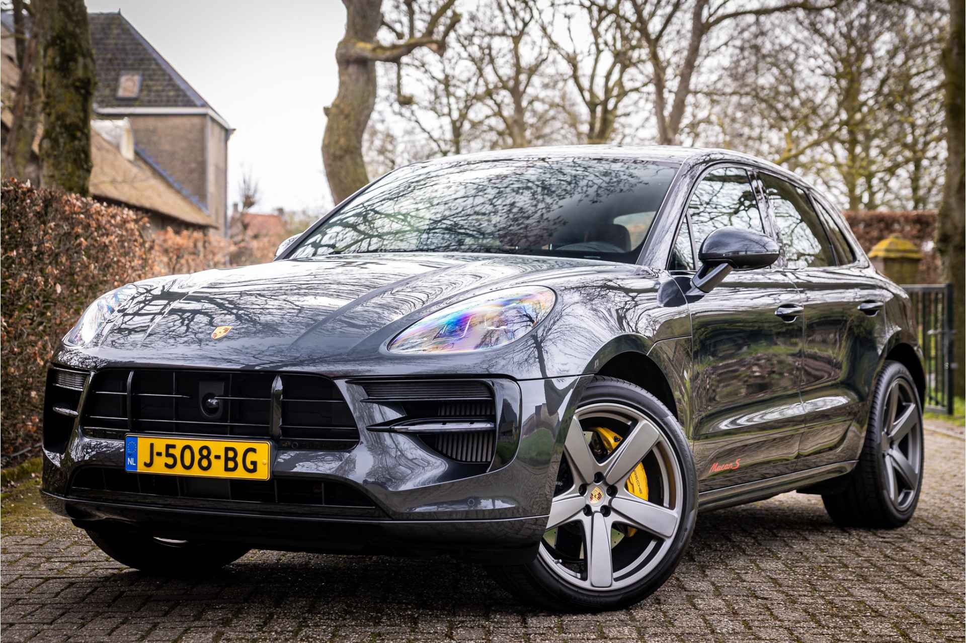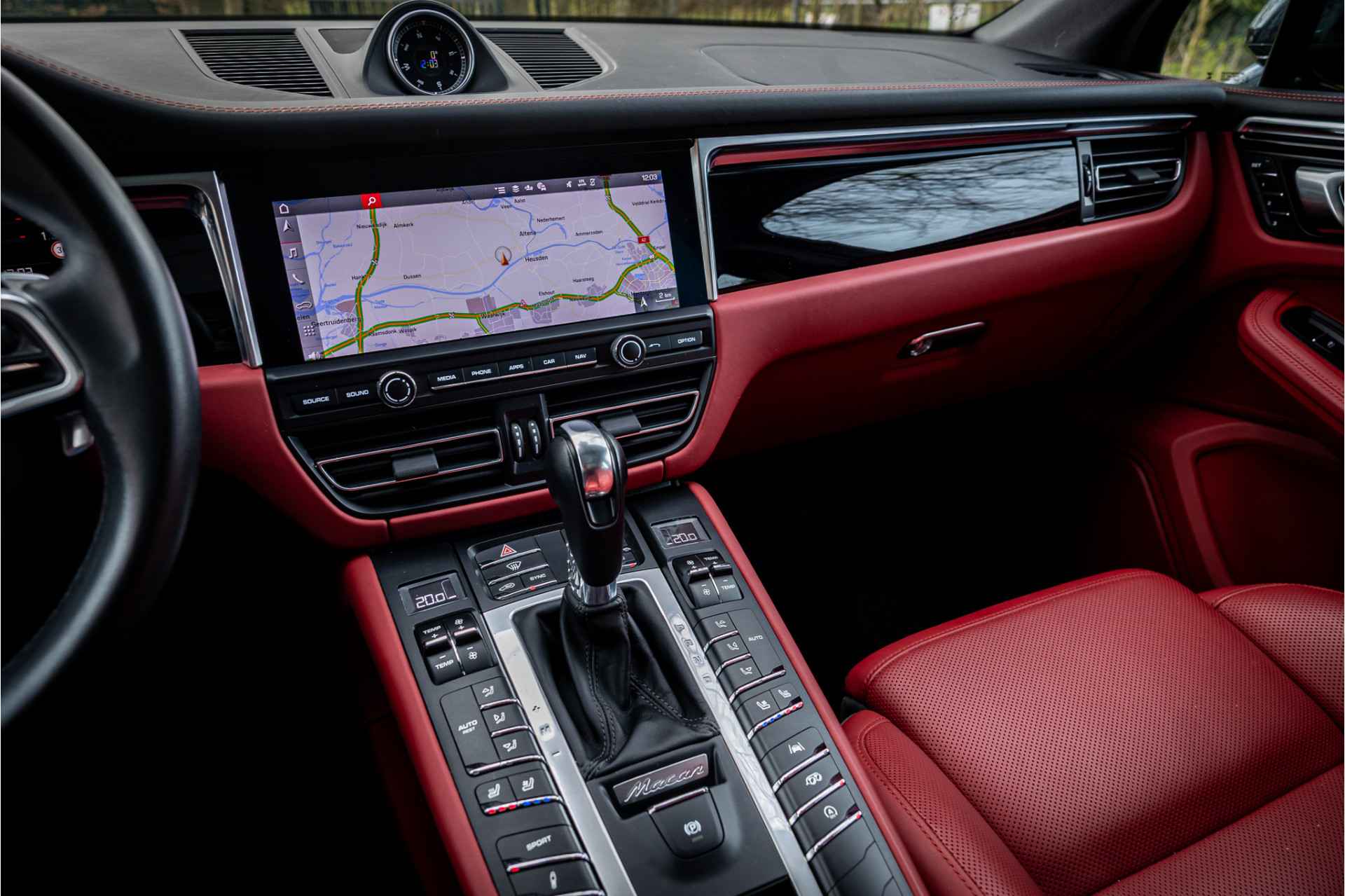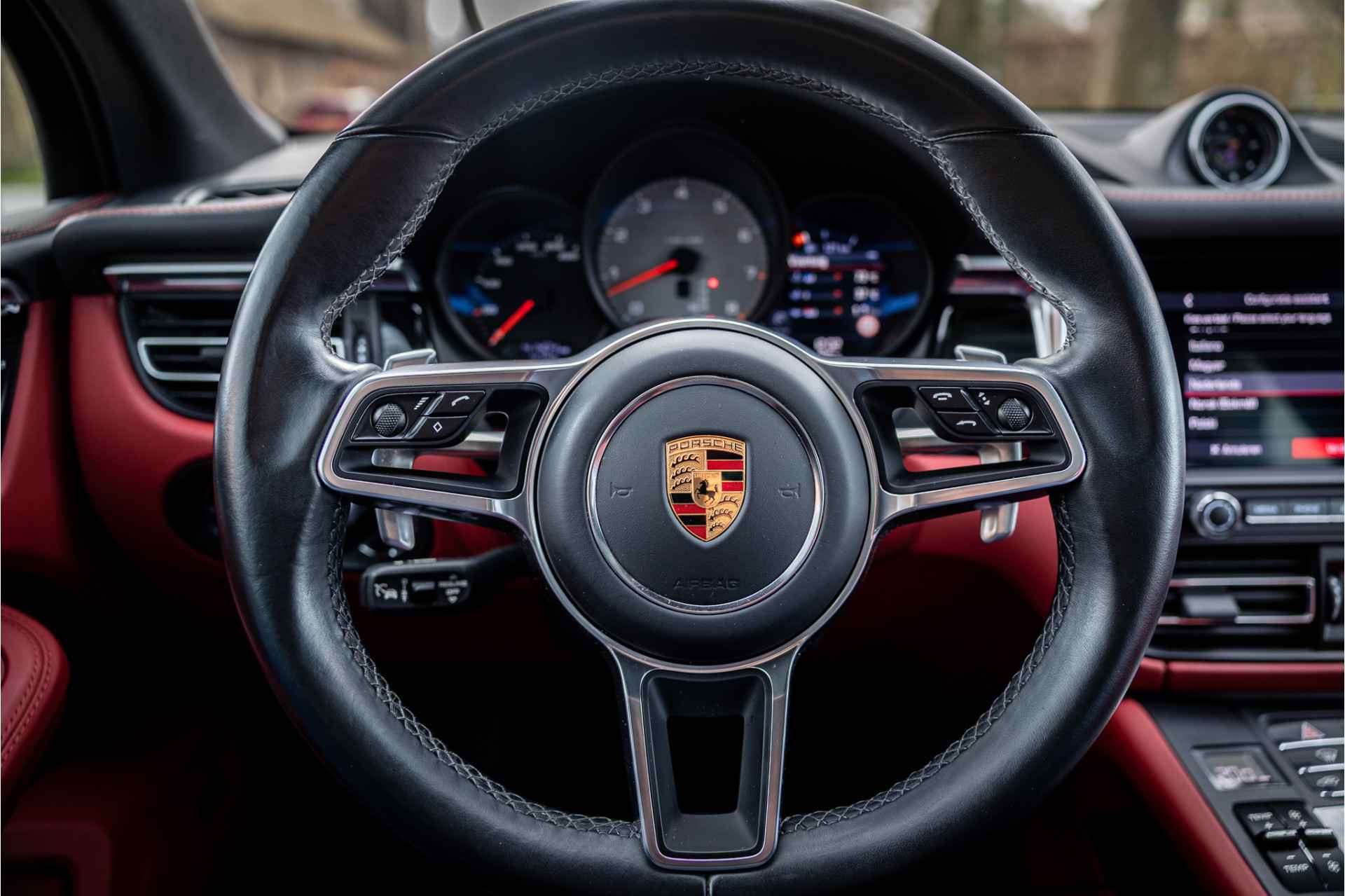 Prachtig uitgevoerde Porsche Macan S in fraaie kleurstelling en bijzondere opties. Deze auto is nieuw in Nederland geleverd en afkomstig van de eerste eigenaar. Lakkleur is Vulkangrau metallic en het interieur is voorzien van adaptieve sportstoelen bekleed met bi-color zwart-granaatrood leder. De hoofdsteunen zijn voorzien van het Porsche logo. De bovenzijde van het dashboard en portieren is afgewerkt met zwart leder en eveneens met rood stiksel. De hemelbekleding is uitgevoerd in de kleur zwart. De modelaanduiding op de sideblades is uitgevoerd in rood en de raamlijsten zijn hoogglans zwart.