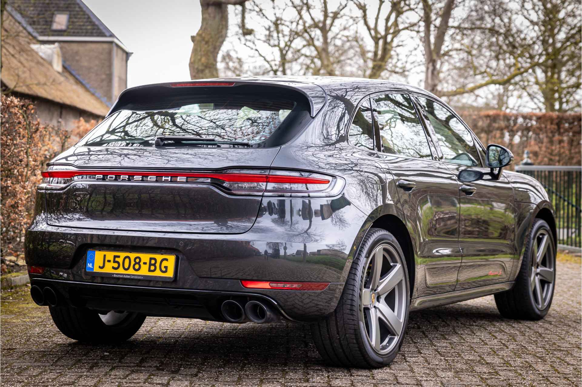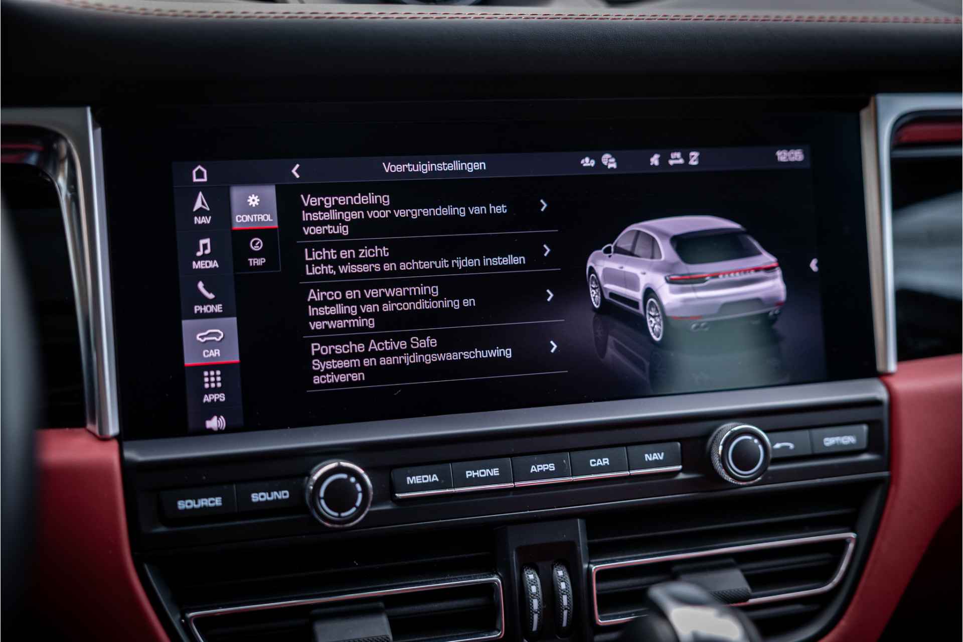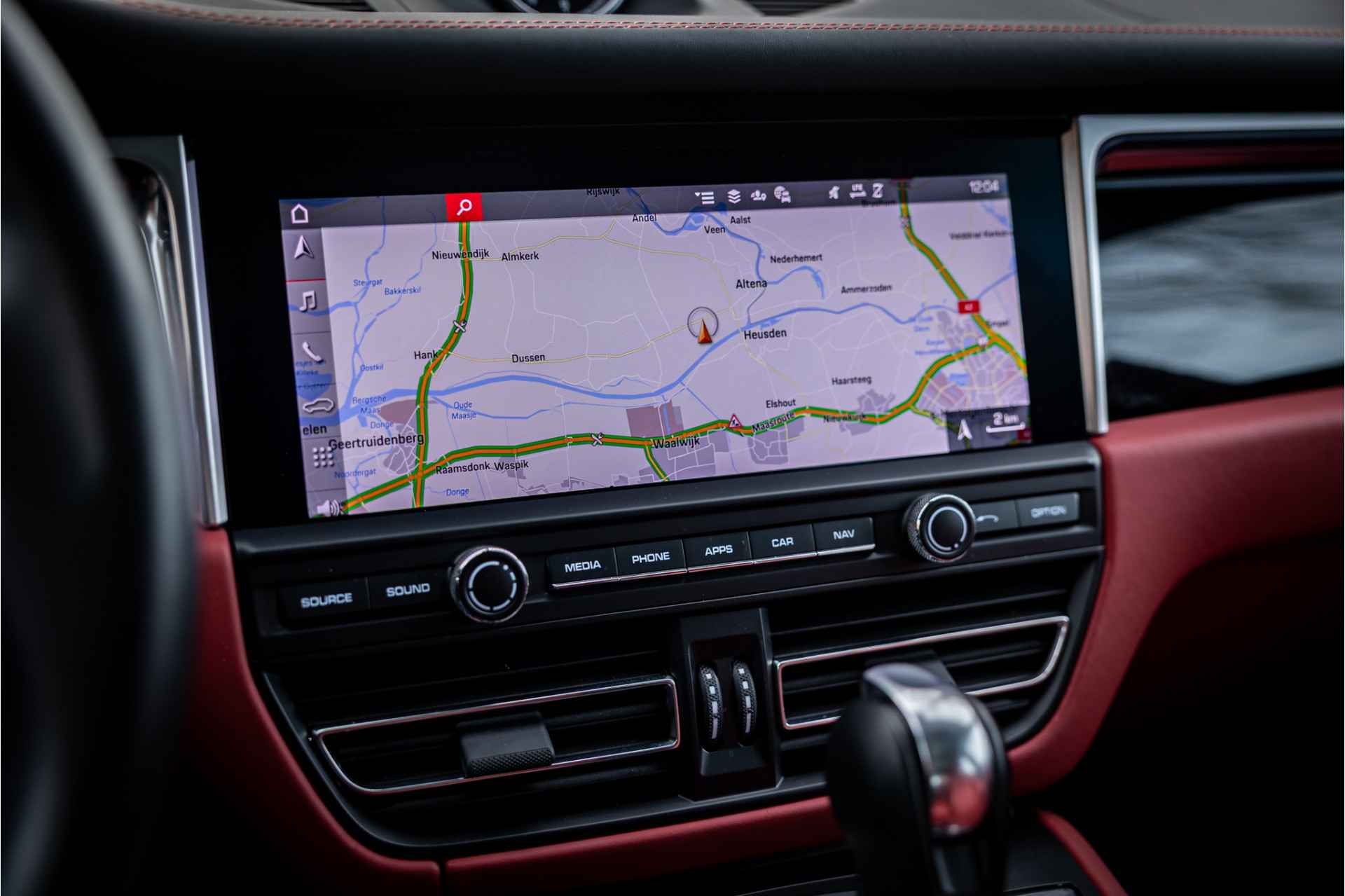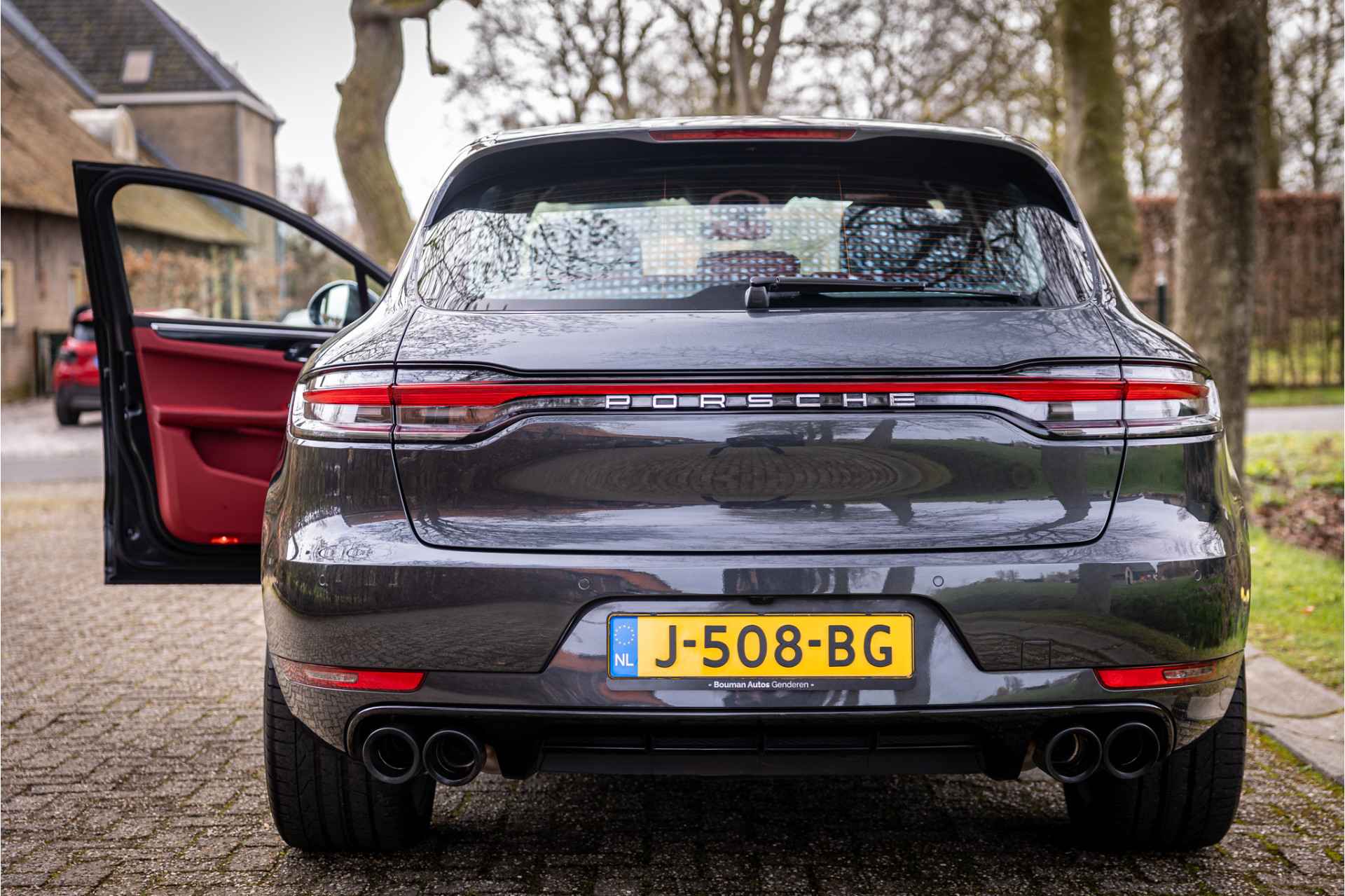 Prachtig uitgevoerde Porsche Macan S in fraaie kleurstelling en bijzondere opties. Deze auto is nieuw in Nederland geleverd en afkomstig van de eerste eigenaar. Lakkleur is Vulkangrau metallic en het interieur is voorzien van adaptieve sportstoelen bekleed met bi-color zwart-granaatrood leder. De hoofdsteunen zijn voorzien van het Porsche logo. De bovenzijde van het dashboard en portieren is afgewerkt met zwart leder en eveneens met rood stiksel. De hemelbekleding is uitgevoerd in de kleur zwart. De modelaanduiding op de sideblades is uitgevoerd in rood en de raamlijsten zijn hoogglans zwart.