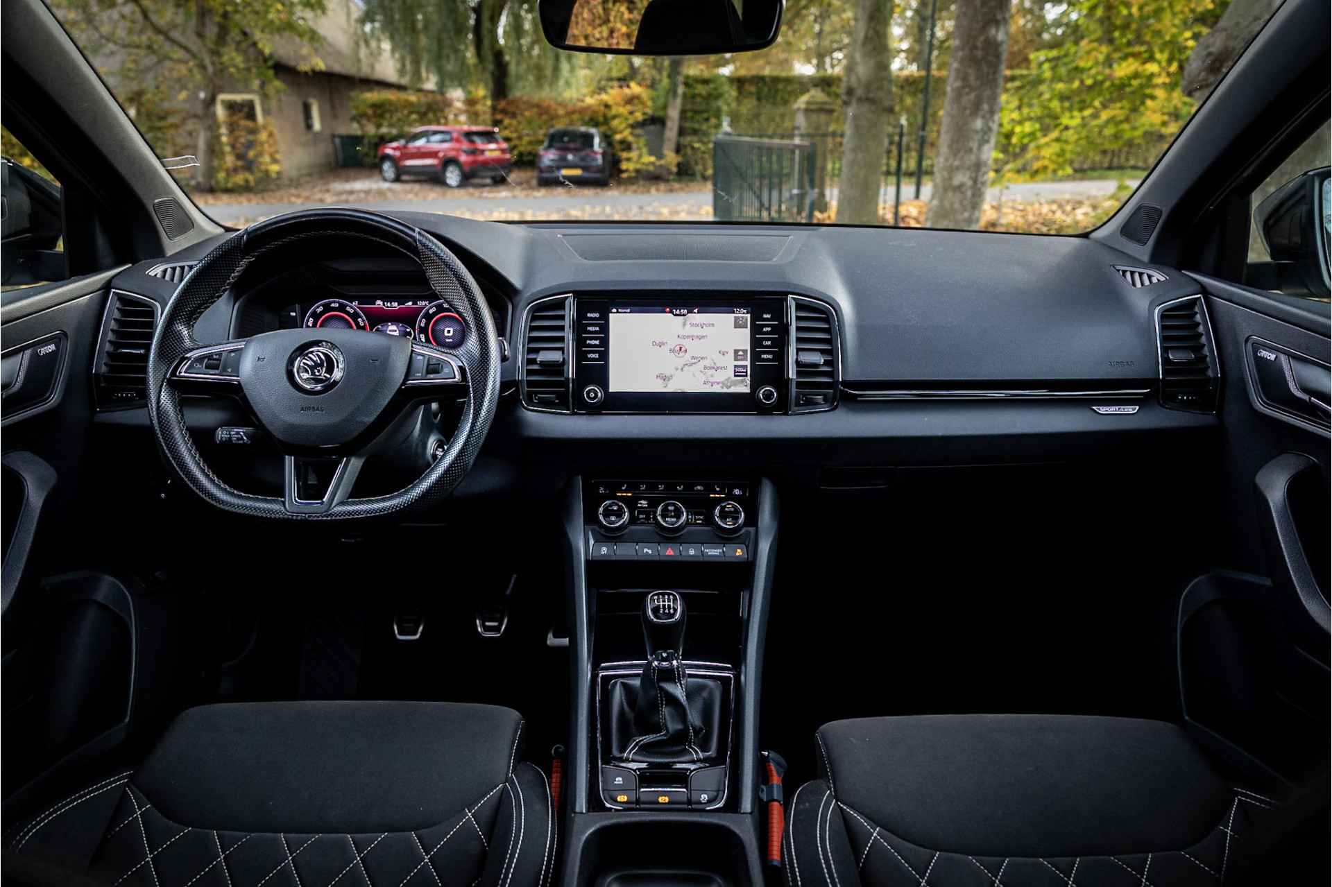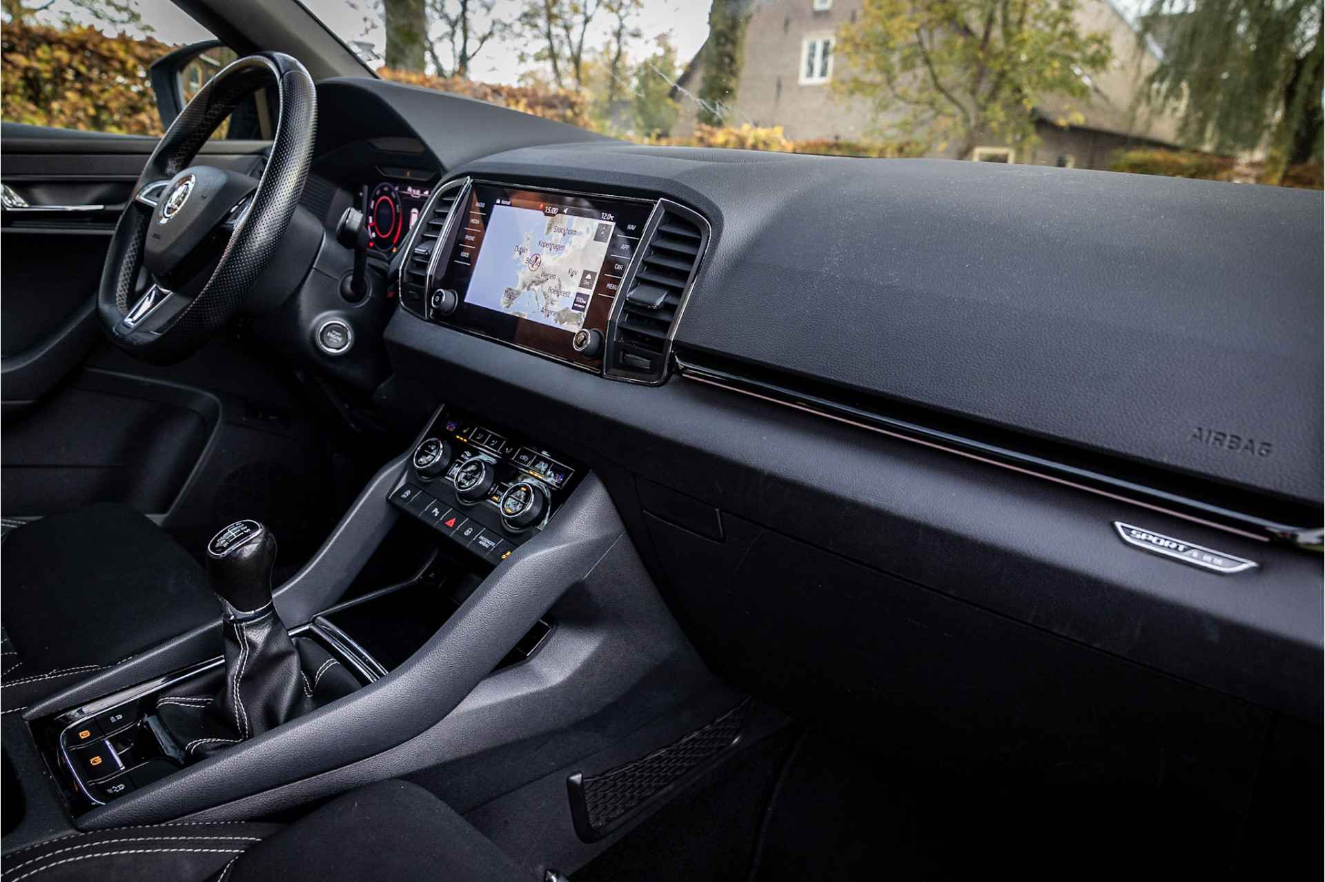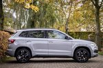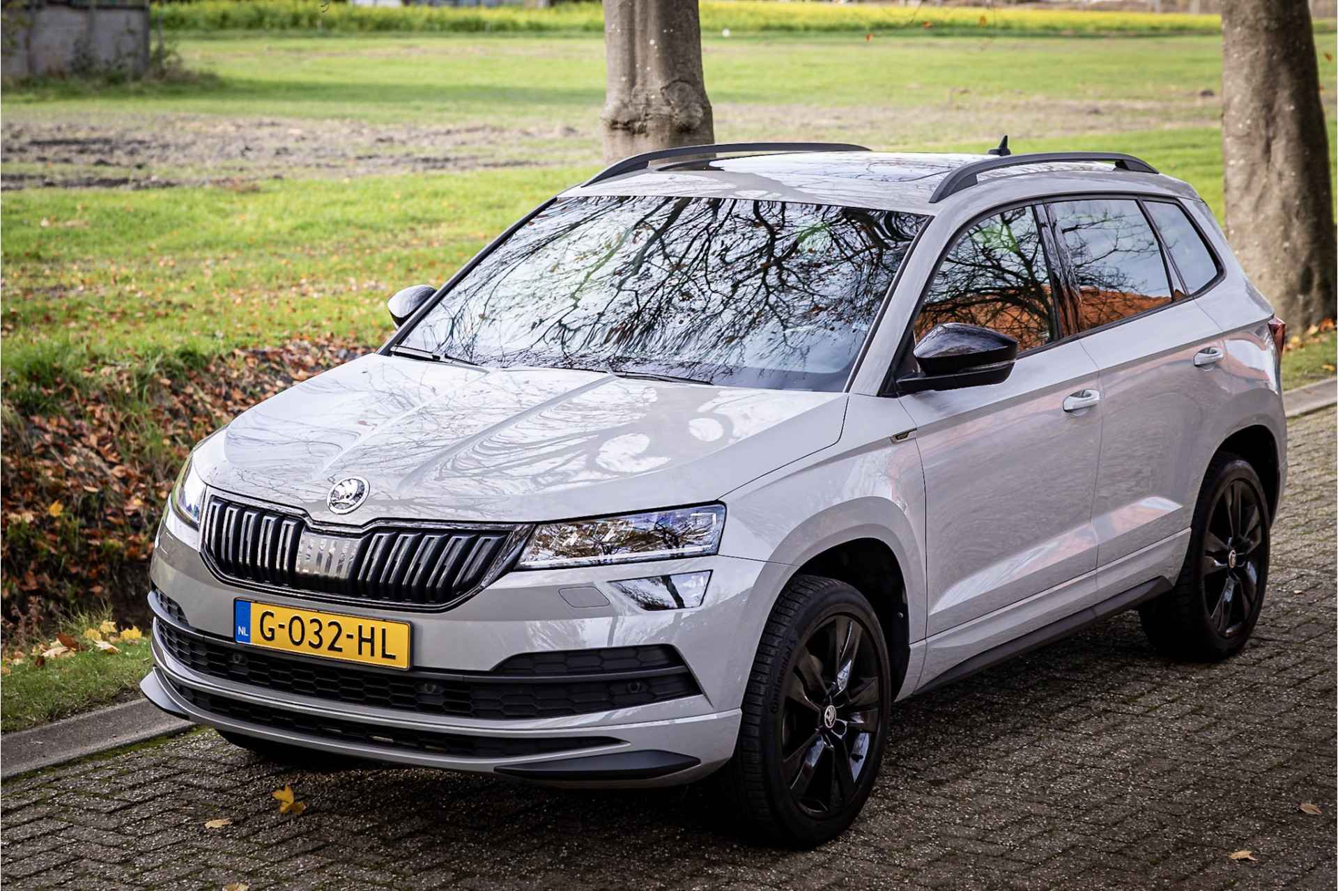 Fraaie Skoda Karoq in sportieve uitvoering en complete uitrusting. Lakkleur is Steel Grey en het interieur is voorzien van een combinatie van sportstoelen in antraciet Dynamic stof.