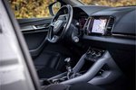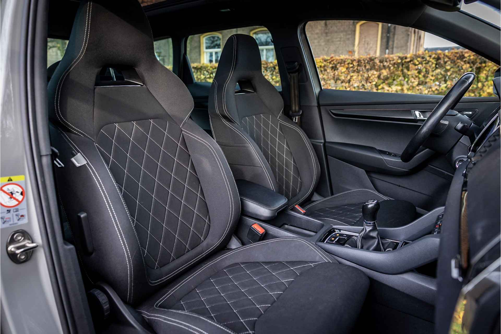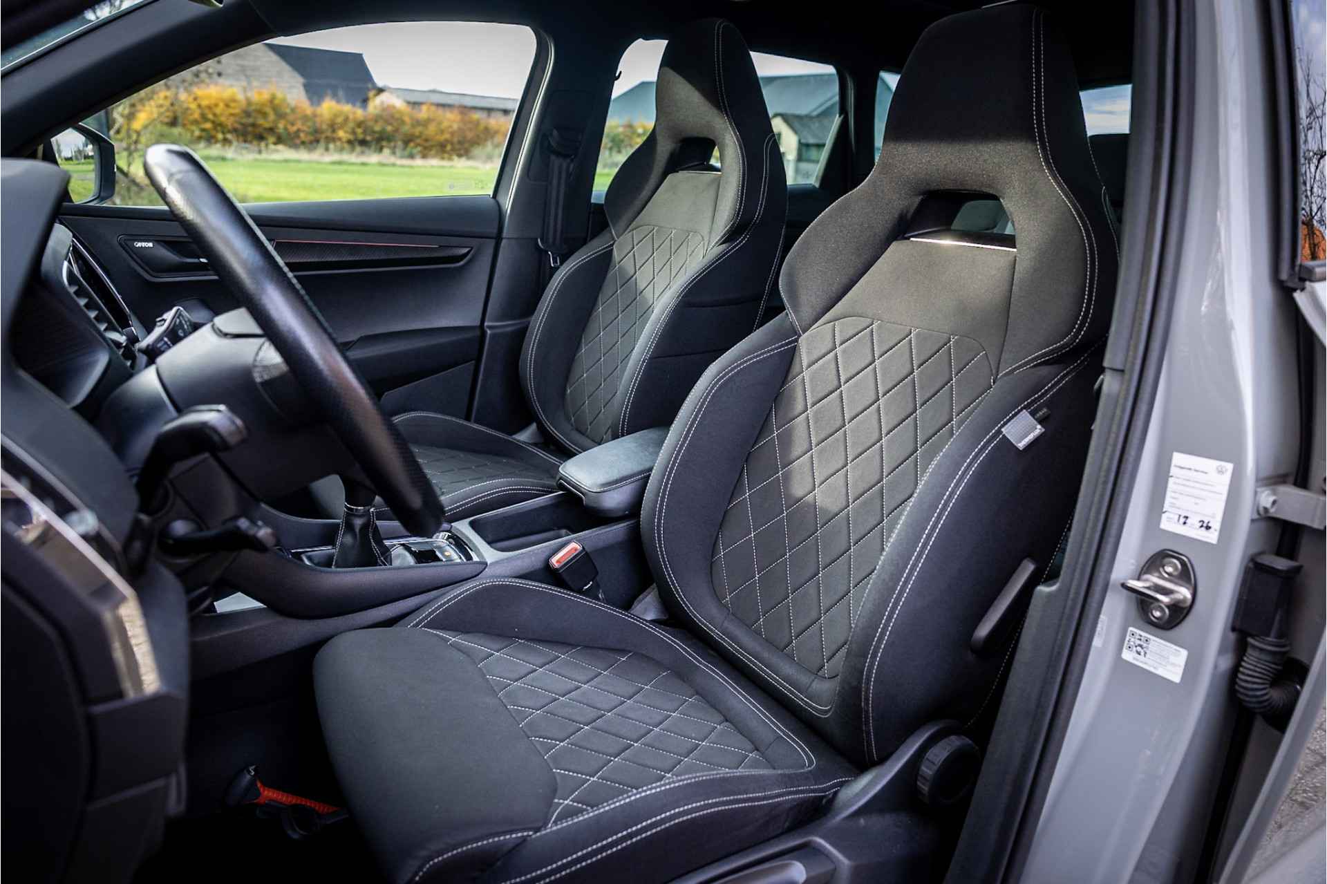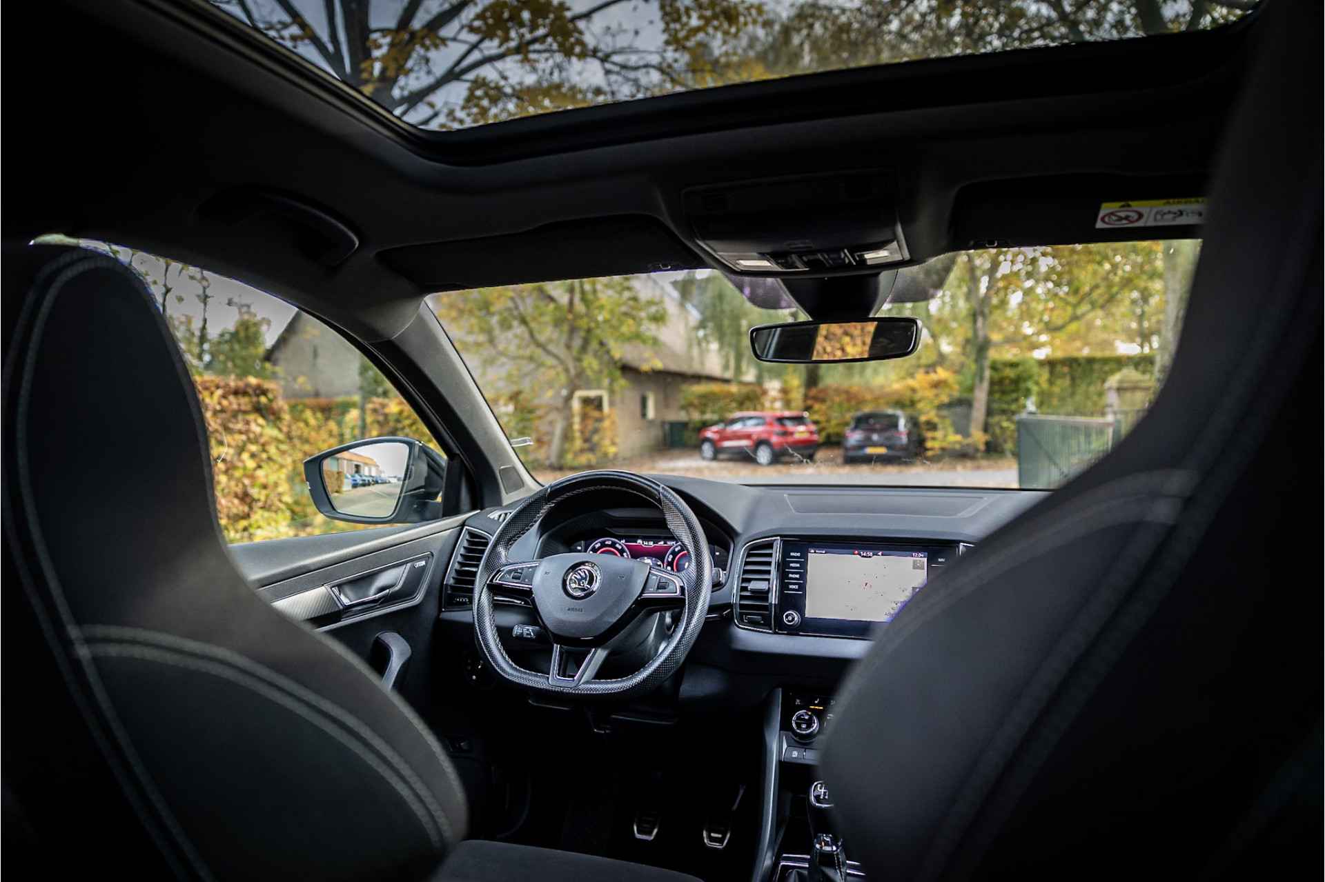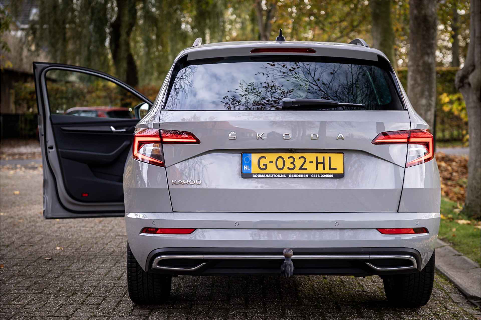 Fraaie Skoda Karoq in sportieve uitvoering en complete uitrusting. Lakkleur is Steel Grey en het interieur is voorzien van een combinatie van sportstoelen in antraciet Dynamic stof.
