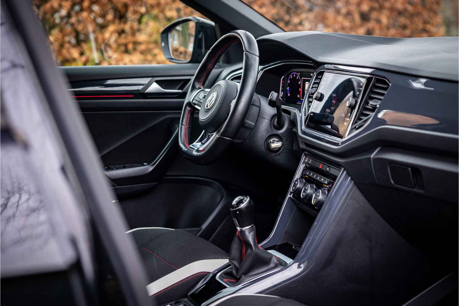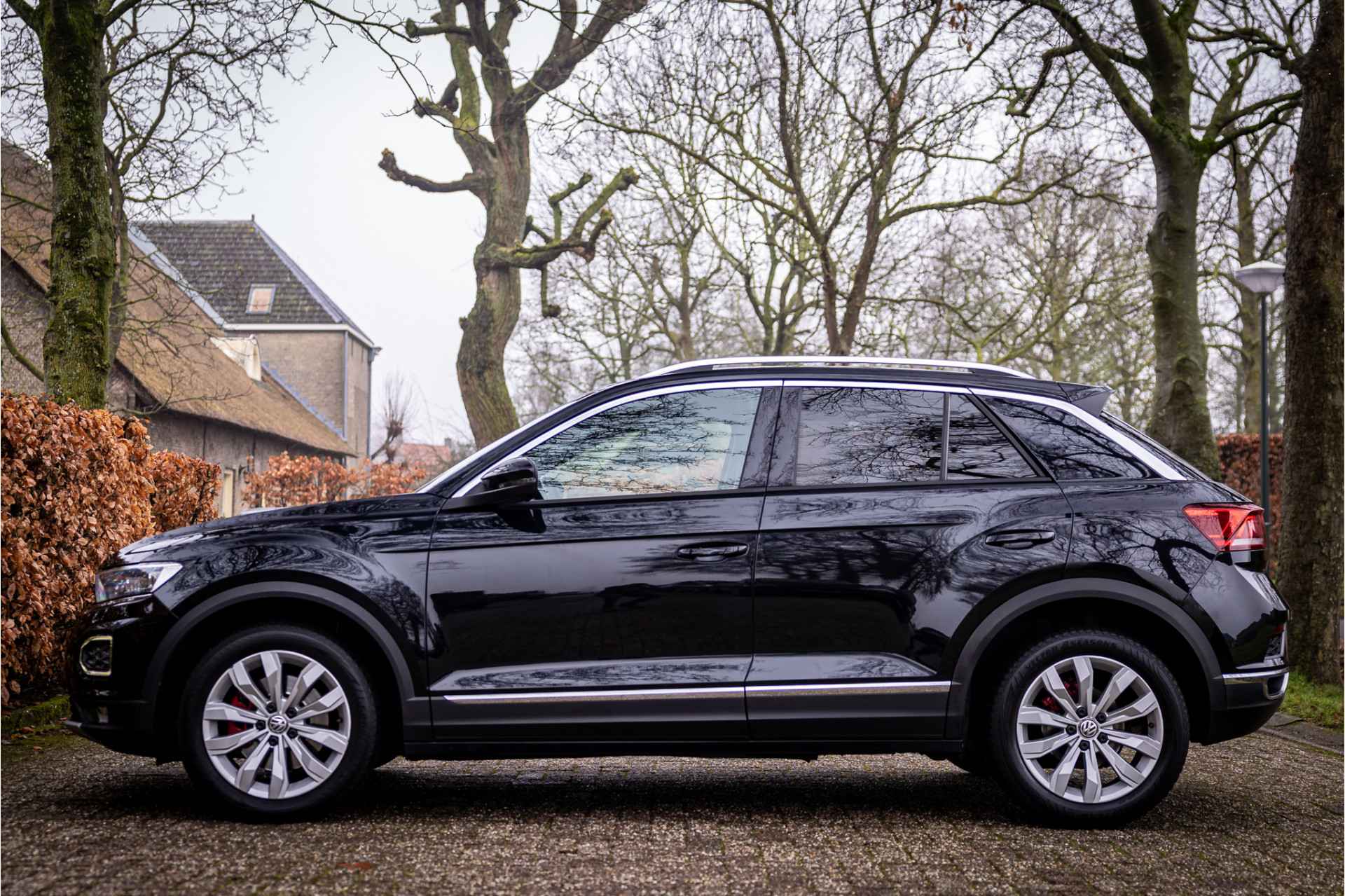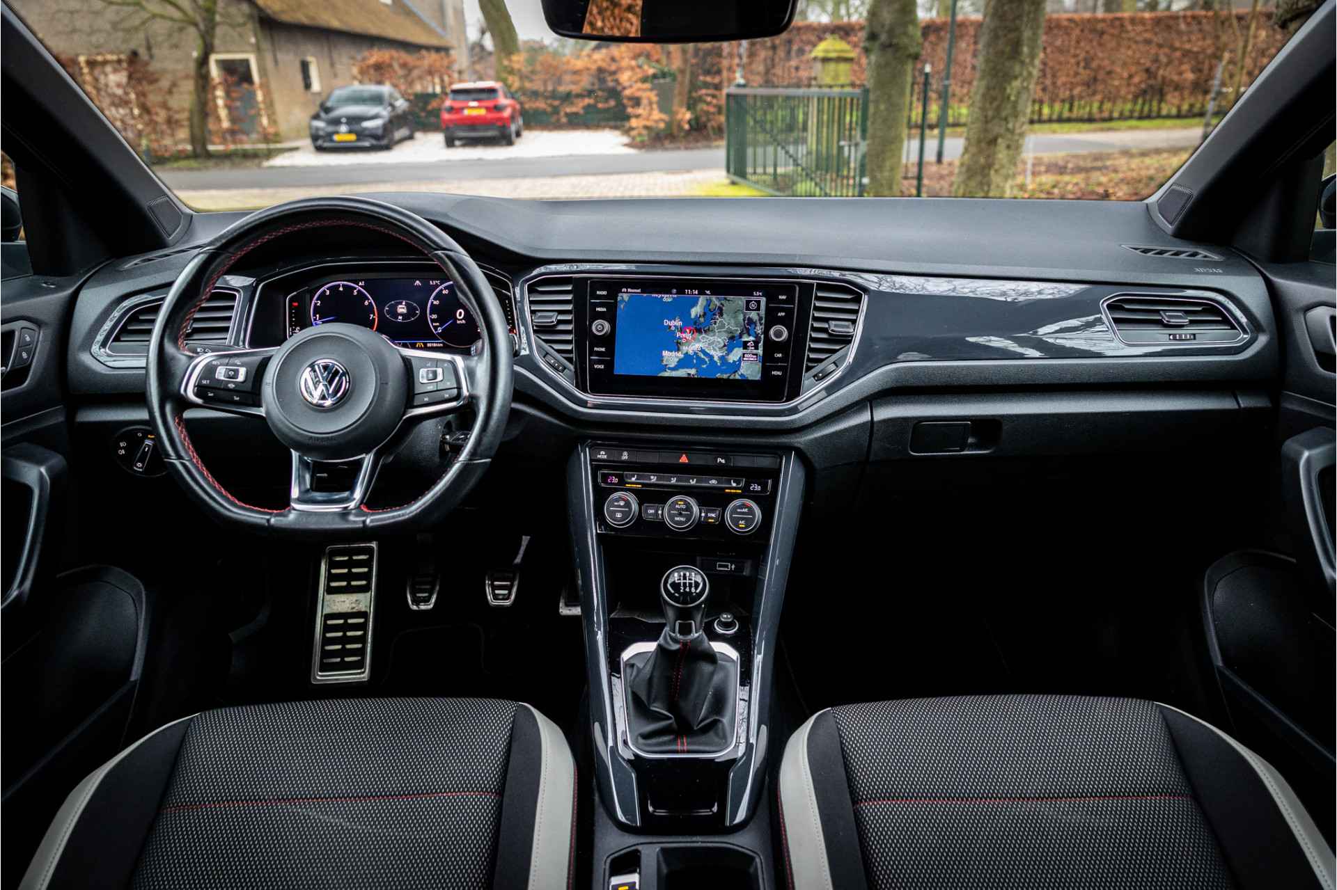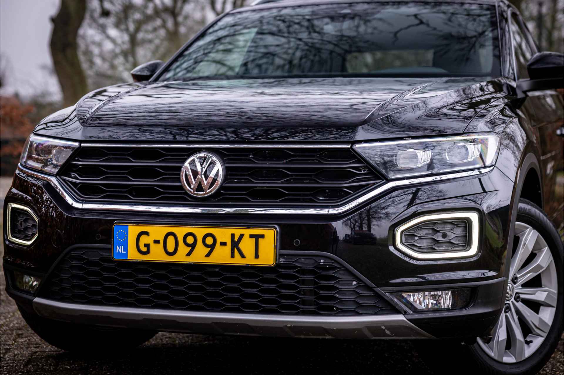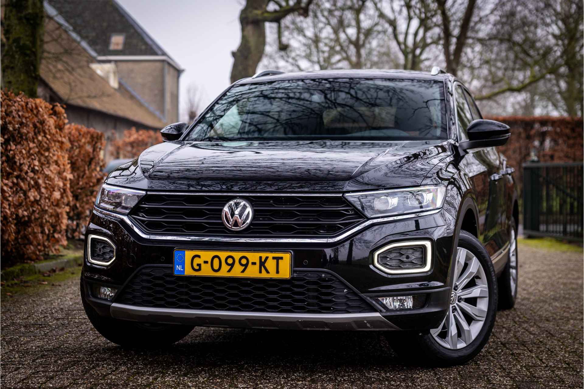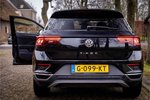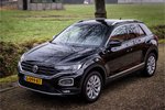 Fraaie Volkswagen T-Roc Sport in complete uitrusting met krachtige benzinemotor. Lakkleur is Deep Black Metallic en het interieur is voorzien van sportstoelen bekleed met zwart stof. De hemelbekleding is uitgevoerd in zwart stof.