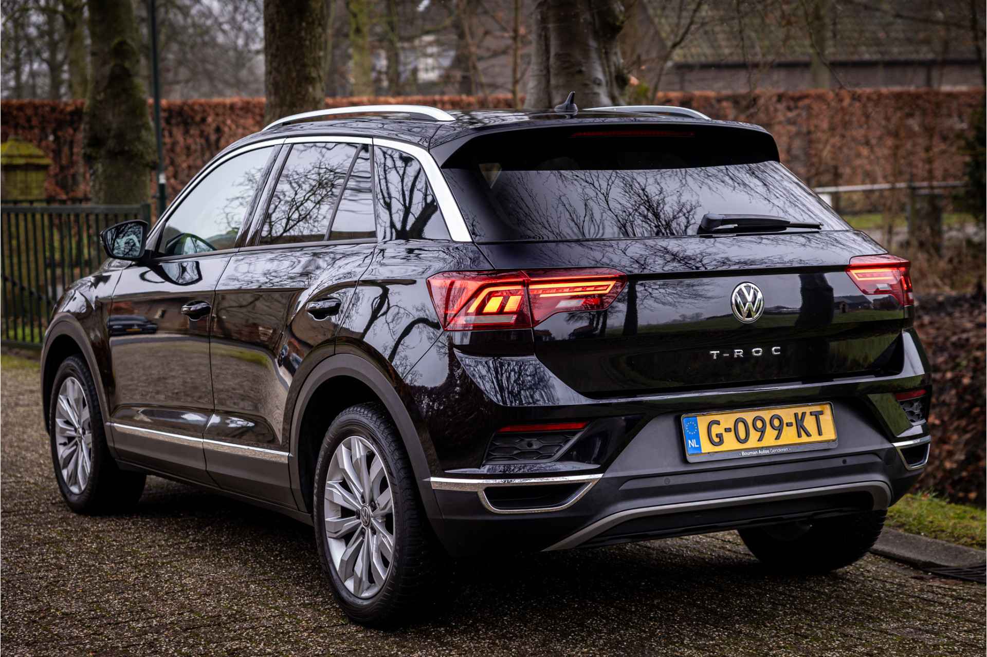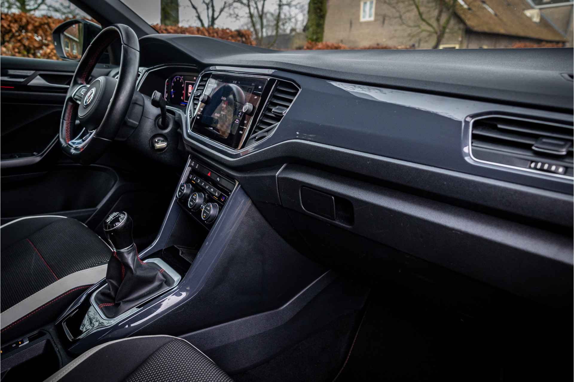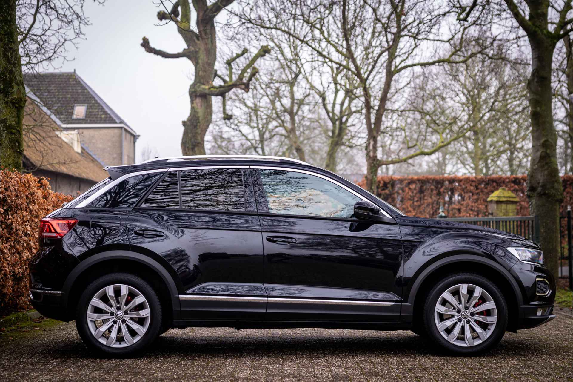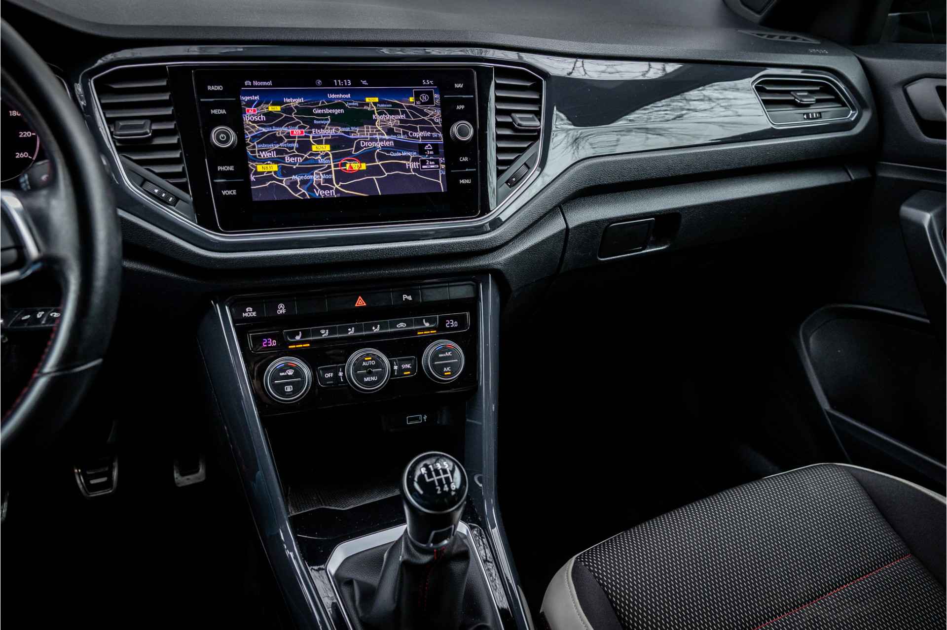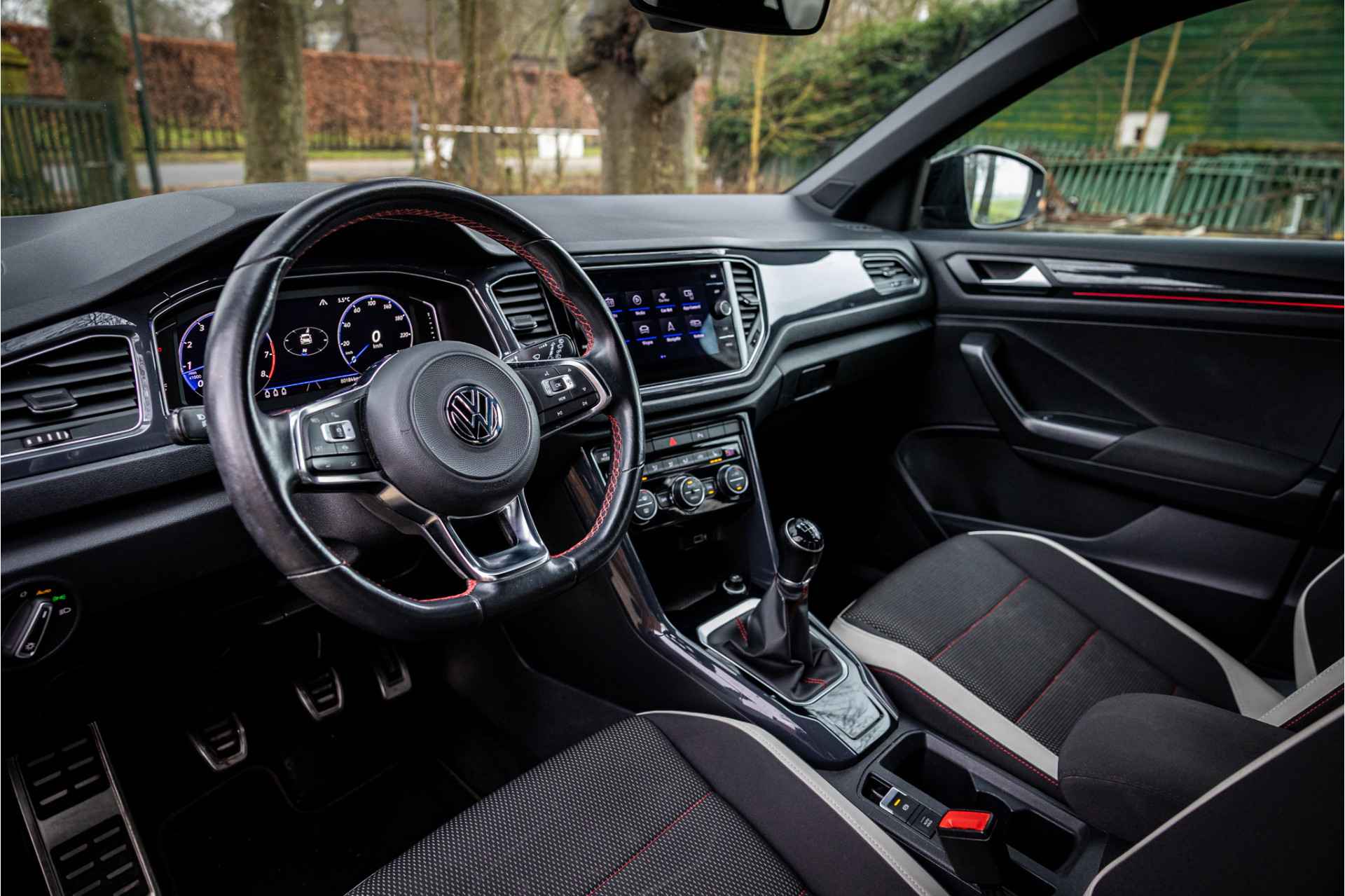 Fraaie Volkswagen T-Roc Sport in complete uitrusting met krachtige benzinemotor. Lakkleur is Deep Black Metallic en het interieur is voorzien van sportstoelen bekleed met zwart stof. De hemelbekleding is uitgevoerd in zwart stof.