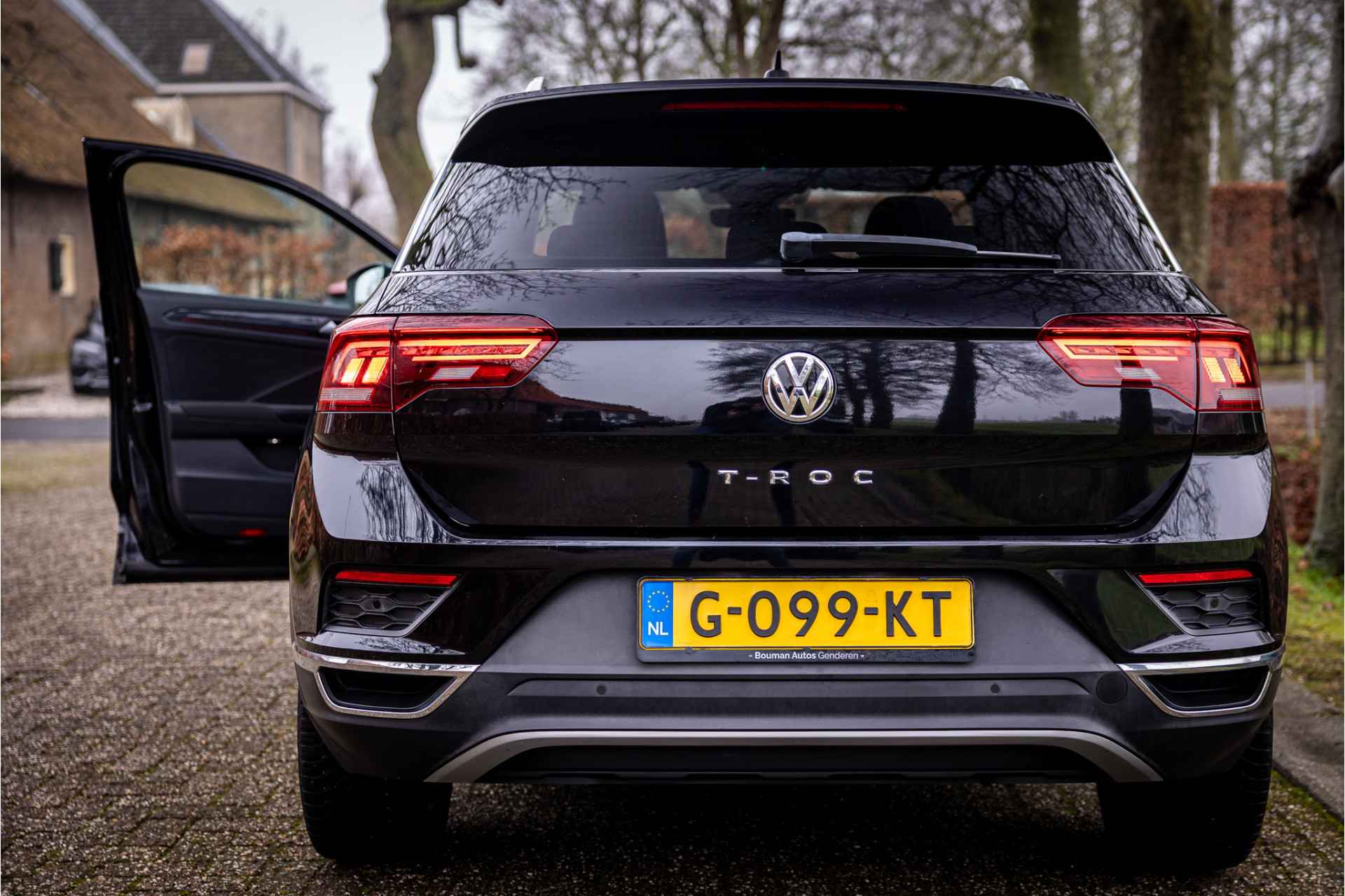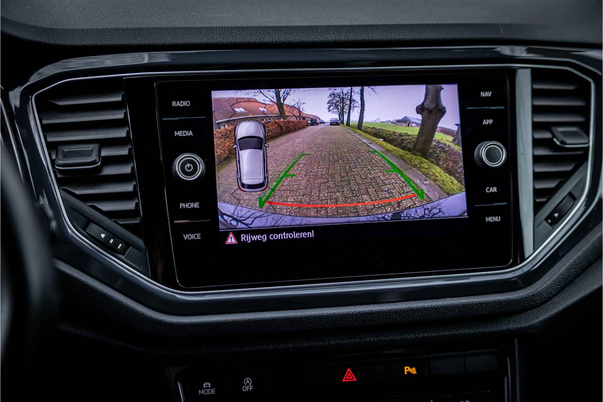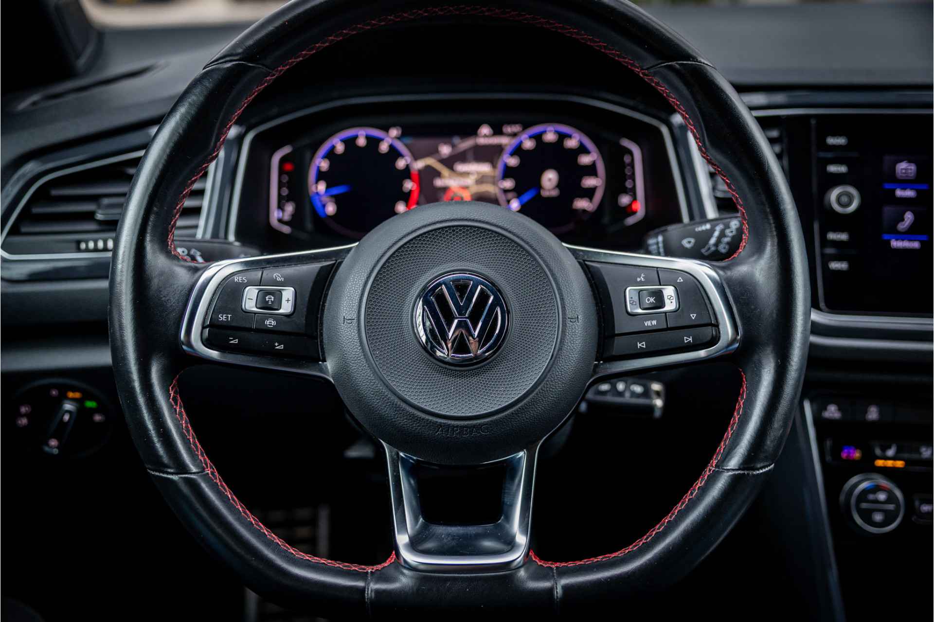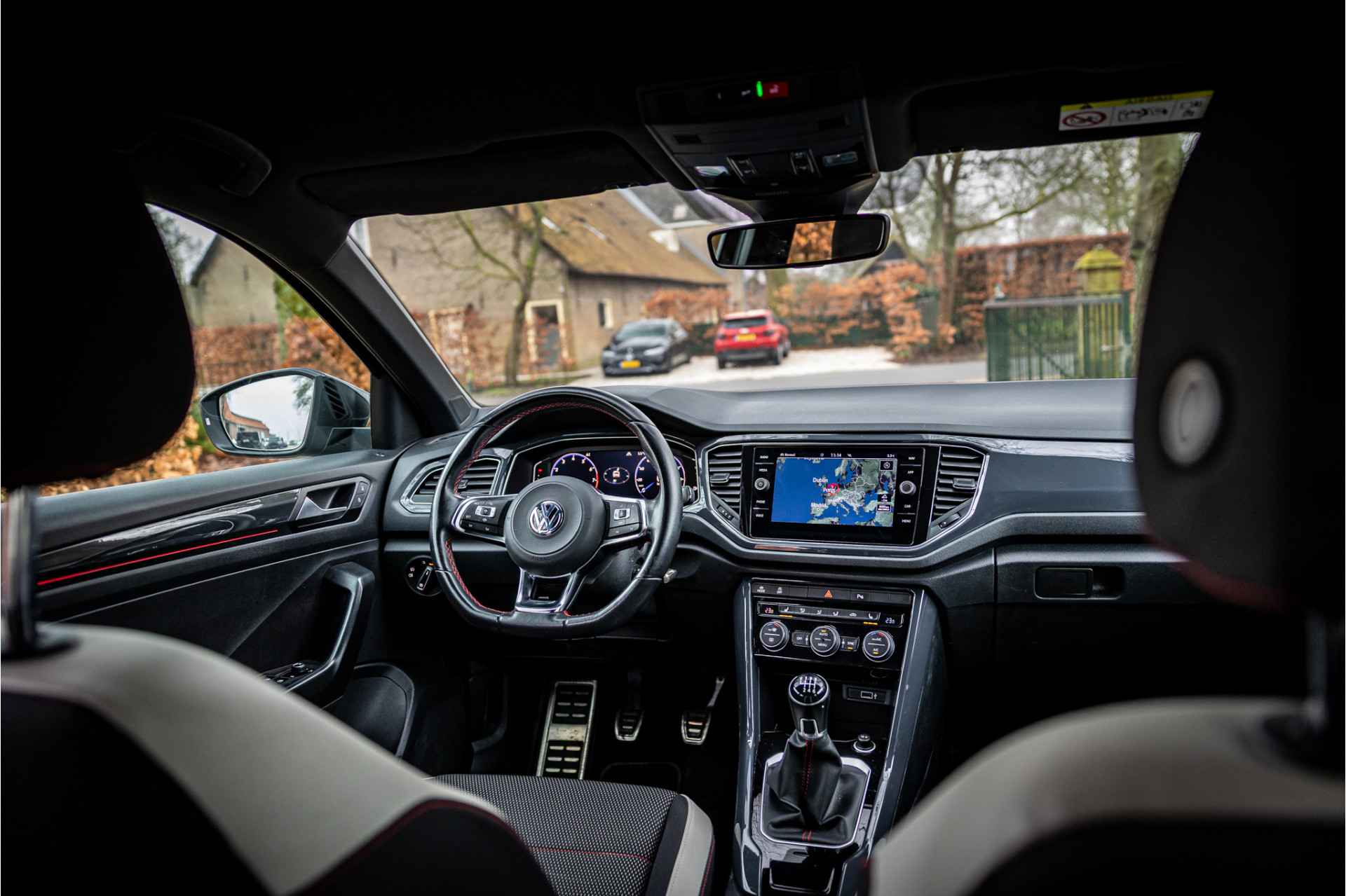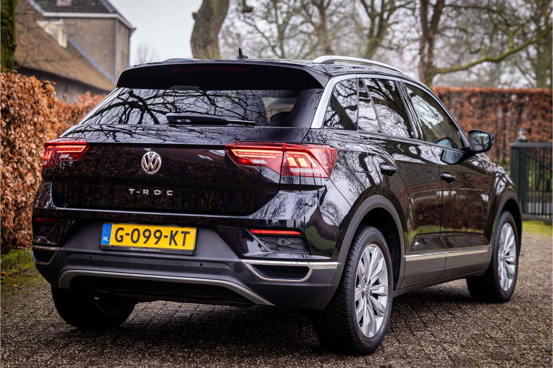 Fraaie Volkswagen T-Roc Sport in complete uitrusting met krachtige benzinemotor. Lakkleur is Deep Black Metallic en het interieur is voorzien van sportstoelen bekleed met zwart stof. De hemelbekleding is uitgevoerd in zwart stof.