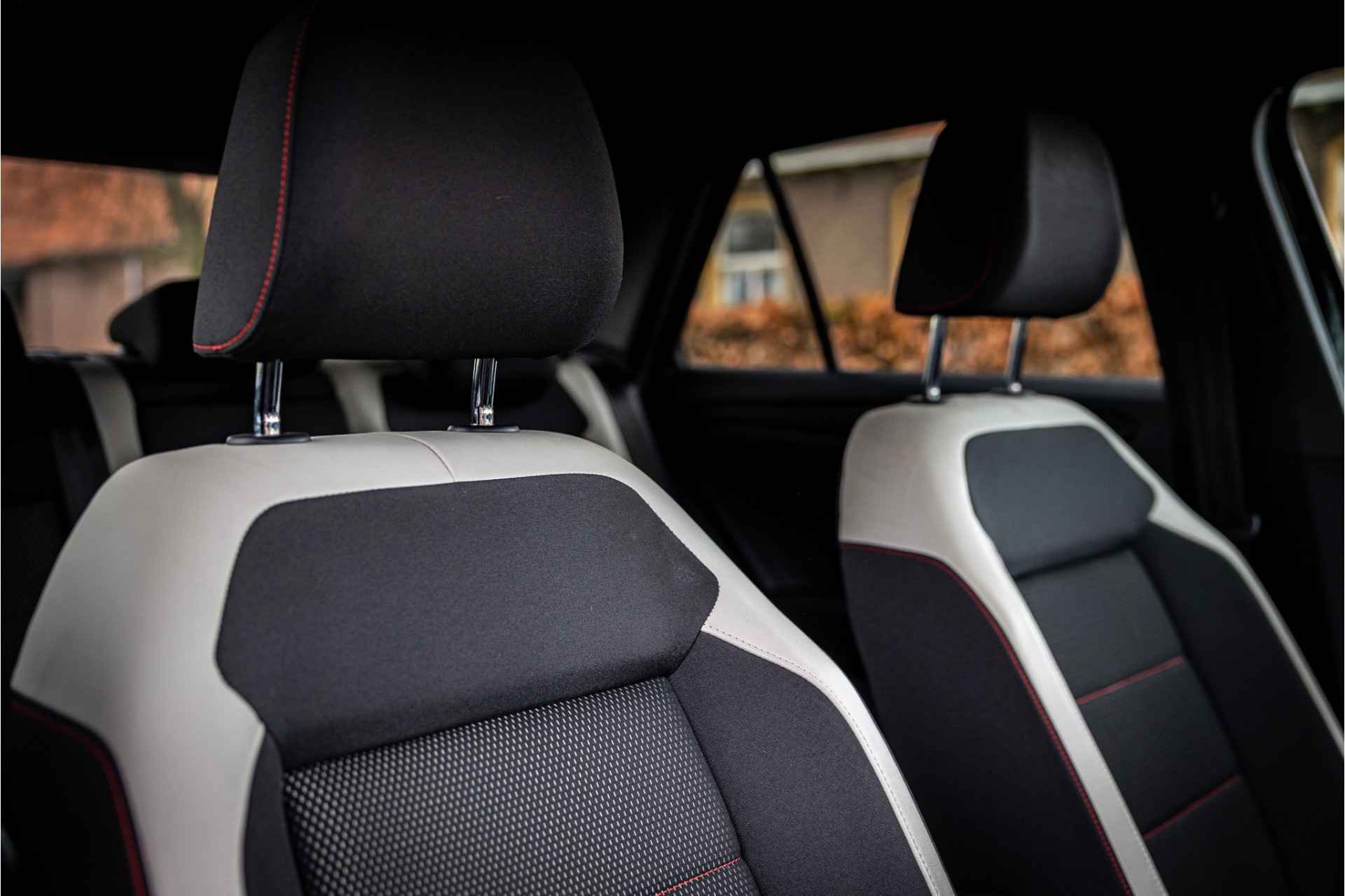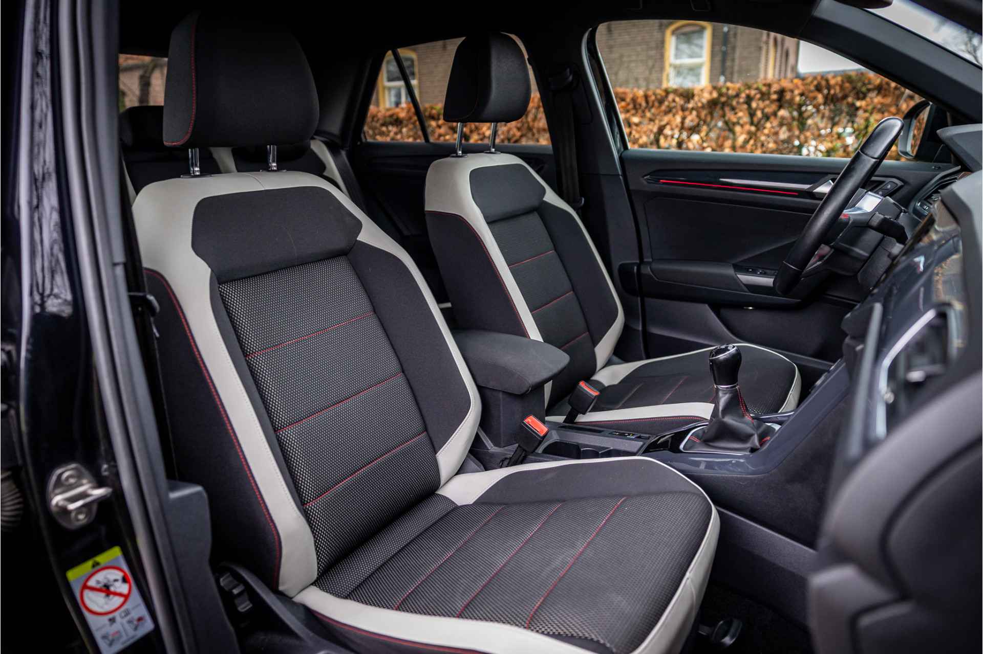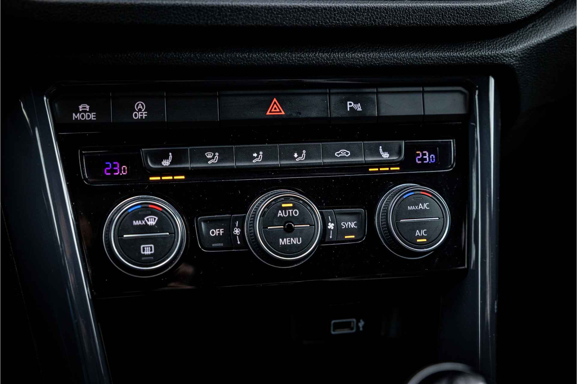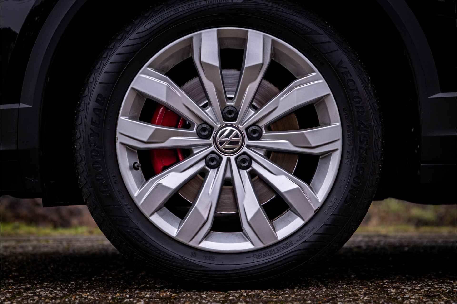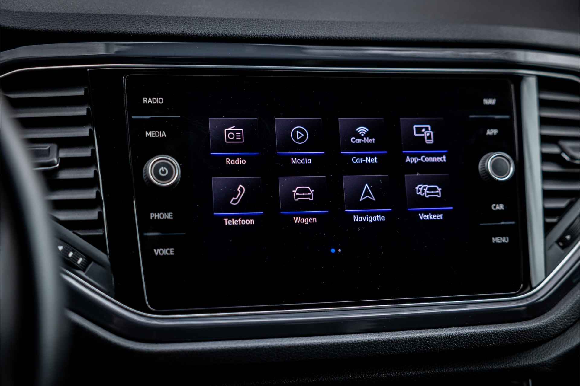 Fraaie Volkswagen T-Roc Sport in complete uitrusting met krachtige benzinemotor. Lakkleur is Deep Black Metallic en het interieur is voorzien van sportstoelen bekleed met zwart stof. De hemelbekleding is uitgevoerd in zwart stof.